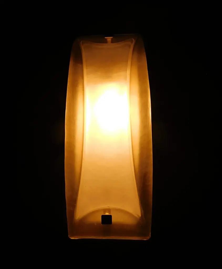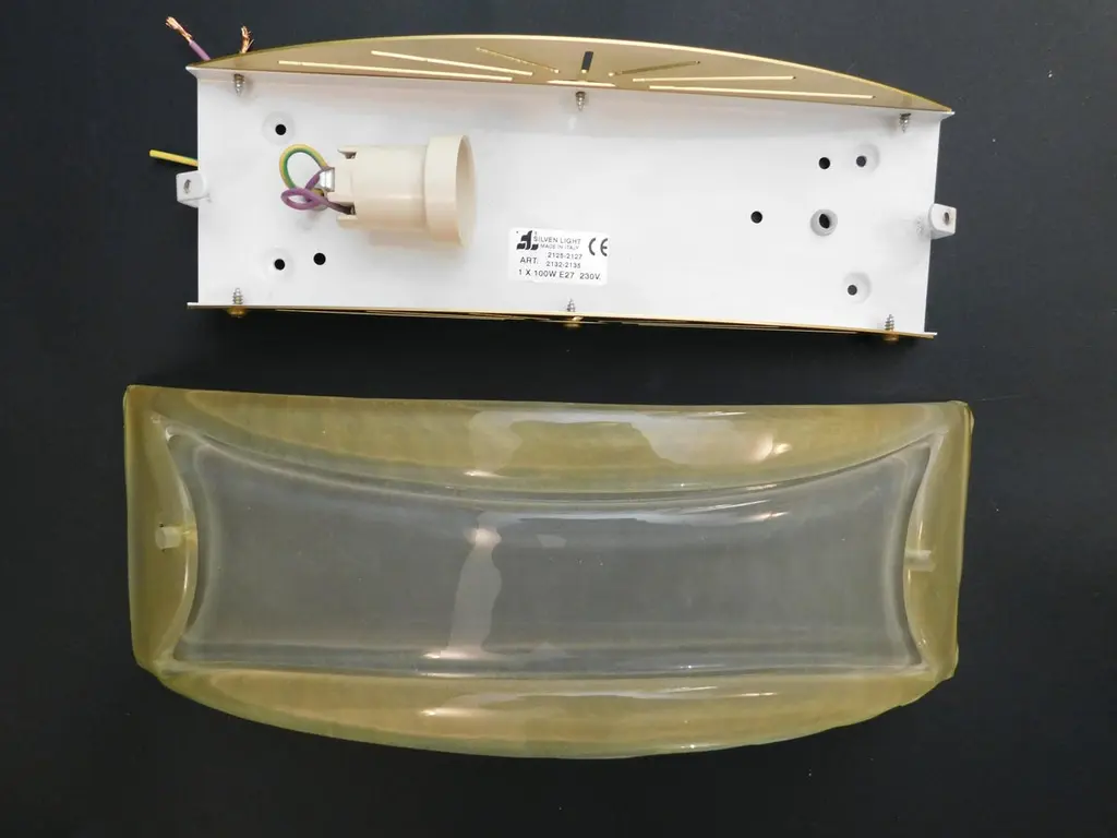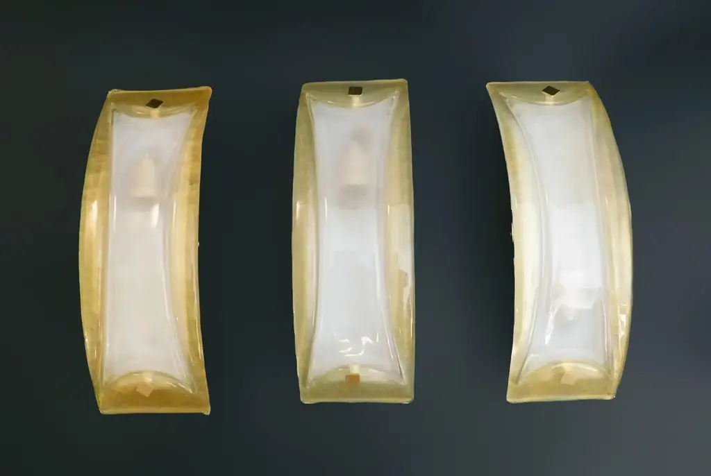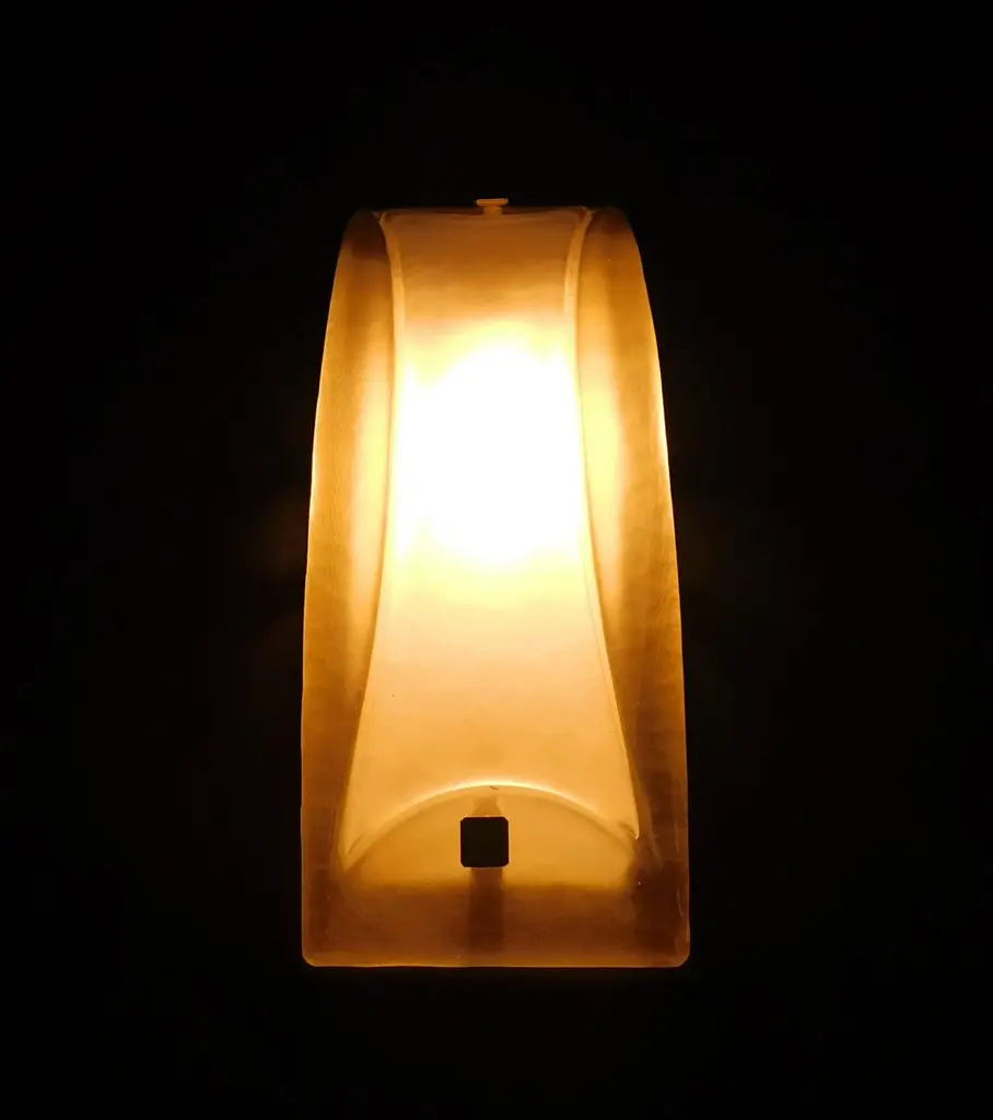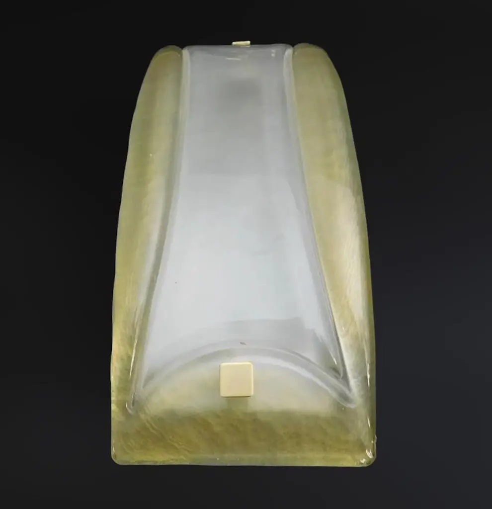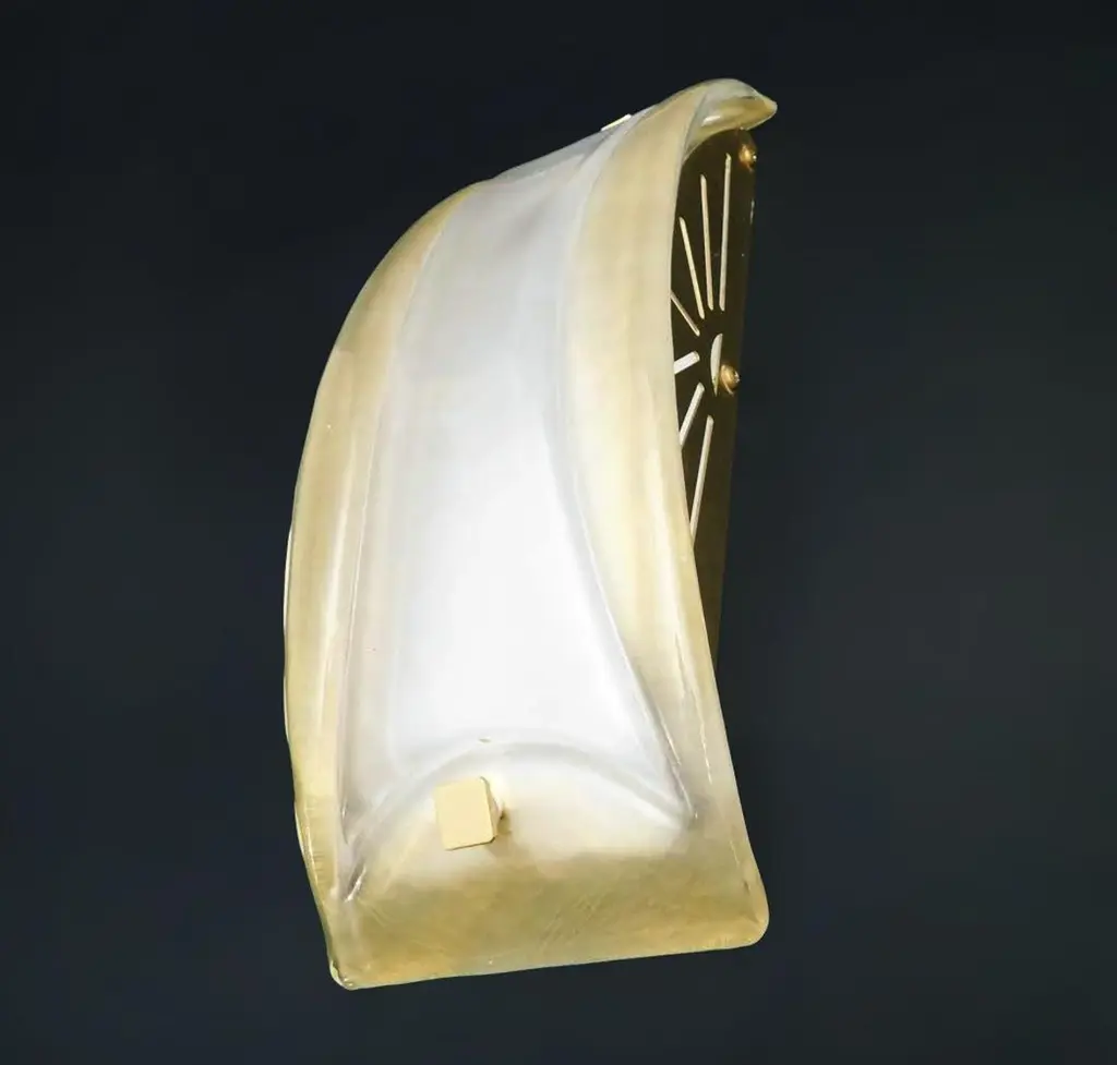 Vintage Italian wall light with frosted and amber Murano glass shade mounted on golden bracket with white back plate / made in Italy circa 1990sMeasures: height 14 inches, width 5 inches, depth 2.5 inches1 light / E26 or E27 type / max 60W3 available in stock in Italy, price listed is for each itemOrder reference #: FABIOLTD K78