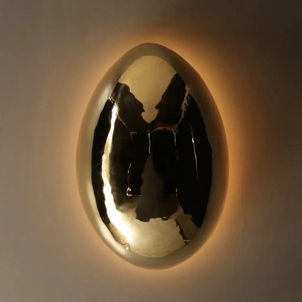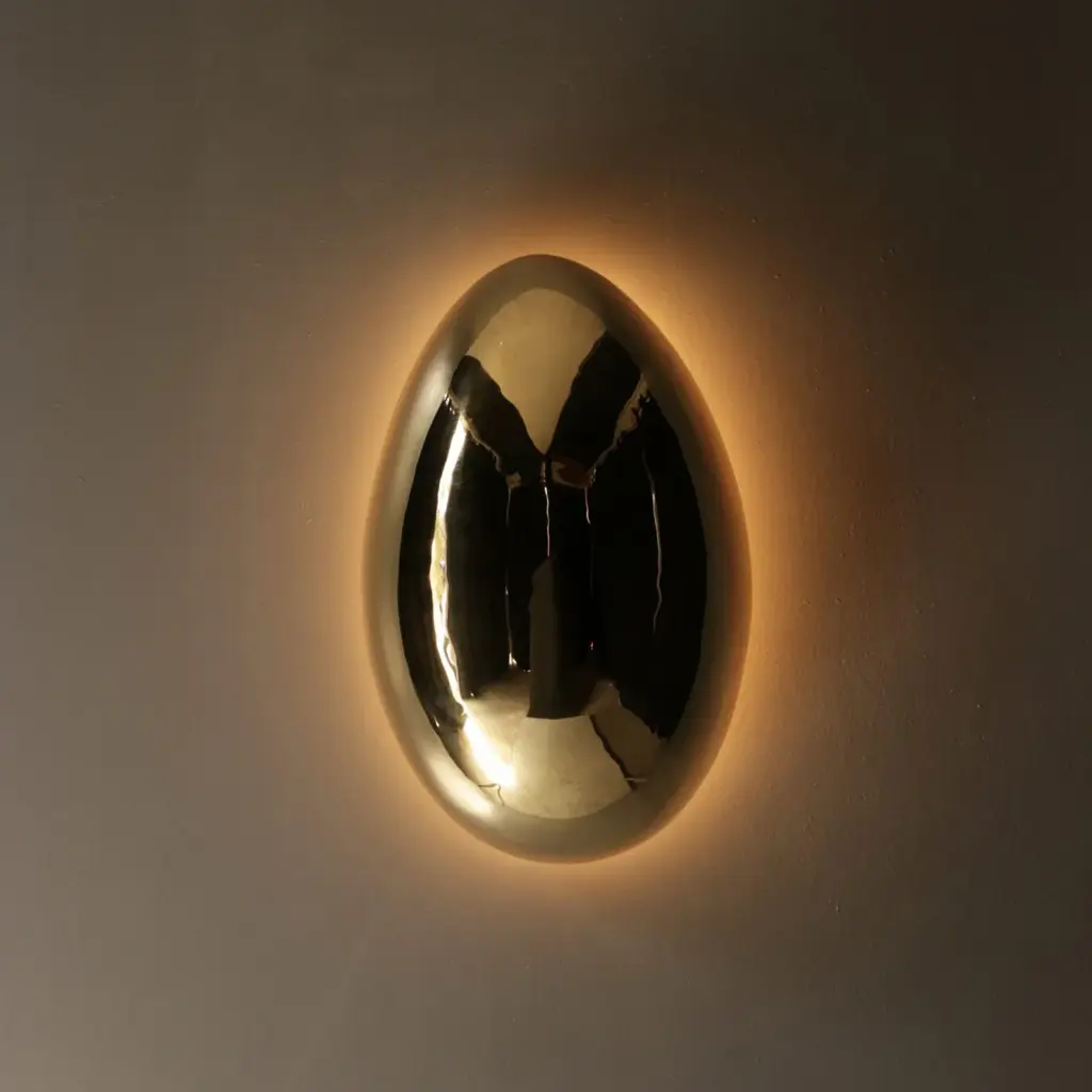 Indulge in the luxurious glow of the Golden Egg Wall Sconce from Popham Design. Handcrafted by artisans in Marrakech, these brass eggs come in three sizes and add a soft, ambient light to any space. Hang solo or in a group to create an exclusive atmosphere. Each egg is a unique masterpiece, making them one-of-a-kind additions to your home. Highlights