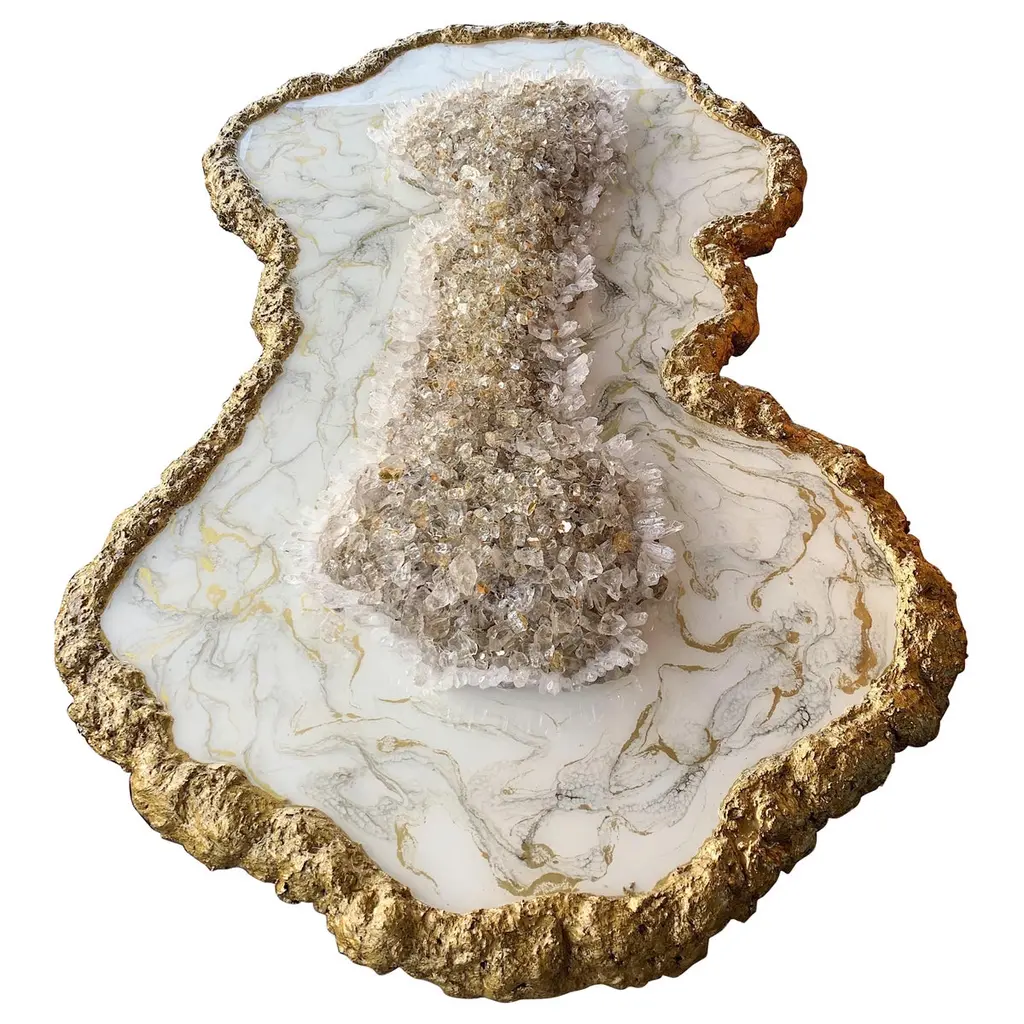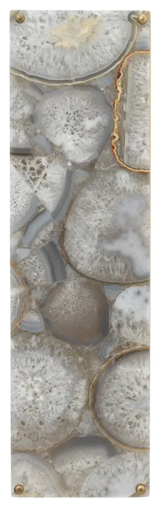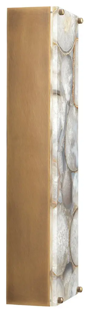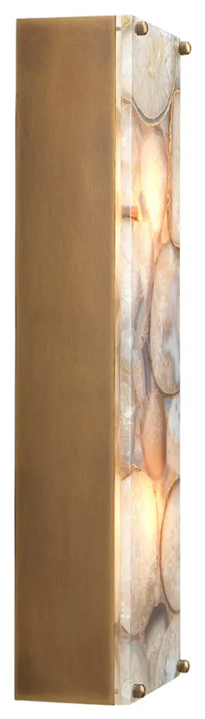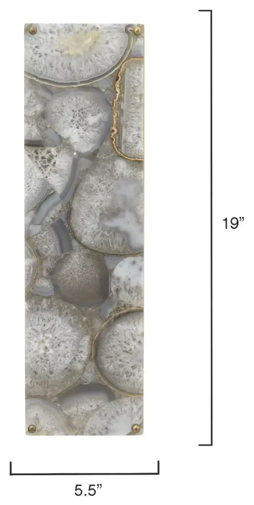 A collage of natural agate stone is joined together with clear resin and antique brass. This natural sculpture creates different colors and patterns within each piece, making it a truly one-of-a-kind piece in your home and on your wall. Also available in a square shape, and in a brass framed design.• 19" x 5.5" x 3.75" deep. Weighs 11 lbs.• Hand Finished Natural Agate with Premium Resin & Steel• UL Listed. Uses 2 max 40W each Type B Candelabra bulbs (not included). Hard wired.• Heirloom Quality - Expertly hand crafted and hand finished. Due to the hand crafted nature of this piece, each piece may have subtle differences.