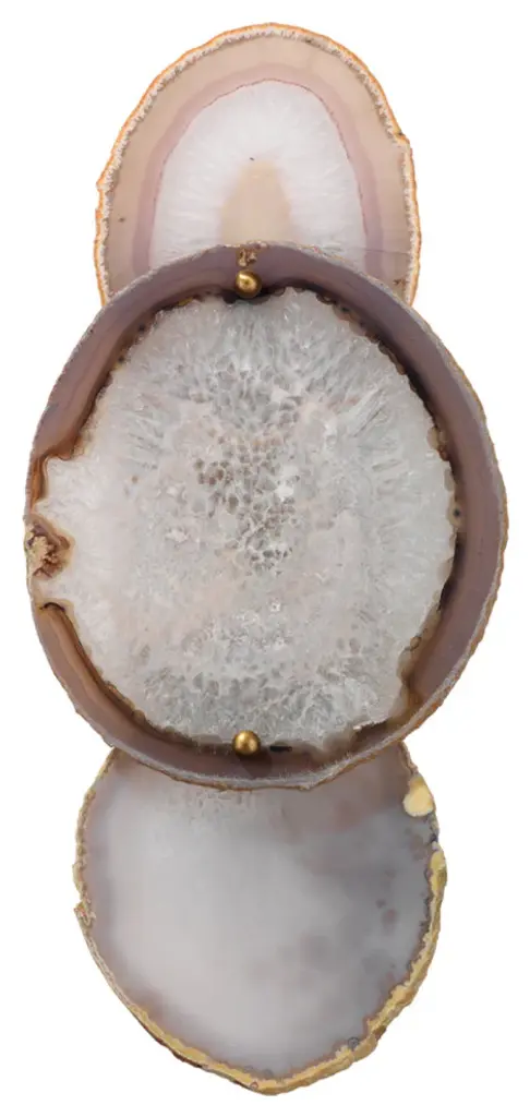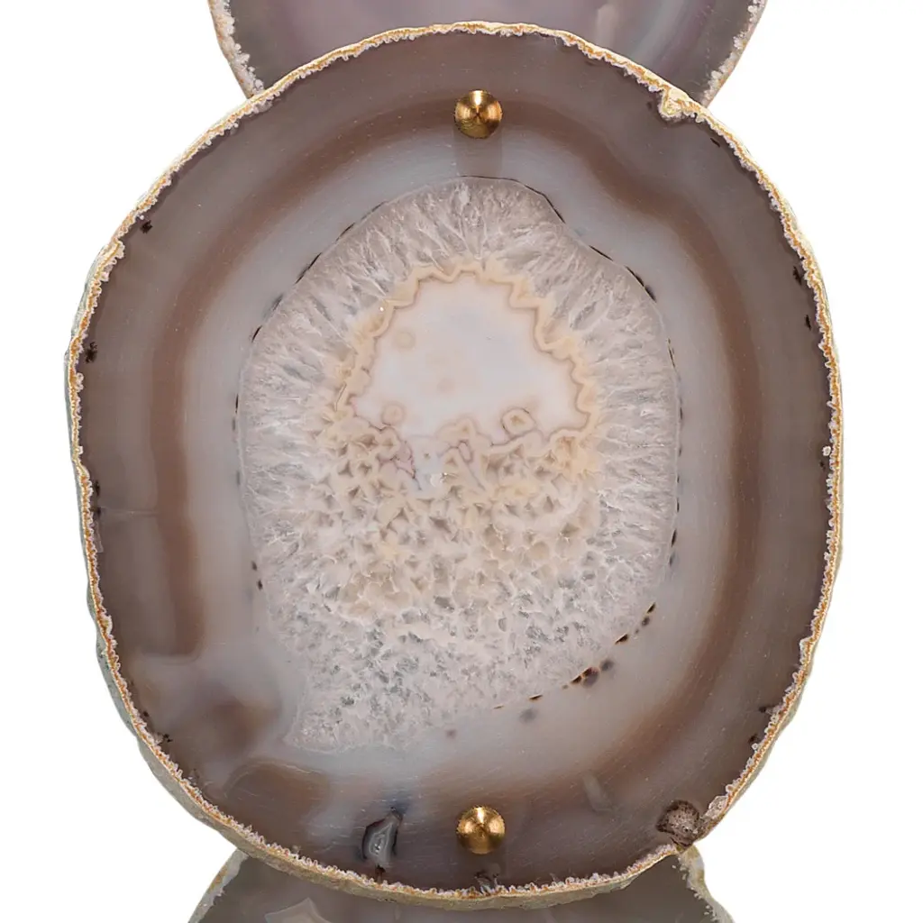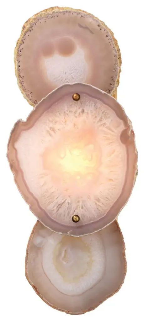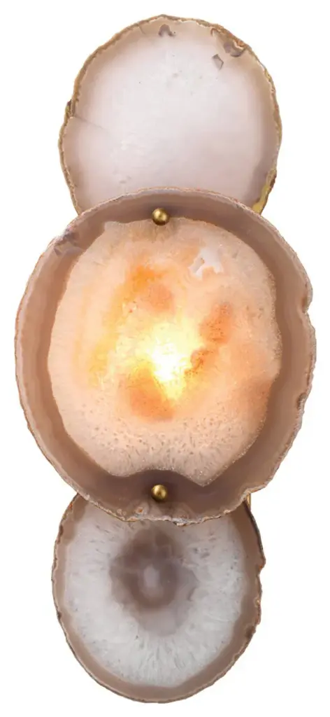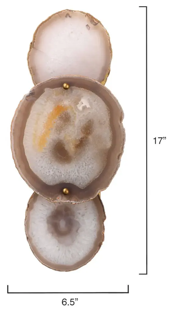 Three unique slices of natural agate stone are individually arranged to create extraordinary pieces of art. Embrace this wall sconce''s individuality and you will have a truly one-of-a-kind piece on your wall. This fixture is functional for wall-mounted and ceiling flush-mounted installation. Made of natural agate stone. Each stone is unique, colors will vary and no two will be identical. Each agate piece will vary in size - size will vary 1"-2" per agate pc.• 17"H x 6.5"W x 4" deep. Weighs 5.5 lbs.• Hand Finished Natural Agate with Steel• UL Listed. Uses 2 max 40 watt Type B Candelabra bulbs (not included). Hardwired.• Heirloom Quality - Expertly hand crafted and hand finished. Due to the hand crafted nature of this piece, each piece may have subtle differences.