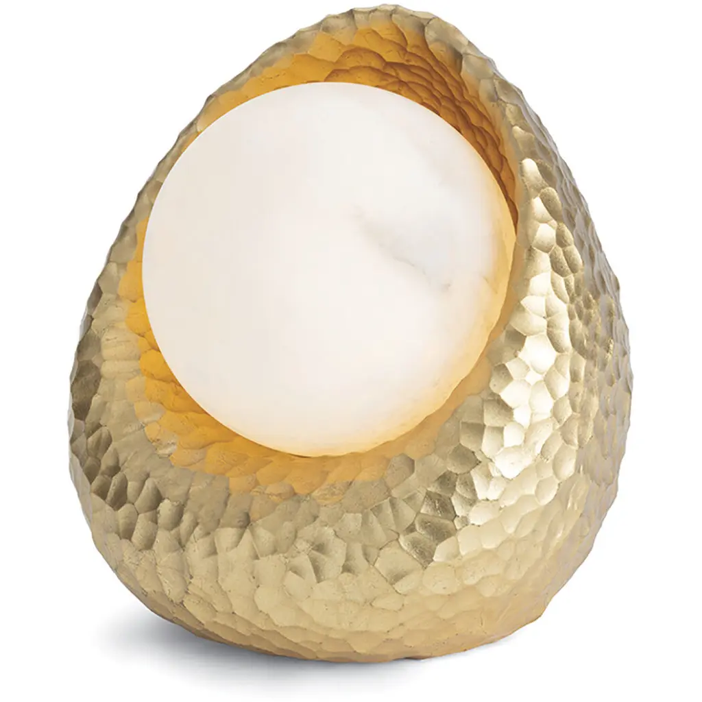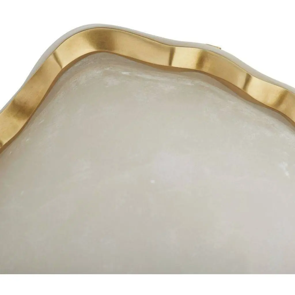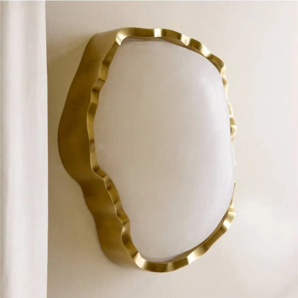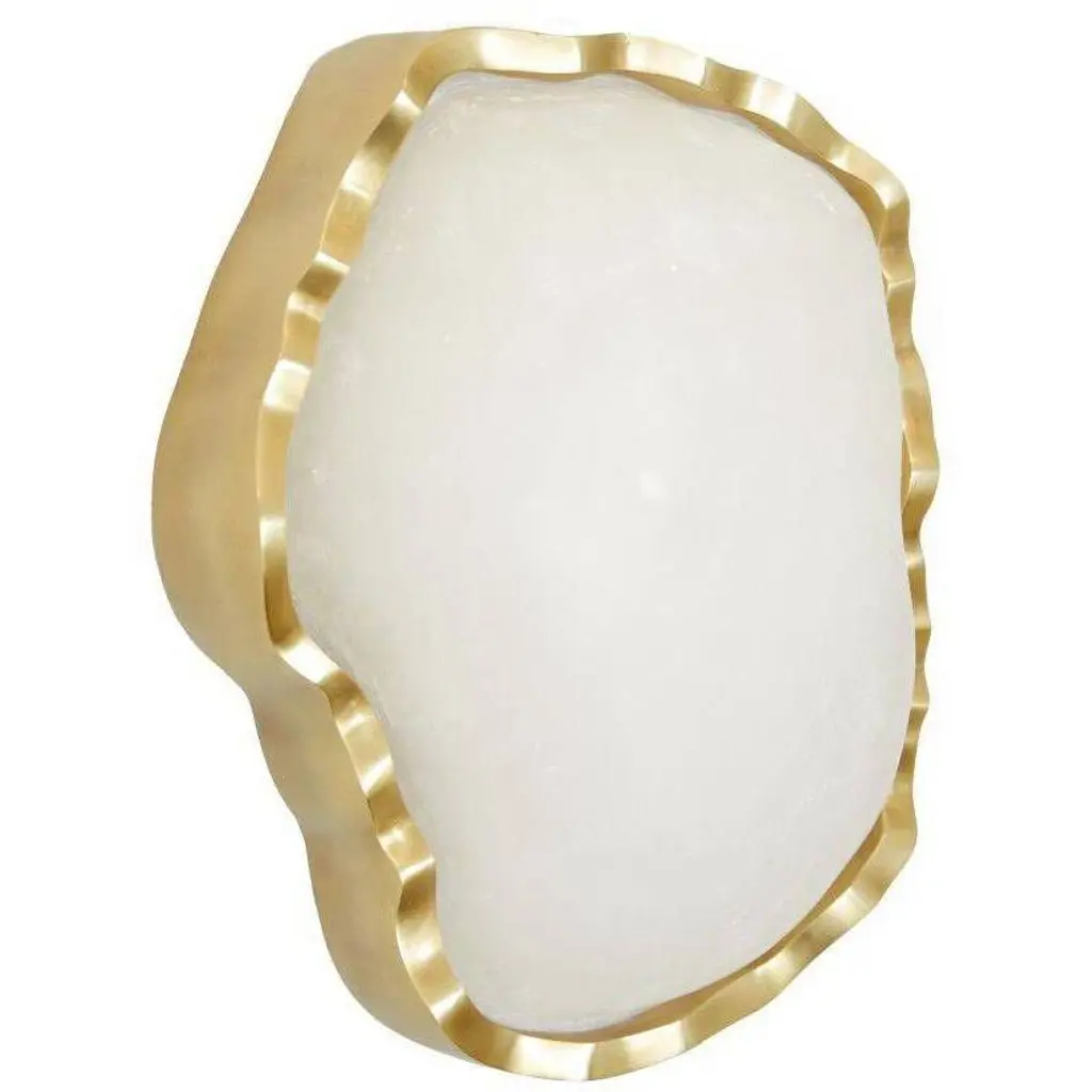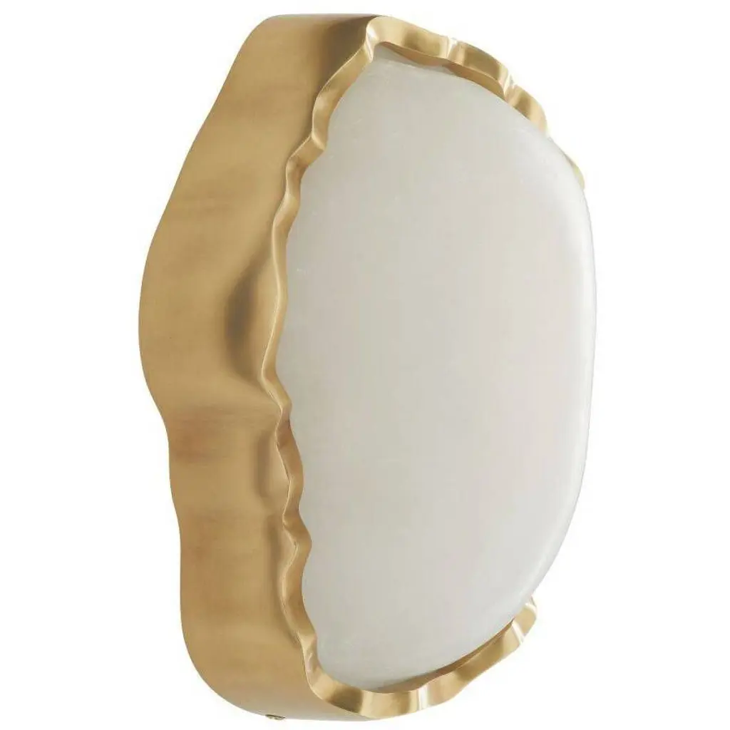 Like a shaped and polished cabochon, a freeform fixture of white alabaster is clasped in a setting of antique brass. Recalling a precious gem, this integrated LED fixture makes a stylish accent when paired or installed in multiples along a hallway. Damp-rated, although limited covered outdoor areas may affect finish. Finish will vary.
