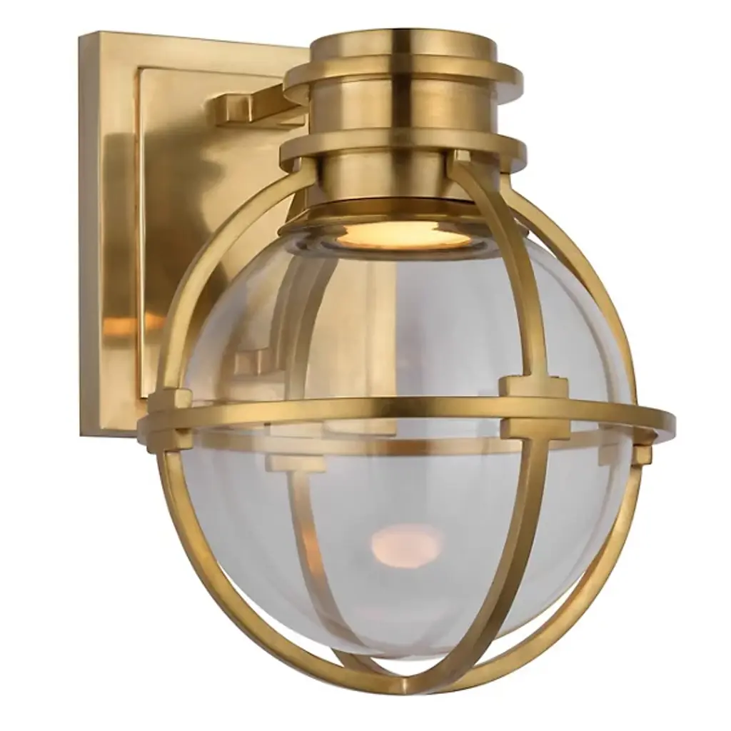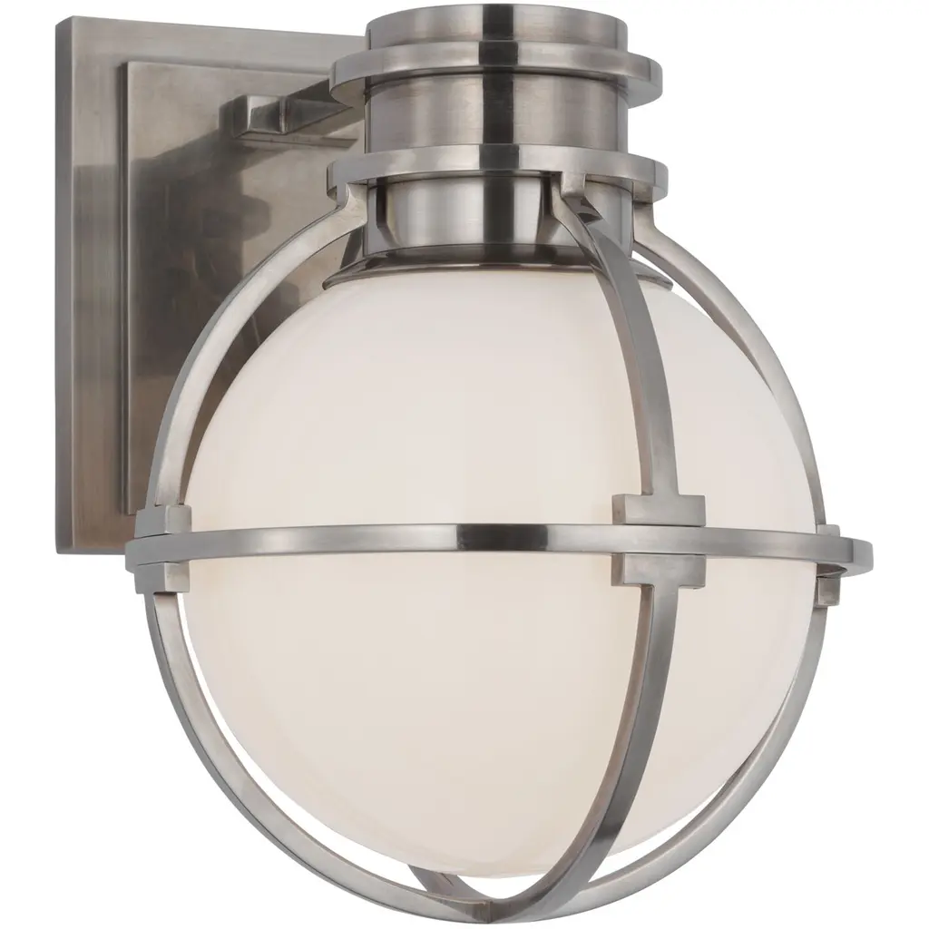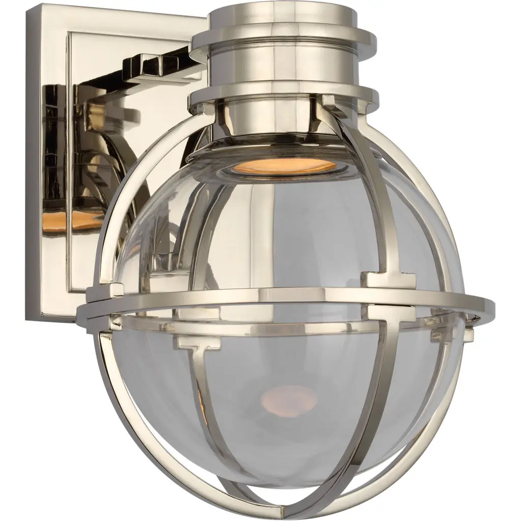 Sophisticated modern design with wondrous results. The Gracie Wall Sconce from Visual Comfort Signature, formerly known as Visual Comfort, pulls in the curious eye as a sculptural globe featuring an ultra-low-key light source. This modern piece carries a regal personality into the home. A low-profile square backplate gives the sconce a place in tight nooks or across an open wall. It mesmerizes with repeating metal shapes. The globe framework presents sleek, slender arms that stand out in silhouette. A glass globe nestles inside for a crisp, reflective element. The sconce’s lamping sits concealed up top, further enhancing the globe silhouette. The light beams into the glass and diffuses outward for an aura of ambient illumination.