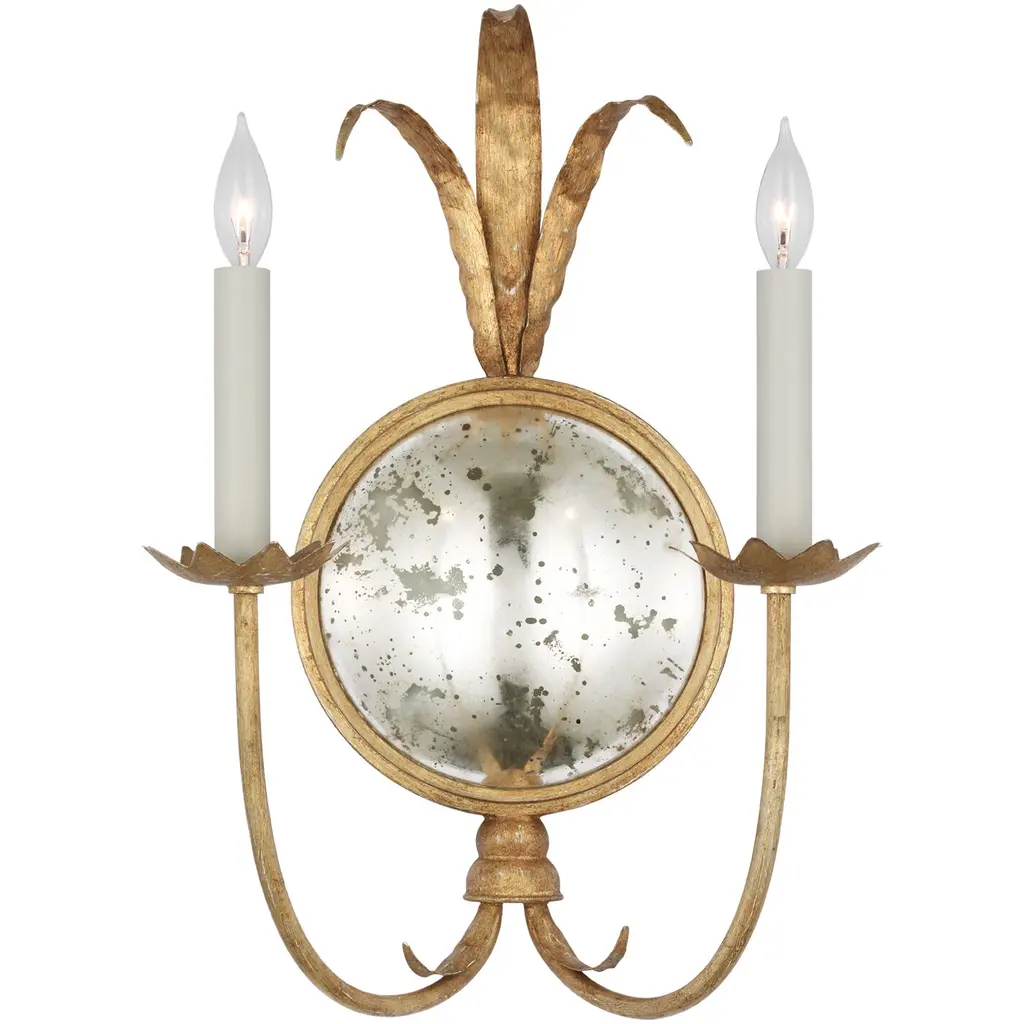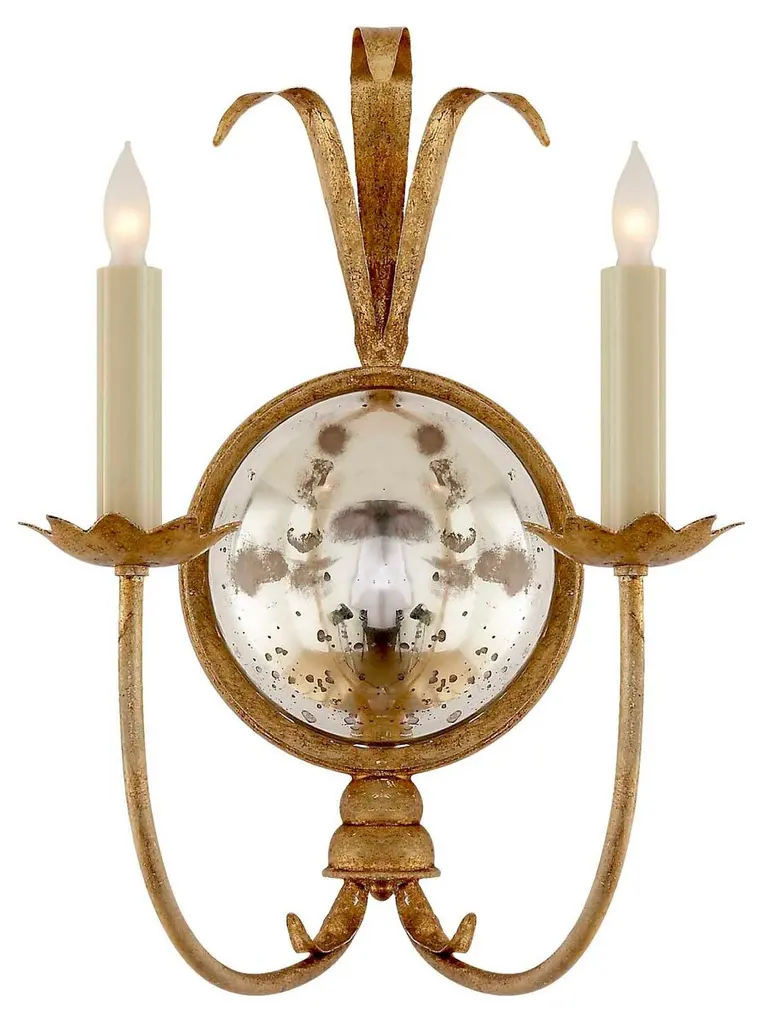Exuding elegance and sophistication, the Gramercy Double Wall Sconce from Visual Comfort Signature presents a delicate yet distinctive design that adds a touch of glamour to formal spaces. Each piece showcases hand-sculpted wheat leaf detailing and a gleaming, hand-applied, antiqued mirror sphere, embodying a blend of unique materials. With slender curved arms holding candle-inspired lights, the refined silhouettes of Gramercy Double Wall Sconce redefine modern luxury with its iconic allure.