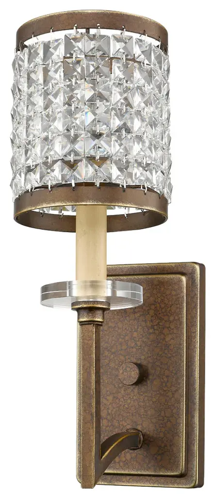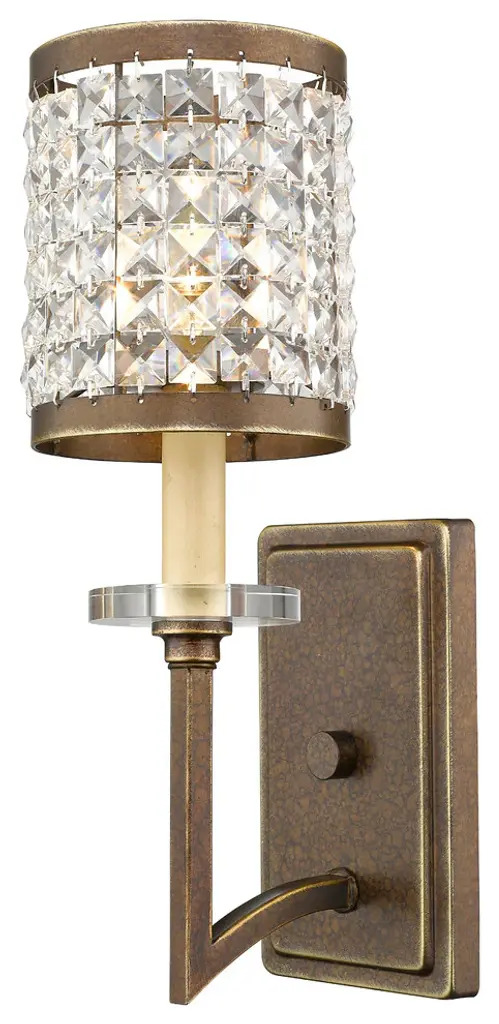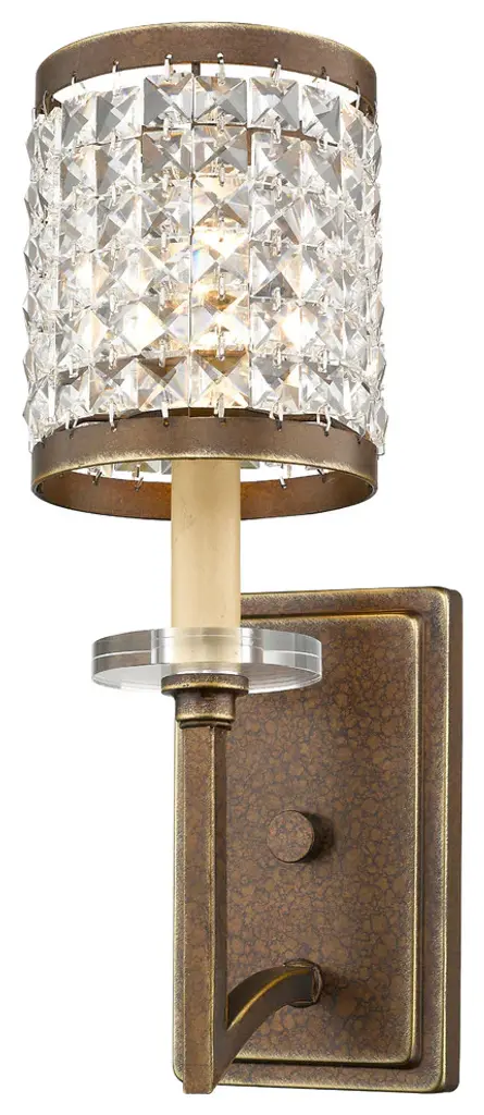 Crystal strands strung in a decrotive shade design define this classically glamorous wall sconce in which the bulbs are completely shaded, allowing the light to shine through the K9 crystal for a warm, intimate lighting feel.Glass Type/Shade Type: Clear Crystals Finish: Hand Painted Palacial BronzeMaterial: SteelNumber of Bulbs: 1Bulb Base Type: Candelabra BaseMax Wattage: 60Backplate Size: 4.5" W x 7.5" HExtension: 6.5"Suitable for Dry Locations? YesSuitable for Damp Locations? YesSuitable for Wet Locations? NoADA Compliant? No