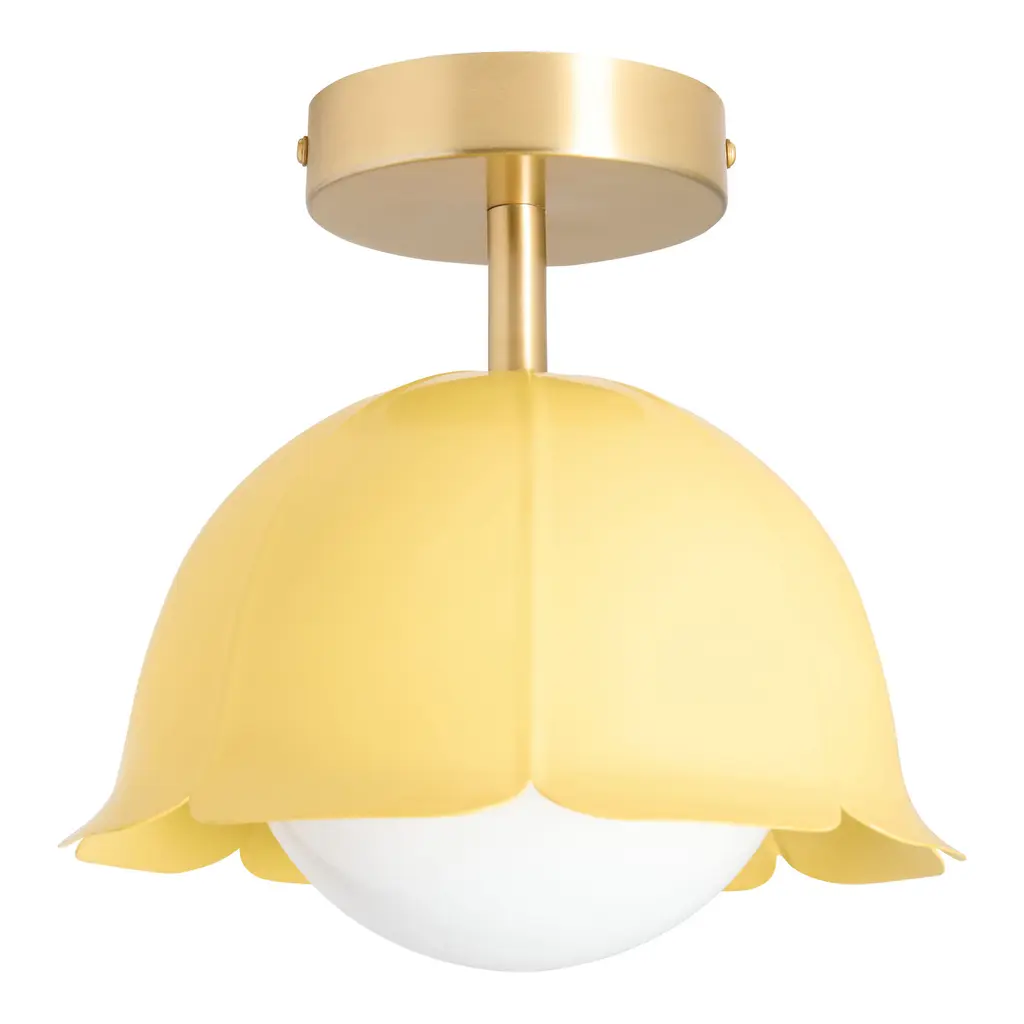 This refreshing collection features the nostalgic detailing of scalloped metal shades with gold leaf interiors. The hand-applied gold-leaf interiors reflect the light source within the shades casting a warmer glow downwards. The collection is offered in charming chain-hung pendants, a flush mount with Opal White schoolhouse glass, or oversized sconces.