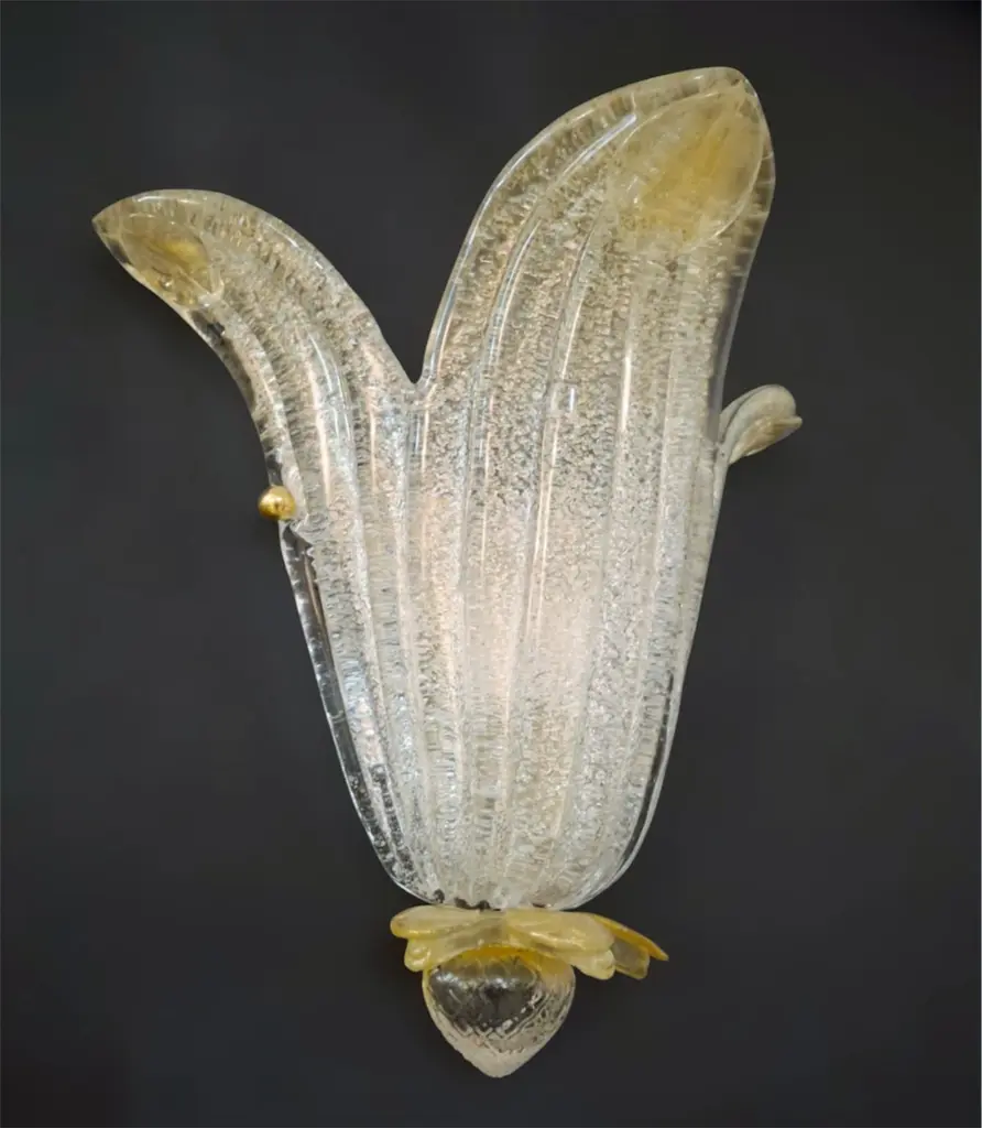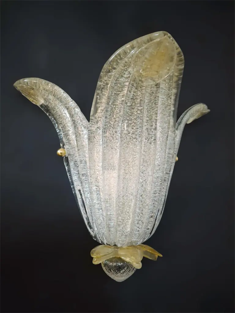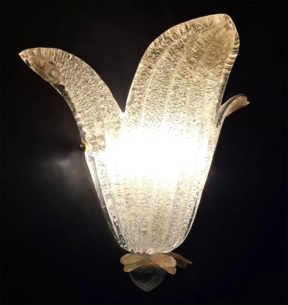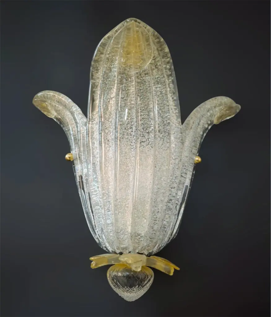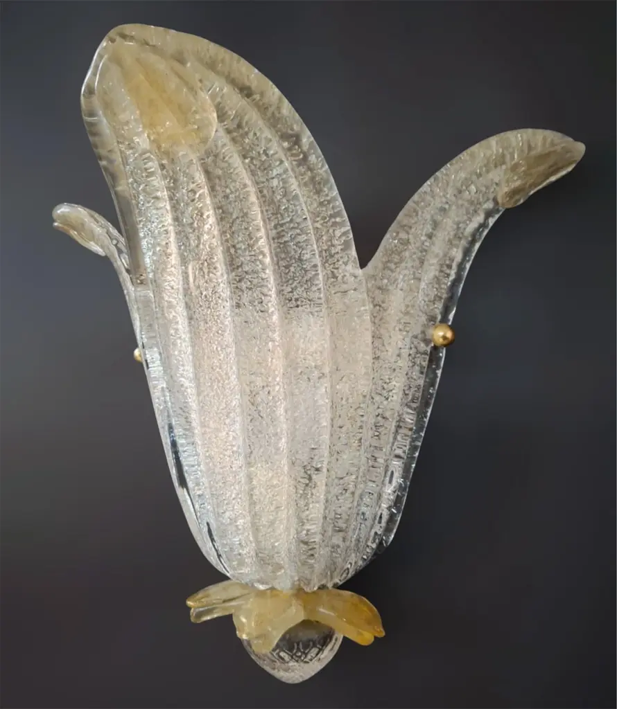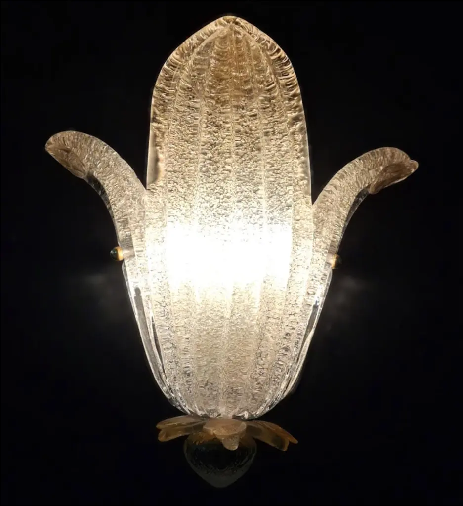 Vintage Italian wall light with clear Murano glass leaves hand blown with graniglia technique to produce granular textured effect, with parts infused with gold / Made in Italy in the style of Barovier e Toso, circa 1960sMeasures: width 12 inches / Height 12 inches / Depth 6 inches2 light / E12 or E14 type / max 40W each3 available in stock in Italy, price listed is for each itemOrder reference #: FABIOLTD L27