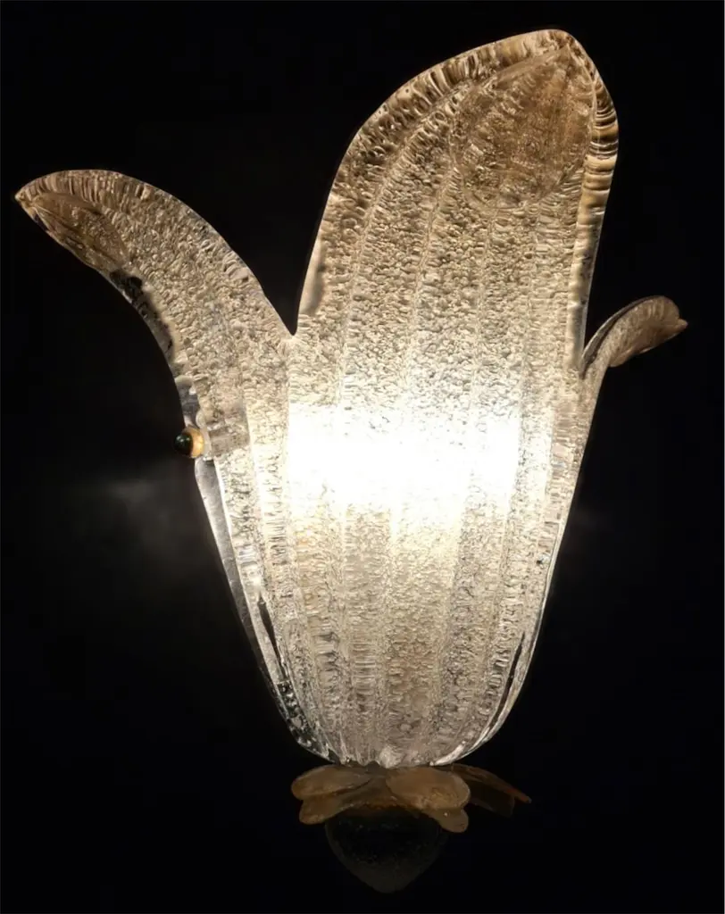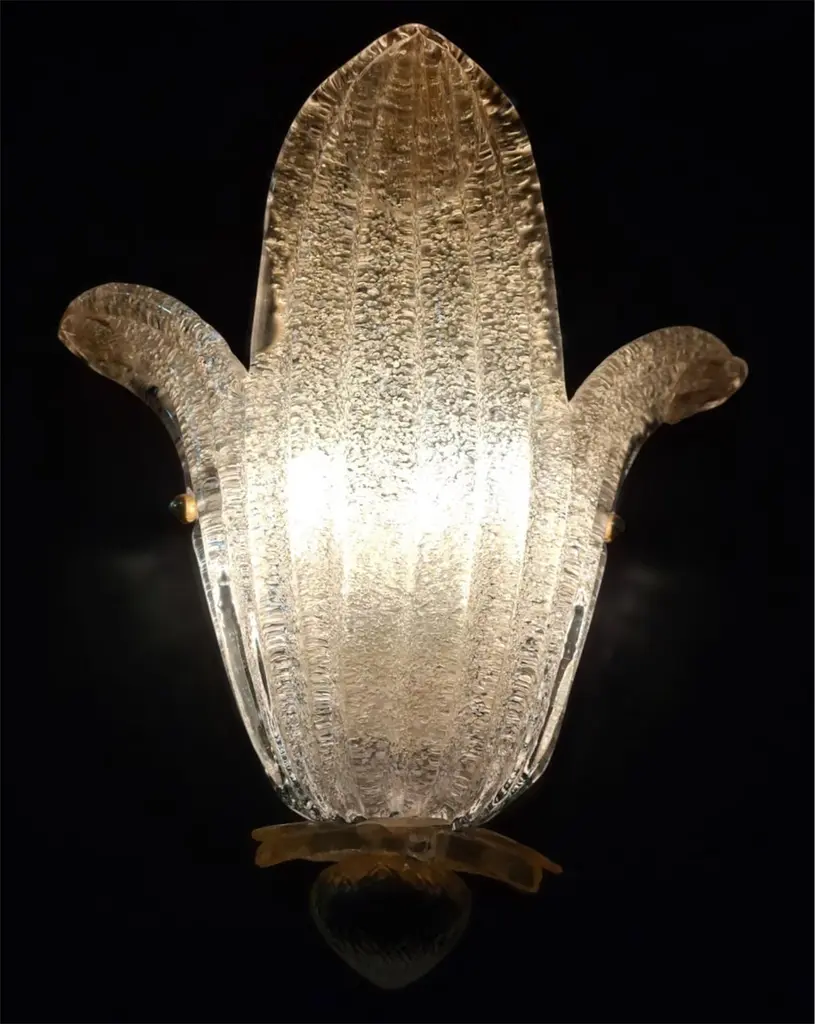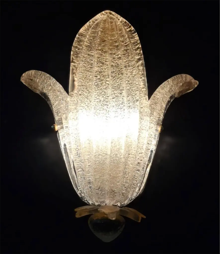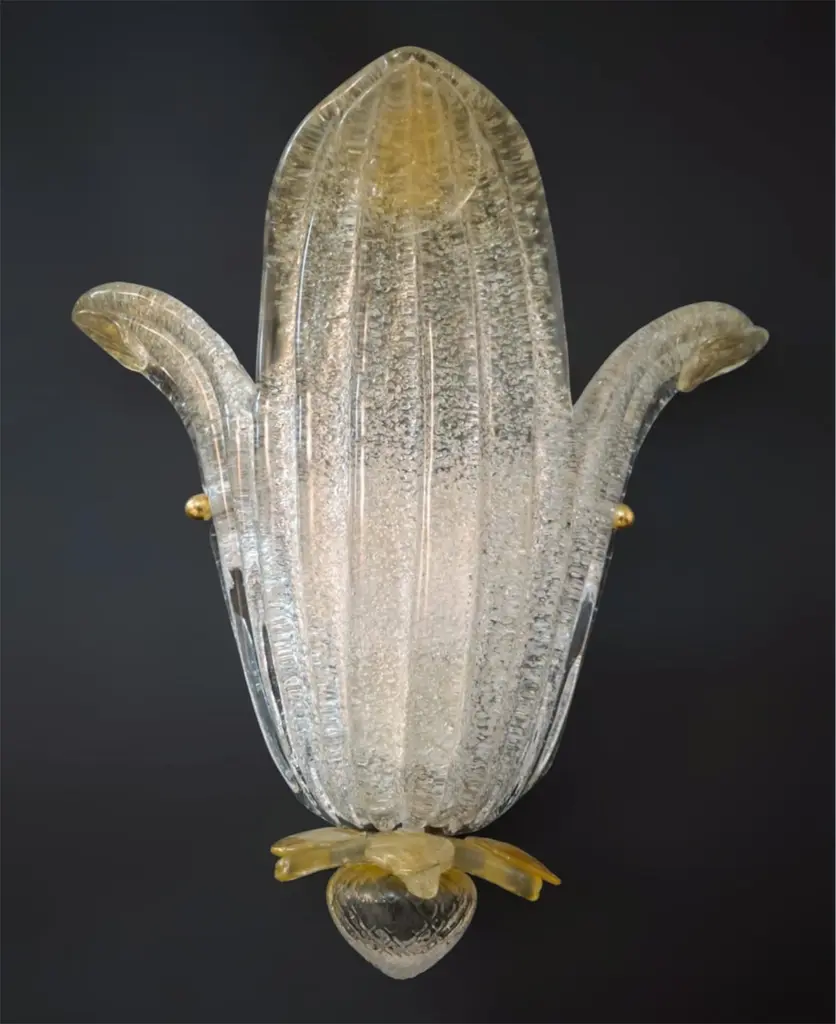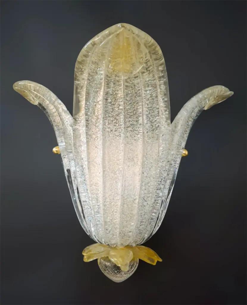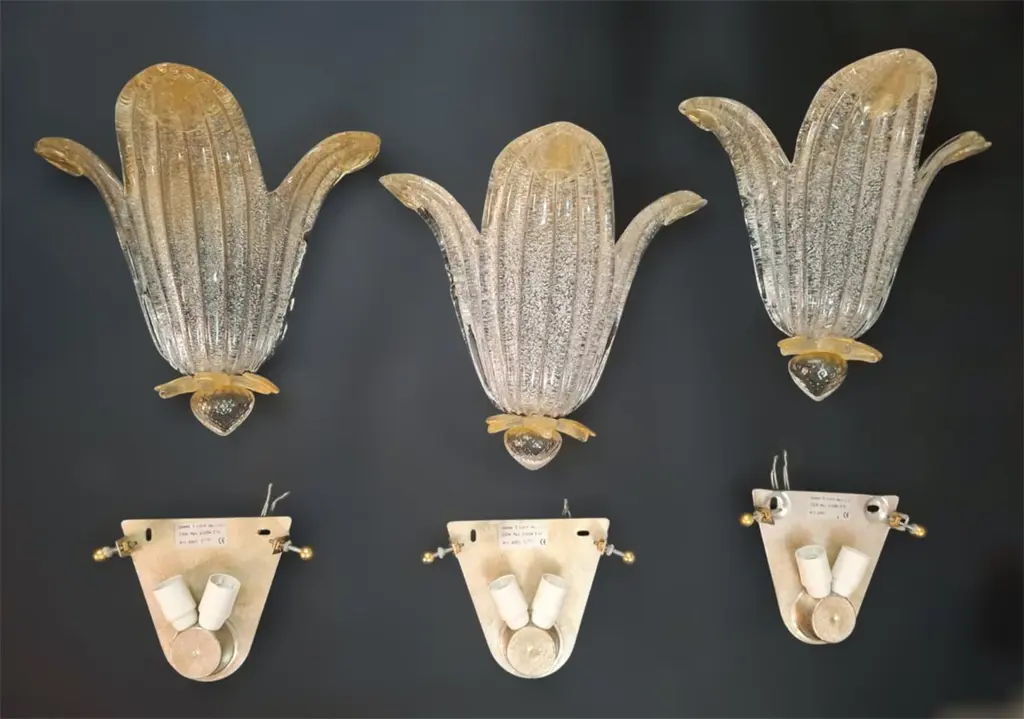 Vintage Italian wall light with clear Murano glass leaves hand blown with graniglia technique to produce granular textured effect, with parts infused with gold / Made in Italy in the style of Barovier e Toso, circa 1960sMeasures: width 12 inches / Height 12 inches / Depth 6 inches2 light / E12 or E14 type / max 40W each3 available in stock in Italy, price listed is for each itemOrder reference #: FABIOLTD L27