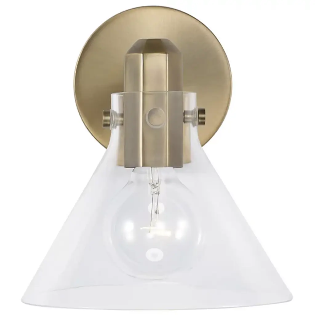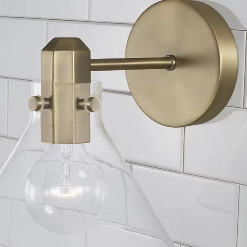 Decorate your home with the elegant Greer Wall Sconce by Capital Lighting. A modern take on midcentury style, the Greer Sconce brings understated style to your living space. This wall sconce features a faceted socket. This fixture’s fine metalwork showcases rivet details which add a pop of personality to the tapered glass.
