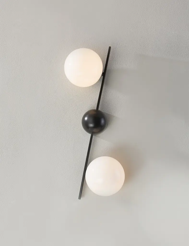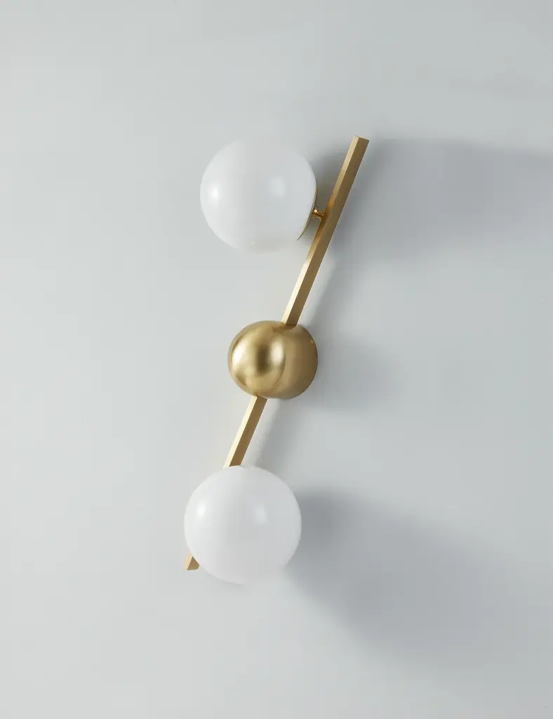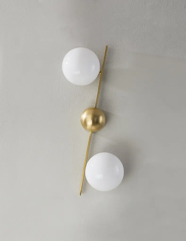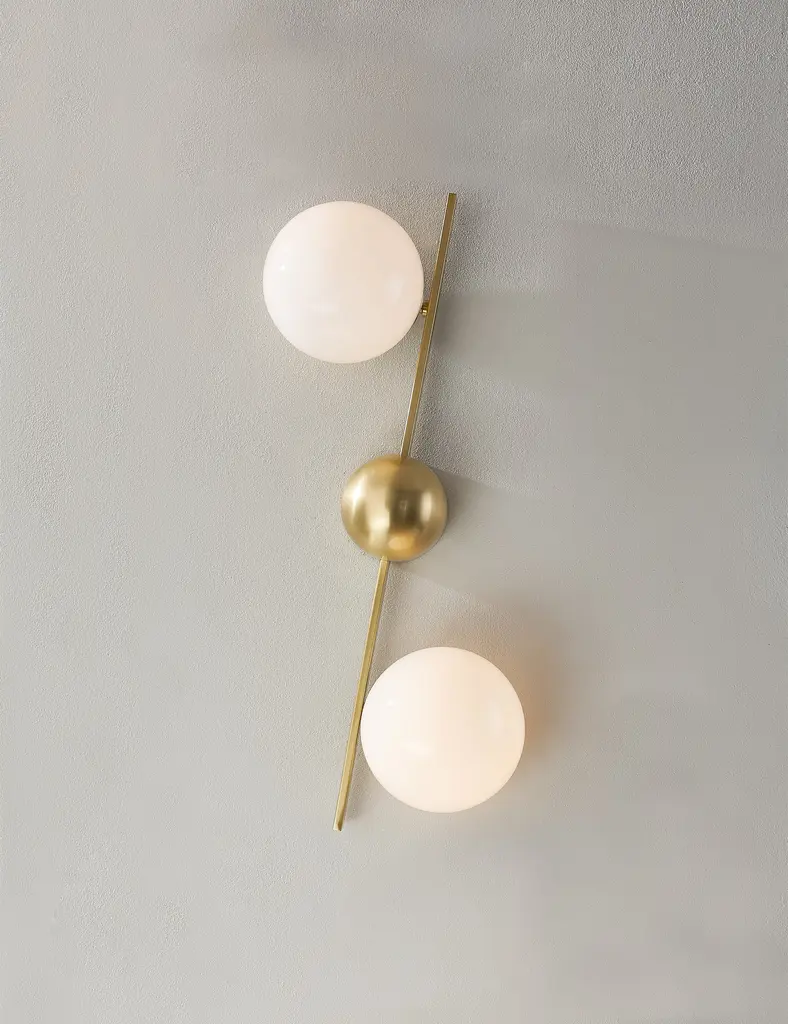 Greta brings a modern edge to sconce lighting. A domed backplate with square arms holds two opal glass globes to offer ample light with a chic edge. The sconce's dynamic design is fully adjustable, allowing the shades to be positioned in line with the backplate, both horizontally and vertically.