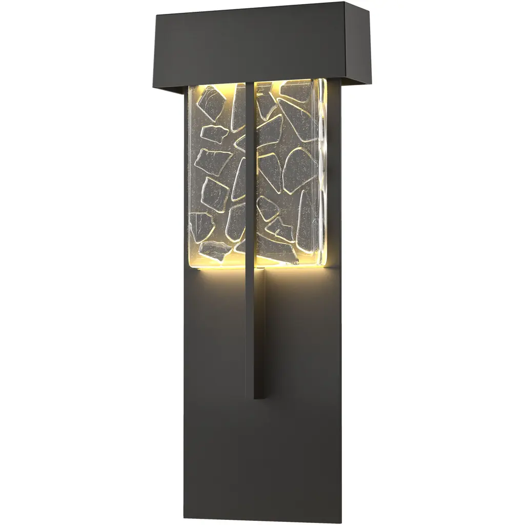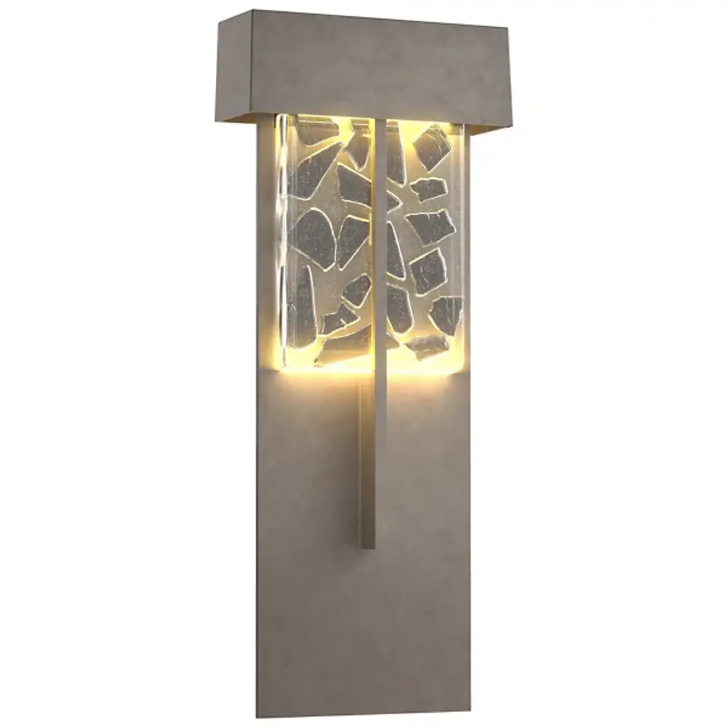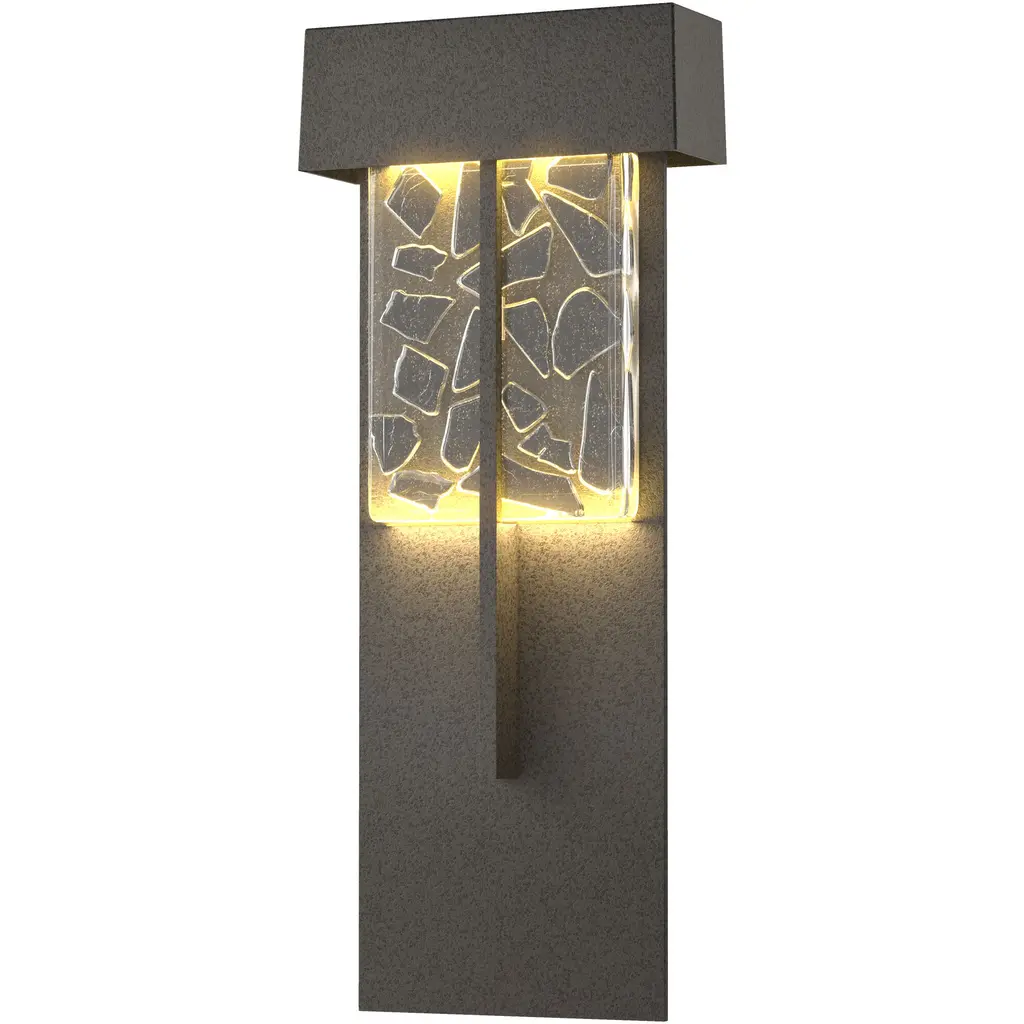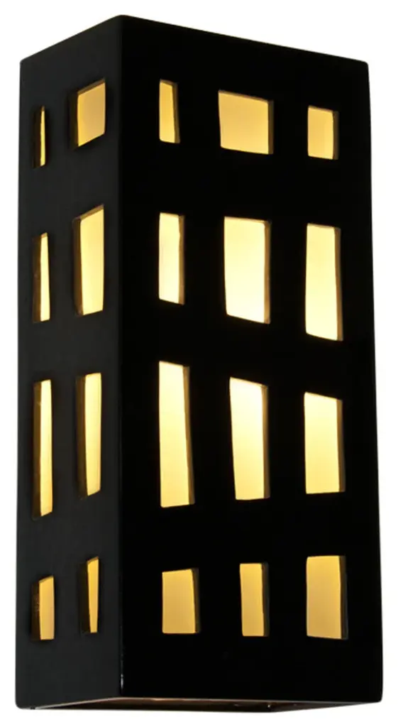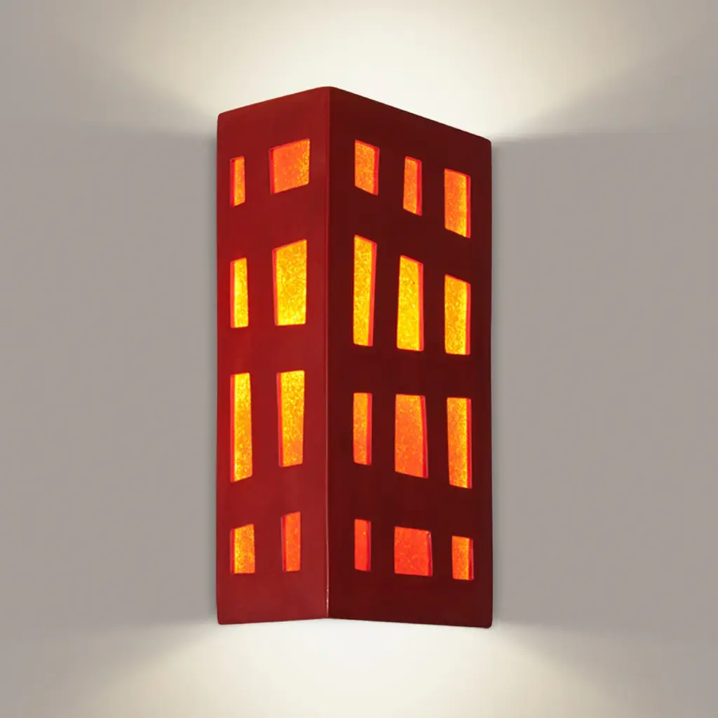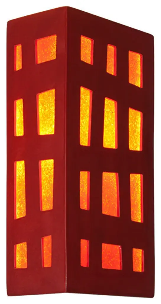The Grid Wall Sconce features a rectangular box lantern design with Fire panes of glass framed by Matador Red asymmetrical grid lines on three sides. Light shines through openings at the top, the bottom and creates a warm glow through the glass. This one-of-a-kind wall light integrates fused art glass made from reclaimed window glass and kiln-fired glazed ceramic. Subtle color and texture variations are the hallmark of a truly handcrafted piece of art. Standard Lamping: Uses (1) 60W E12 Candelabra Base Bulb. (Bulb not included)Number of Bulbs: 1Watts per Bulb: 60Standard Base Type: E12Mounting Center: 6.75in.Country of Origin: U.S.A.Warranty: One year limited warrantyResistant to rust and corrosion. Suitable for indoor or outdoor damp locations.