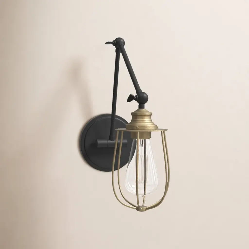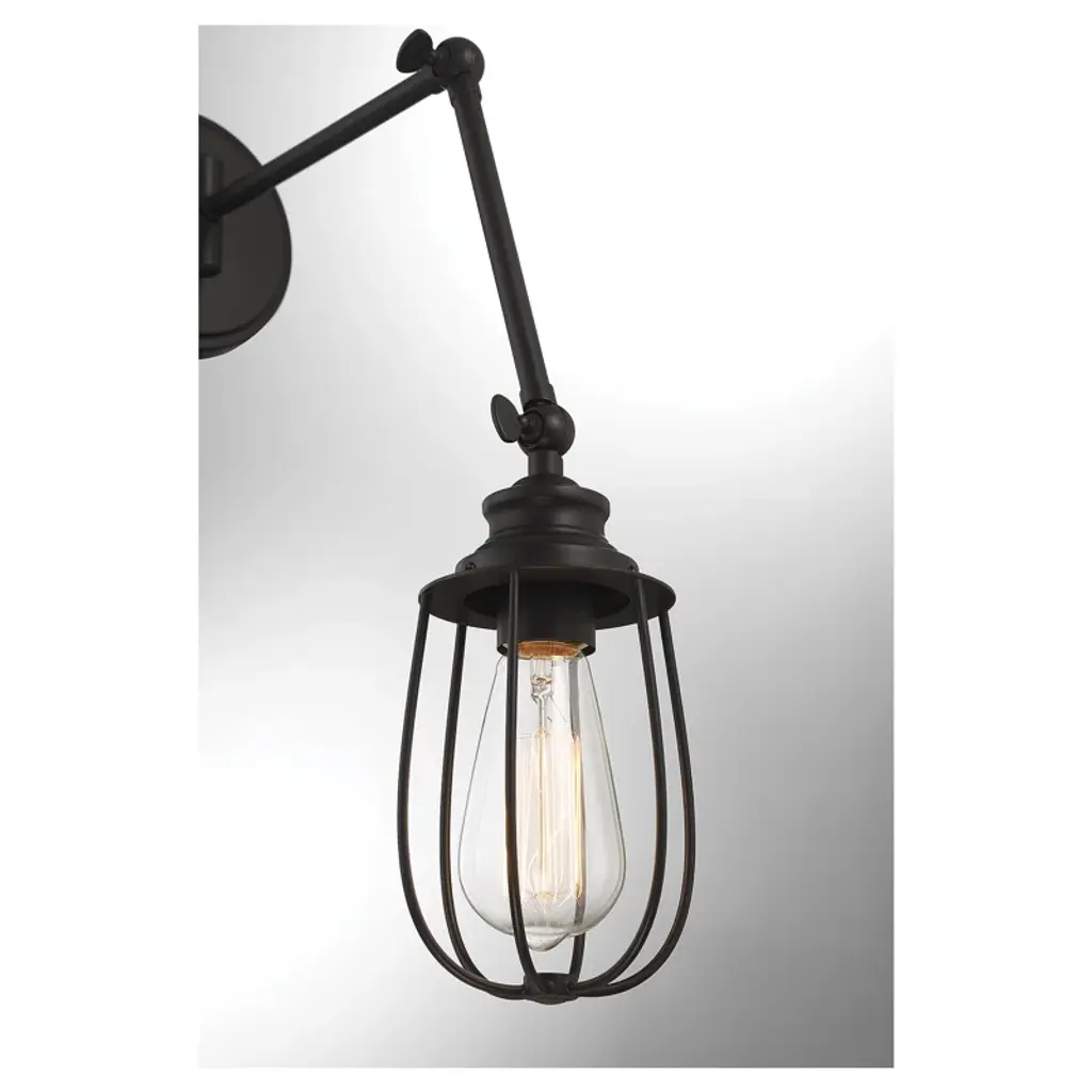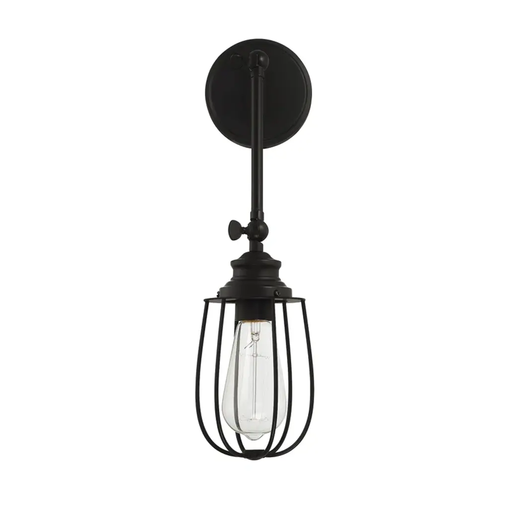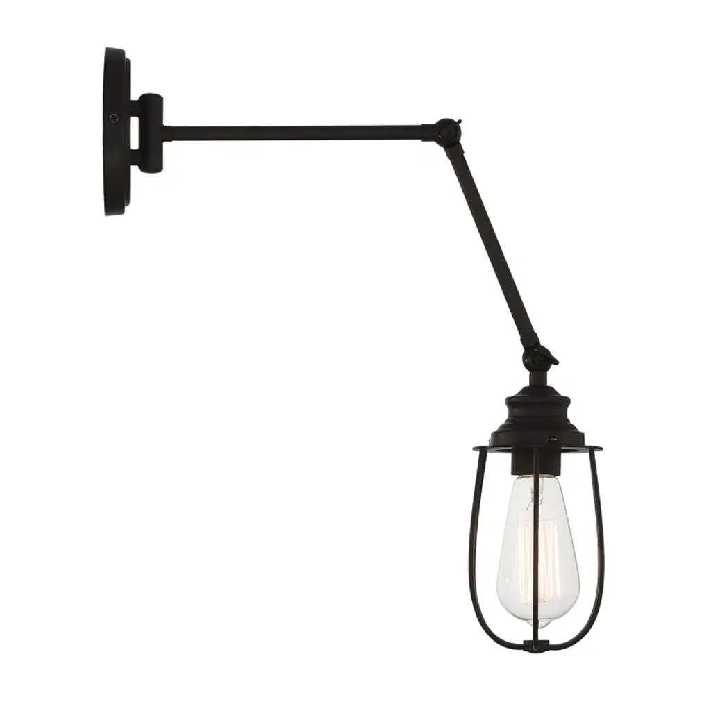 Adjustable and appointed with industrial style, this 1-light wall sconce is convenient and cool. 11.38" height, 5" width, wall extension ranges from 5" to 20.38". Max 60 watt bulb, standard size A19 bulb recommended. LED bulb compatible. Damp area rated.