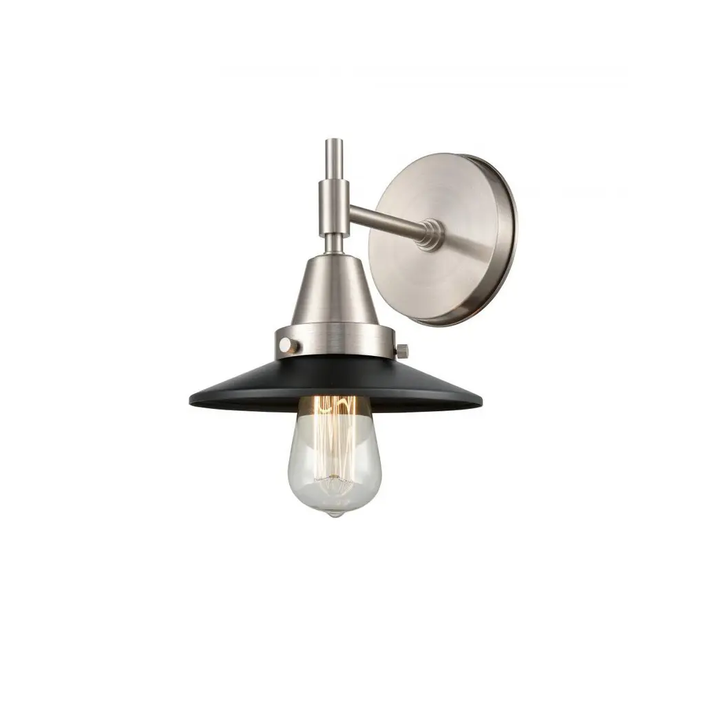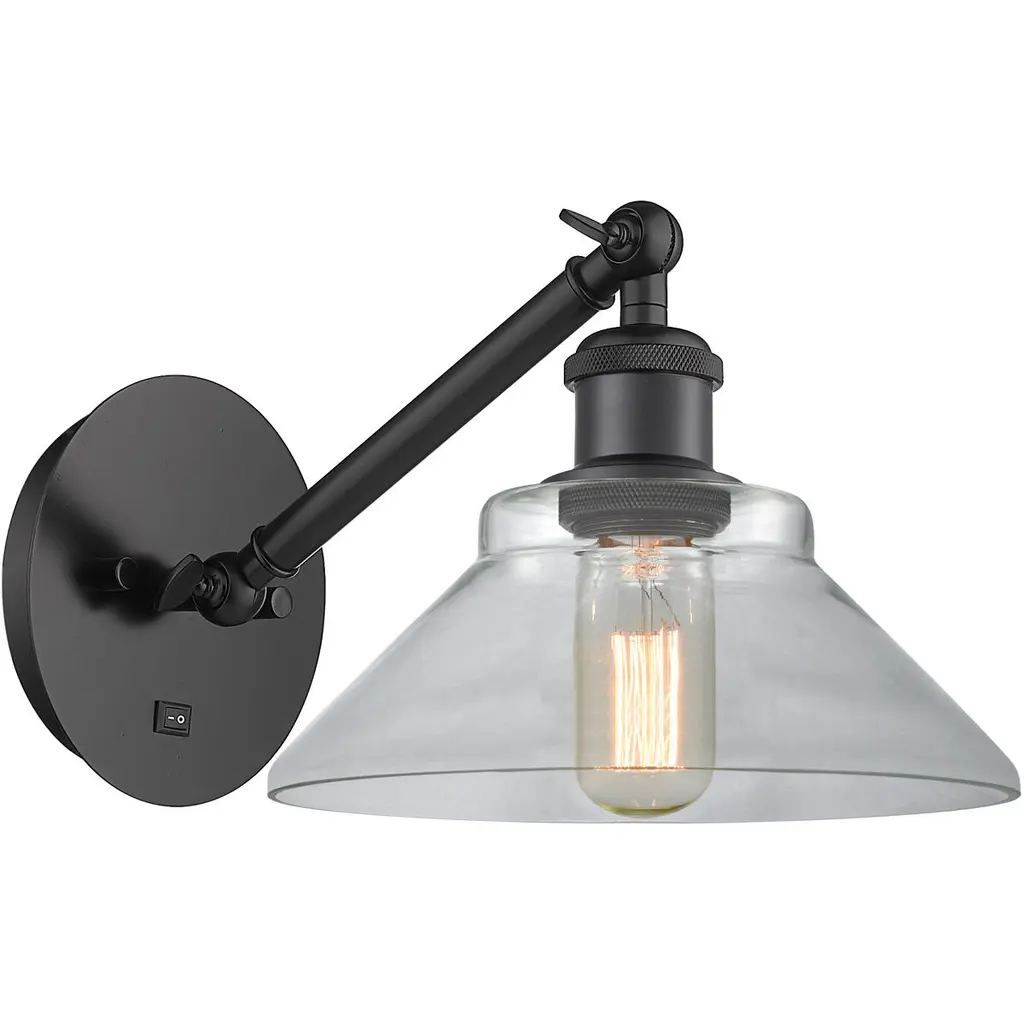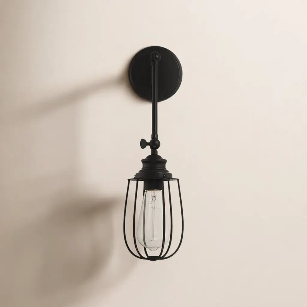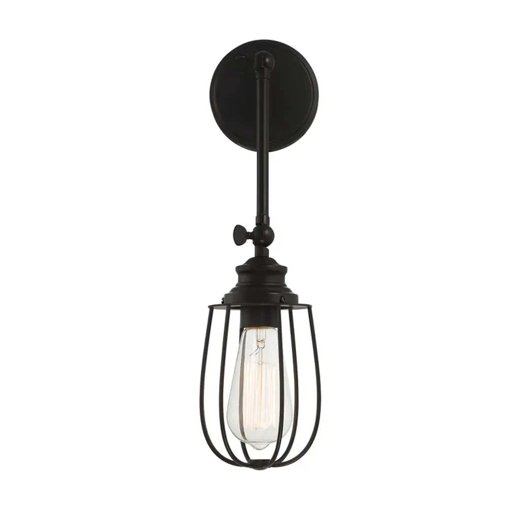 Adjustable and appointed with industrial style, this 1-light wall sconce is convenient and cool. 11.38" height, 5" width, wall extension ranges from 5" to 20.38". Max 60 watt bulb, standard size A19 bulb recommended. LED bulb compatible. Damp area rated.