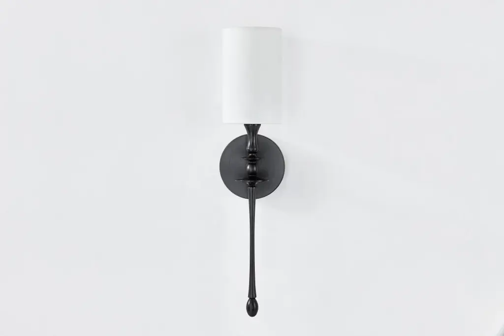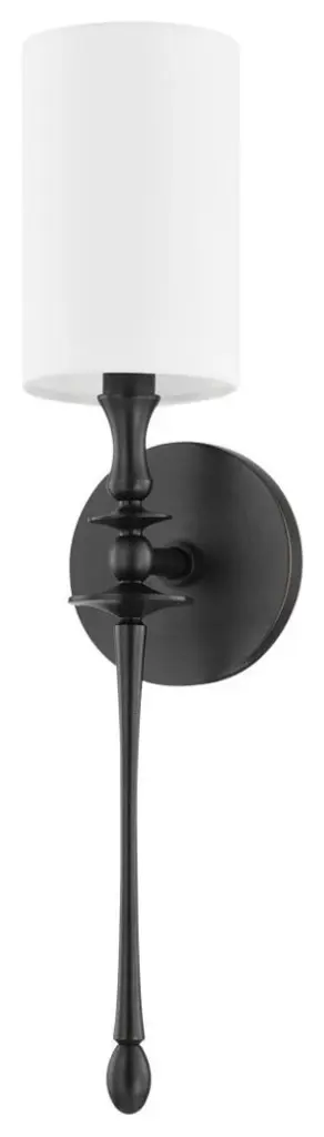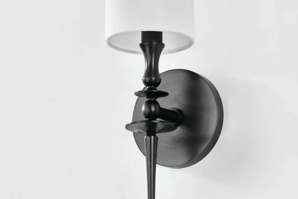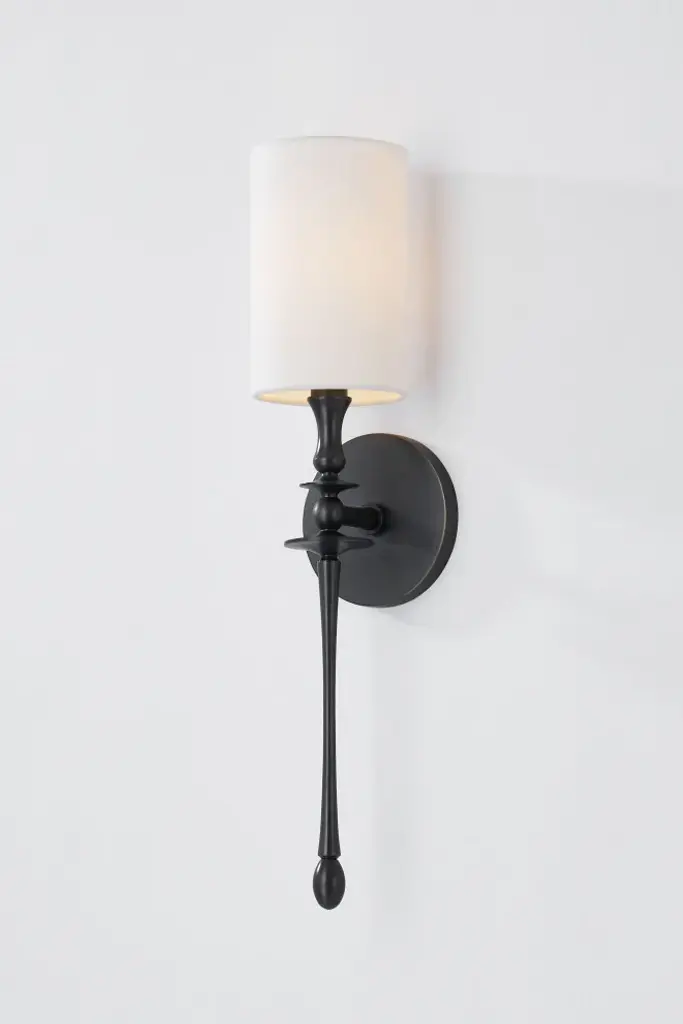 Steeped in sophistication, Guilford features a long, elegant arm supporting a crisp white linen shade. The decorative, candlestick-like form culminates in a large, slender drum shade. This elegant sconce would look distinguished alongside a fireplace or with multiples down a long hallway. Available in two finishes; Aged Brass and Distressed Bronze.Features• Overall product dimensions are 4.75" W x 4.75" D x 19.75" H• Compatible with E12 candelabra base for quick and easy installation• Durable steel construction for long-lasting quality and use• UL Damp rated for your safety and convenience in humid spaces• Hardwired switch for a seamless setup and smooth integration into your home• 1-year limited manufacturer warranty for added assurance and peace of mindDimensions:Wall Sconce• Assembled Product: 4.75 inches wide x 4.75 inches deep x 19.75 inches high• Shade Height: 6.5 inchesRequirements• Maximum Voltage: 120 volts