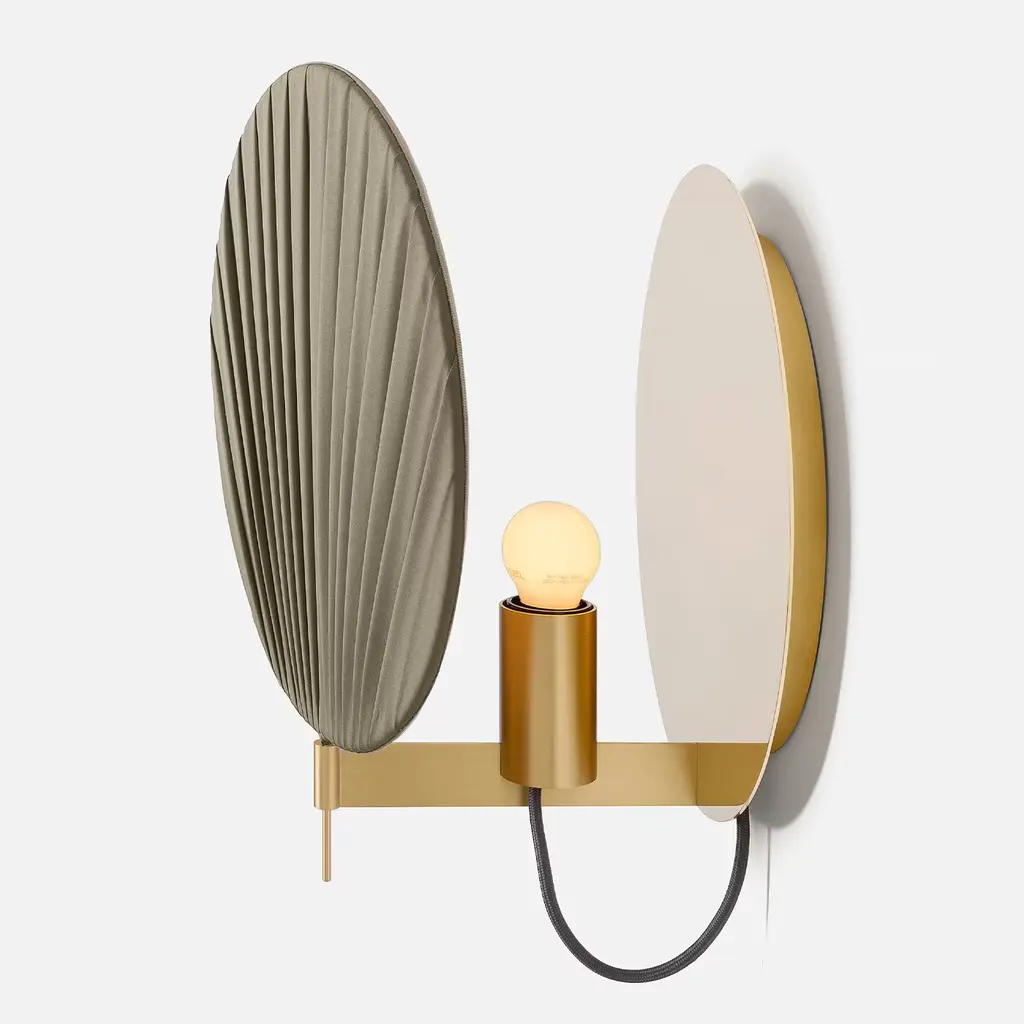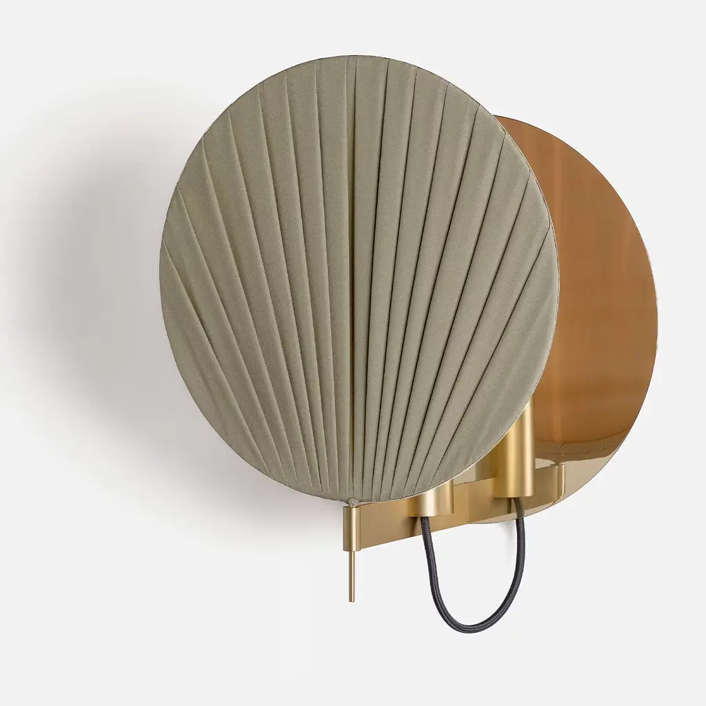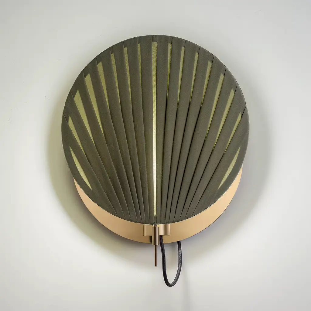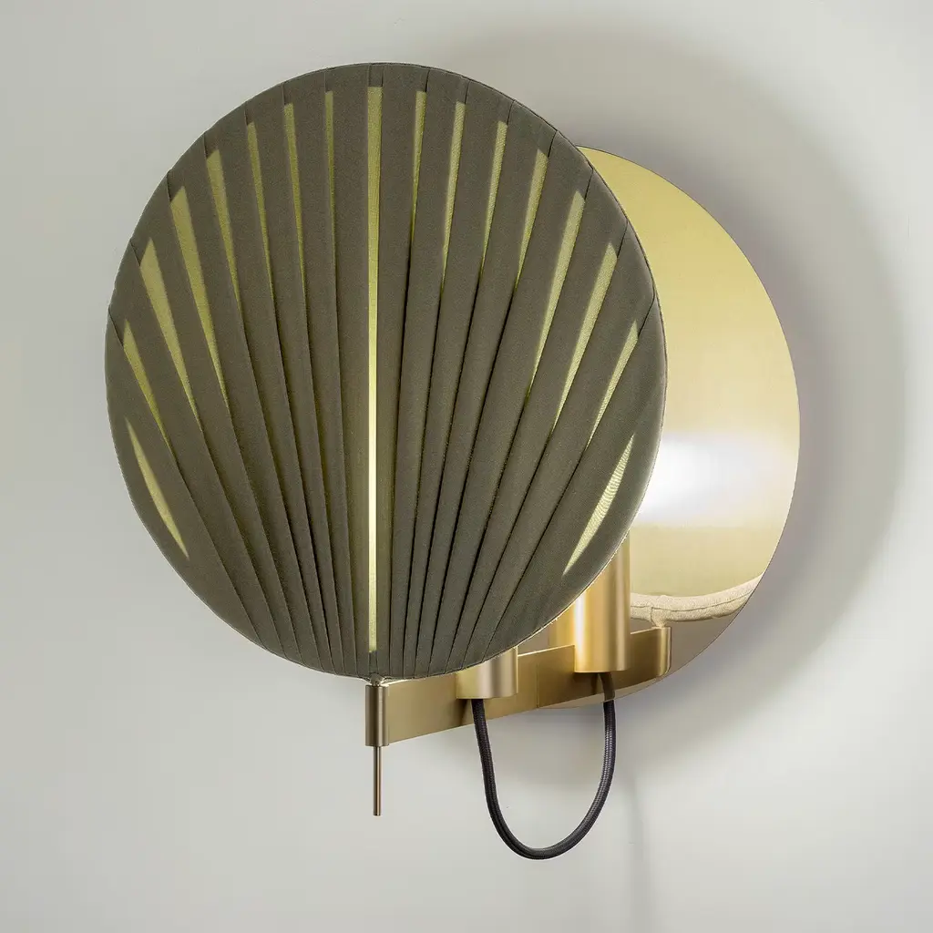 This stunning wall lamp is a decorative and functional piece that will enrich the look of a home, thanks to the multiple layers of pleated pongé used as shade that create an exquisite lighting with iridescent accents. This forest green color is relaxing and elegant and is shaped as a fan over a bracket of natural-finished brass, attached to the the wall with a solid brass dish of the same size. This perfect symmetry is sophisticated and modern. For a colorful effect, it is possible to combine other lamp together.