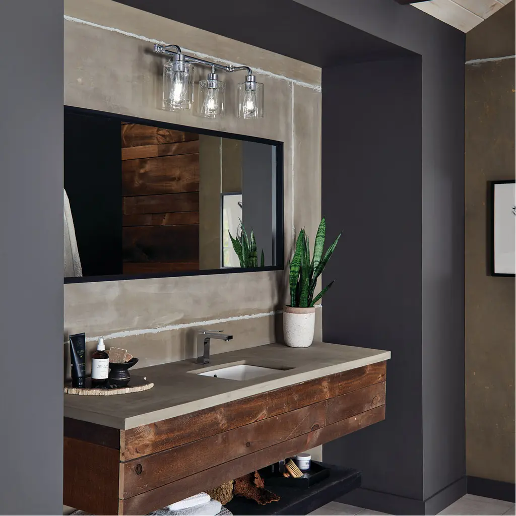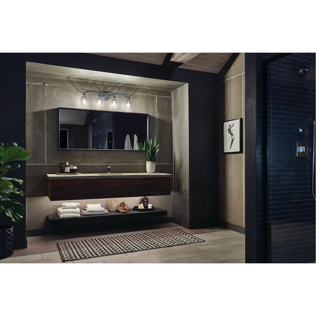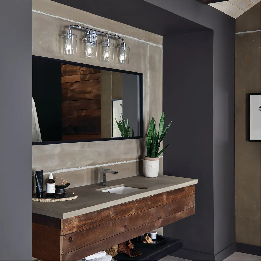 With adjustable hinges, the Gunnison(TM) 4-light bath vanity allows you to customize the light in your bath to focus on the areas you want to illuminate most. The fixture's exposed hardware and mirror-like Chrome finish offer the perfect touches to your traditional bath setting.