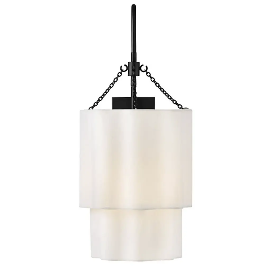 The Gwen Wall Sconce from Hinkley features a scalloped shade with elegant layering that filters light into a gentle, flattering glow. Delicate chains and minimal stems suspend the linen shade, creating visual lightness while maintaining structural integrity. The cylindrical form provides directional brightness suitable for halls, sleeping quarters, and living areas where soft, diffused light is desired. Hidden mounting hardware maintains the sconce's clean aesthetic, allowing the shade to appear as if floating against the wall. This transitional piece distributes light upward and downward, maximizing both ambient and task illumination from a single source.