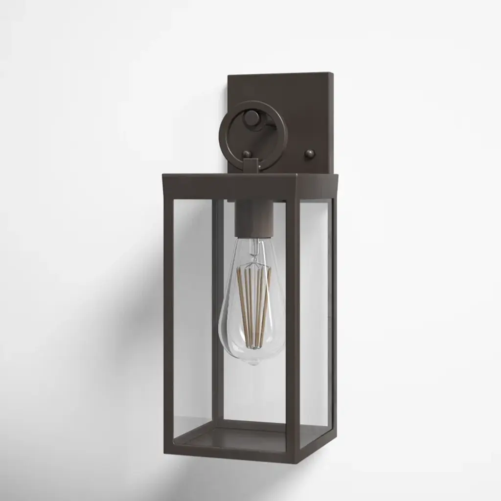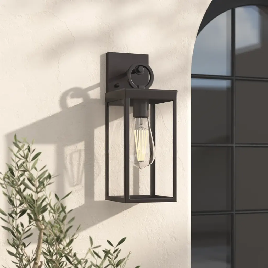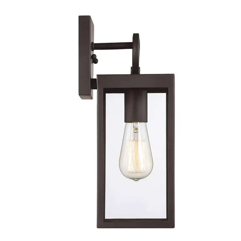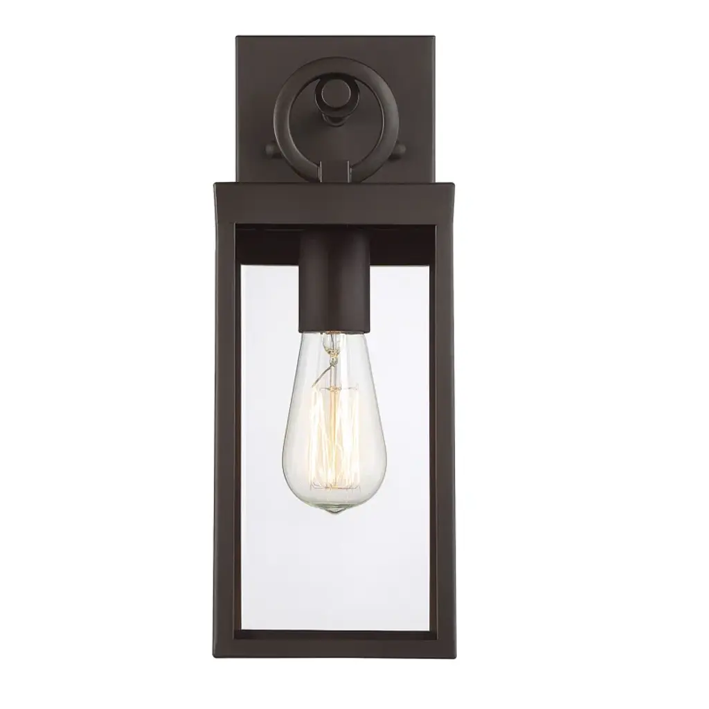 Add a welcoming glow to your covered porch or ambiance on your backyard deck with this wall lantern. Safe to use in covered outdoor areas, it's made from metal with a rich, warm oil-rubbed bronze finish. We love the look of the rectangular backplate and the contrast with the circular ring support, which makes it look as if this lantern is hung instead of mounted. Inside the clear glass shade, this lantern houses a medium-base bulb of up to 60W. For added ambiance, this lantern looks great with an Edison-style bulb.