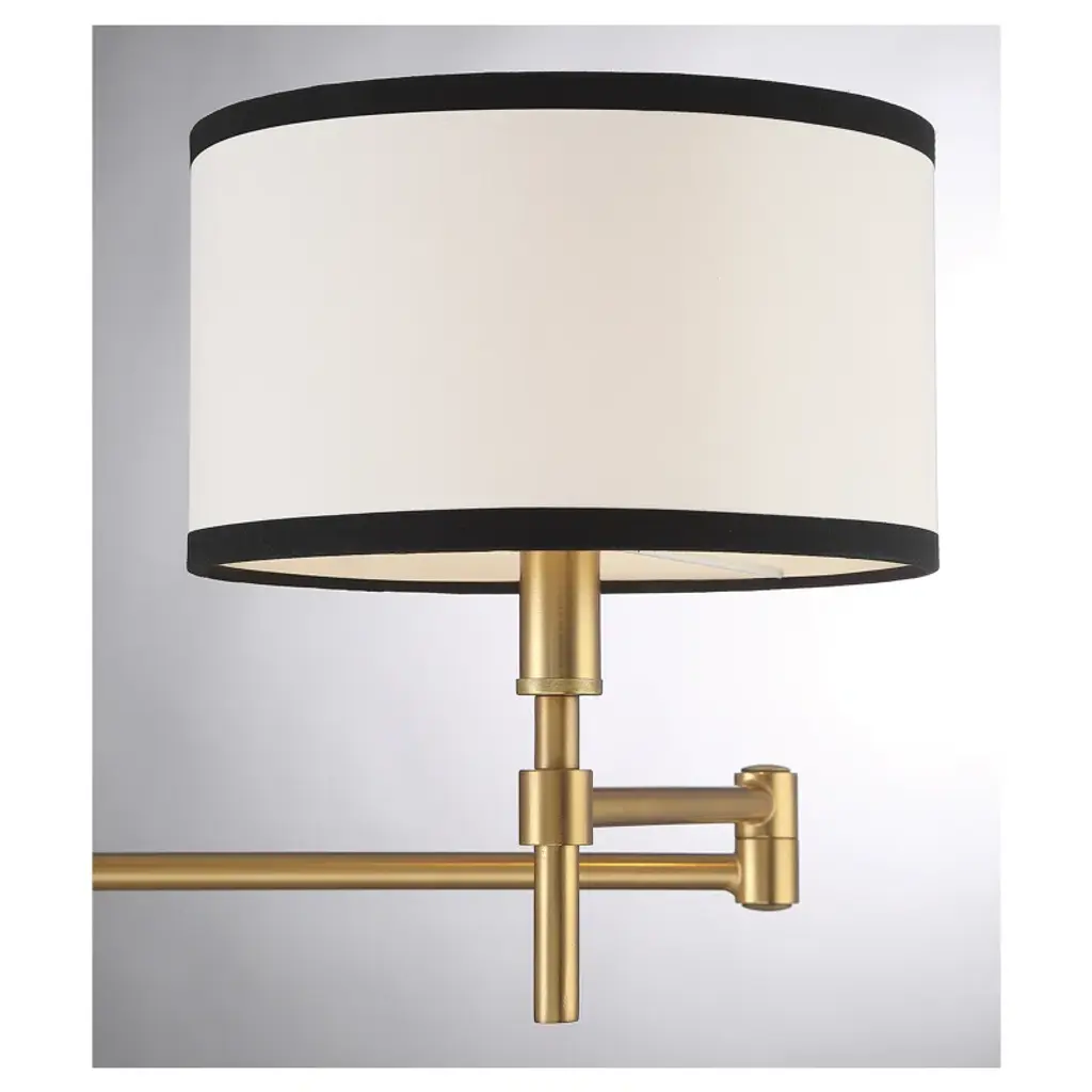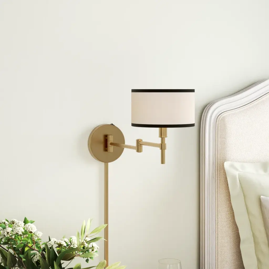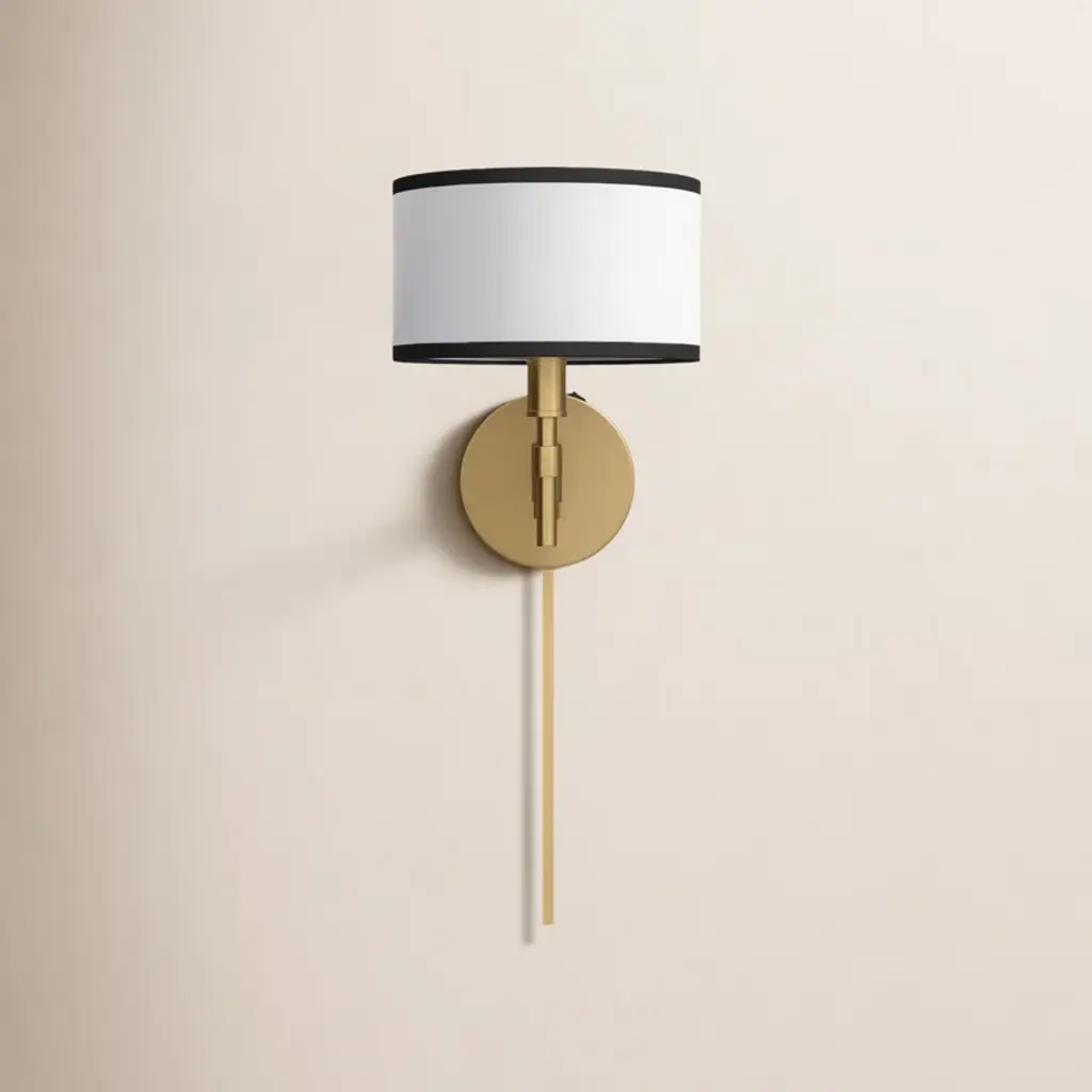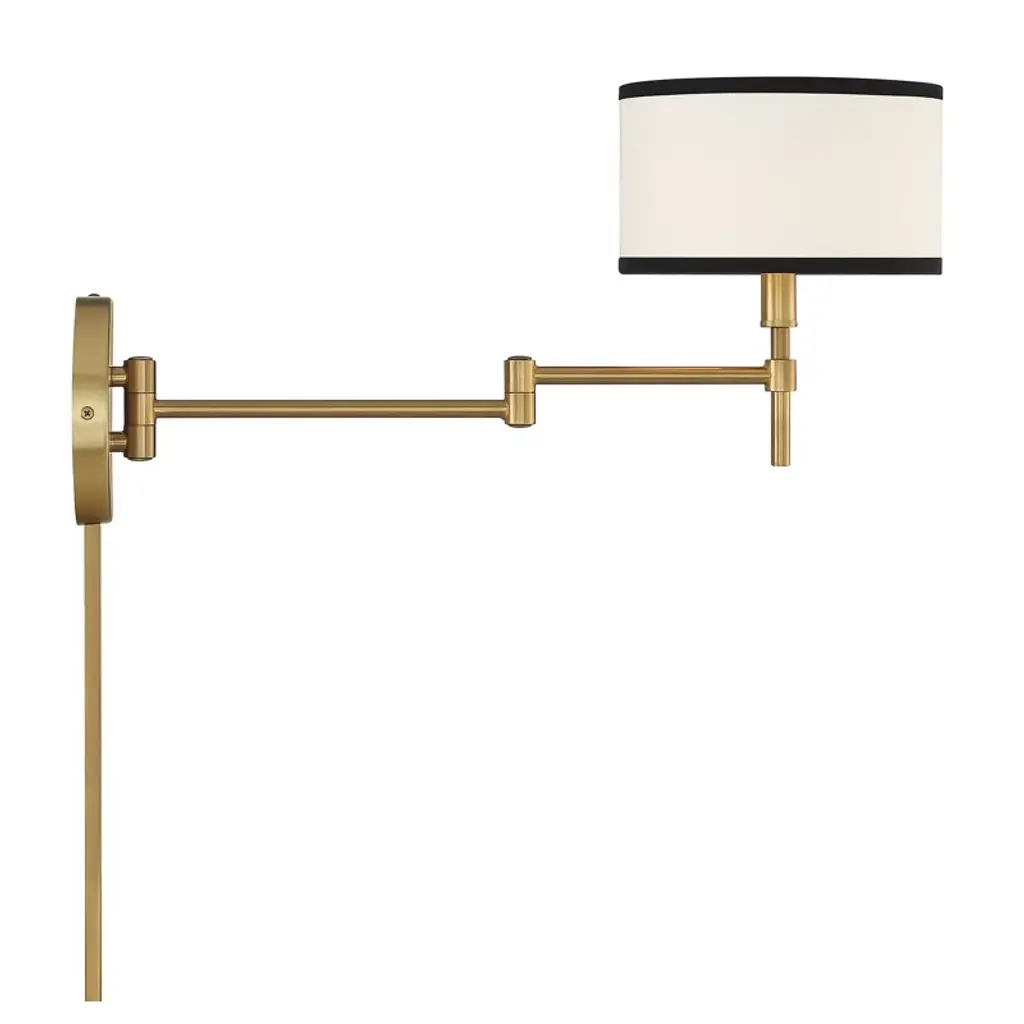 Thoughtfully designed and crisply tailored, this 1-light adjustable wall sconce will bring bright, convenient style to any space. The white fabric shade is edged in black for two-tone appeal that pairs well with the natural brass finish. 10.5" height, 8" width. Wall extension ranges from 8" to 20". Max 60 watt bulb, candelabra size C11 bulb recommended. LED bulb compatible. Damp area rated. Can be hard-wired or plugged in to a wall outlet.