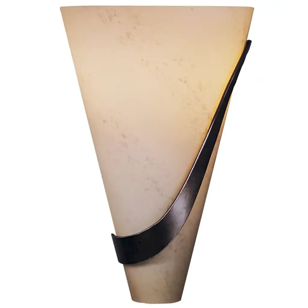A shapely wall sconce that sweeps away any thought of its competition. The elegant, rugged and somewhat whimsical Half Cone with Sweep Wall Sconce by Hubbardton Forge is sure to give your wall extra style points. Its design is ostensibly simple, with a simple cone-shaped shade crafted with care and style from Hand Blown Glass. What sets the fixture apart is its frame, sturdily forged from Wrought Iron into a swooping angled shape to add visual variety.