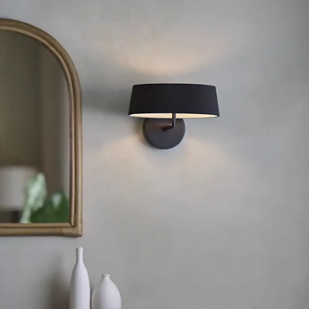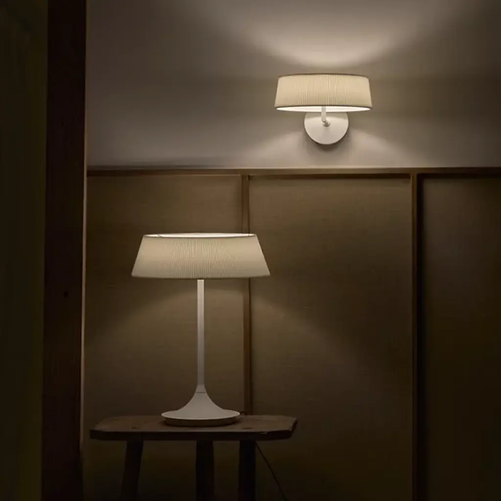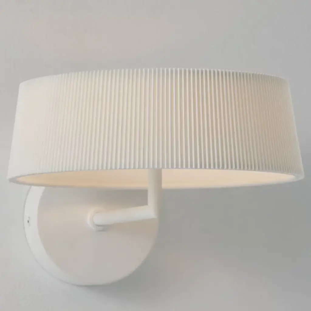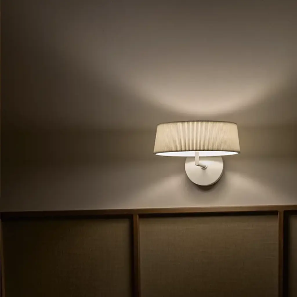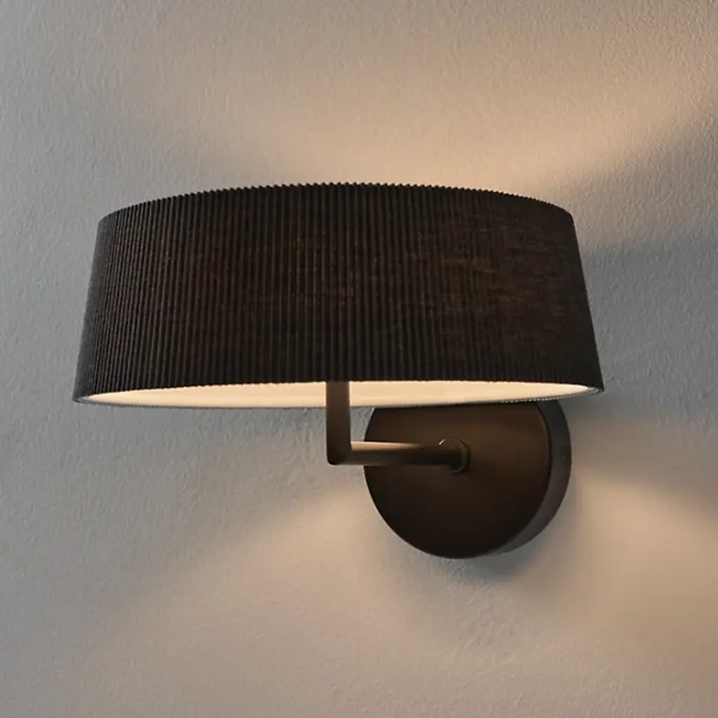 The Halo LED Wall Sconce from Seed Design combines nostalgic charm with modern functionality. Designed by Chen Chao Cheng, its finely pleated fabric shade pairs elegantly with a circular steel and aluminum frame, softly diffusing light for a warm, natural glow. The integrated high-CRI LED enhances colors beautifully, creating a soothing ambiance reminiscent of sunlight. The Halo blends caps off contemporary or mid-century modern interiors with ease, offering versatile function and gentle illumination.