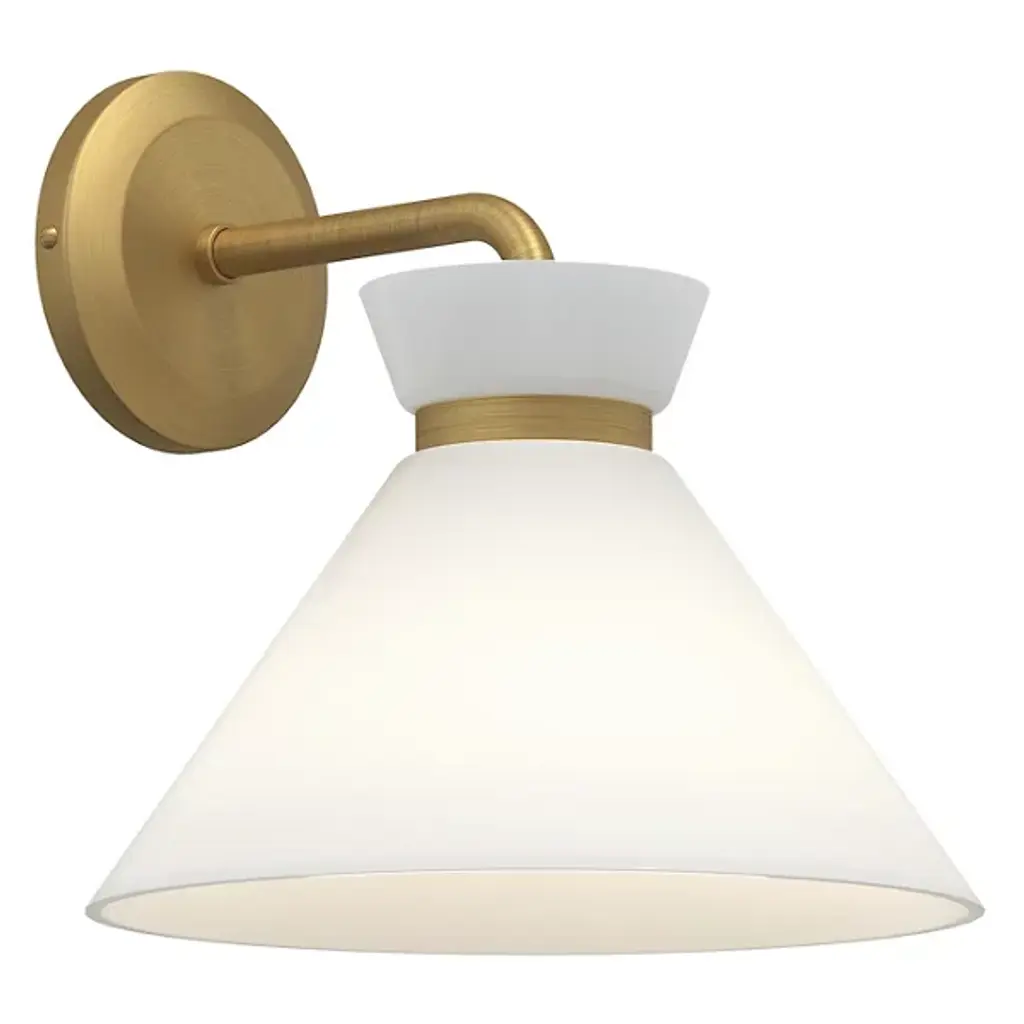 The Halston Wall Sconce by Alora Mood was inspired by classic silhouettes found throughout 1950s formal wear. Anchored by a round backplate and supported by a simple, gracefully bent arm, a tapered, opal glass shade is accented with a smooth metal band near its flared top, creating a clean silhouette. A glossy finish allows this glass to have a sleek, sophisticated feel as it filters a welcoming layer of illumination throughout its surface, bringing a bright and beautiful touch to spaces.