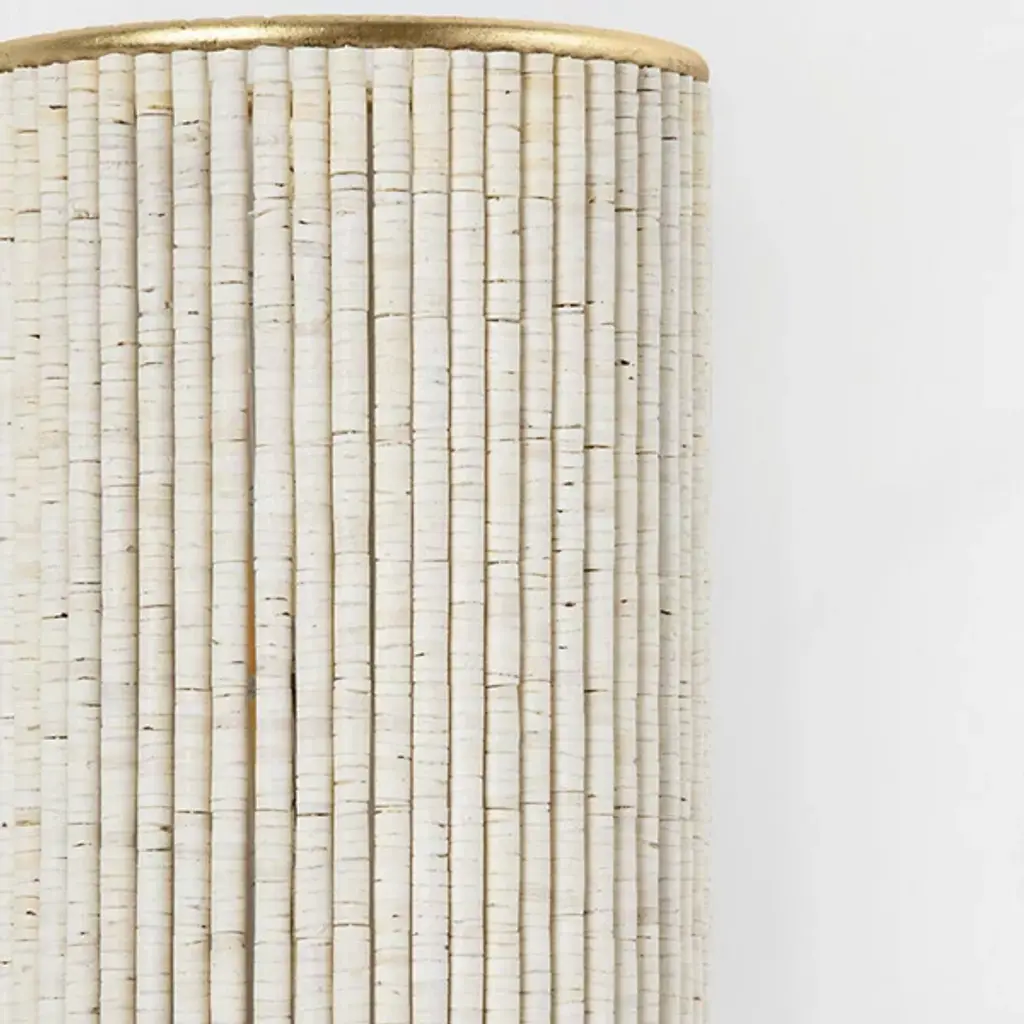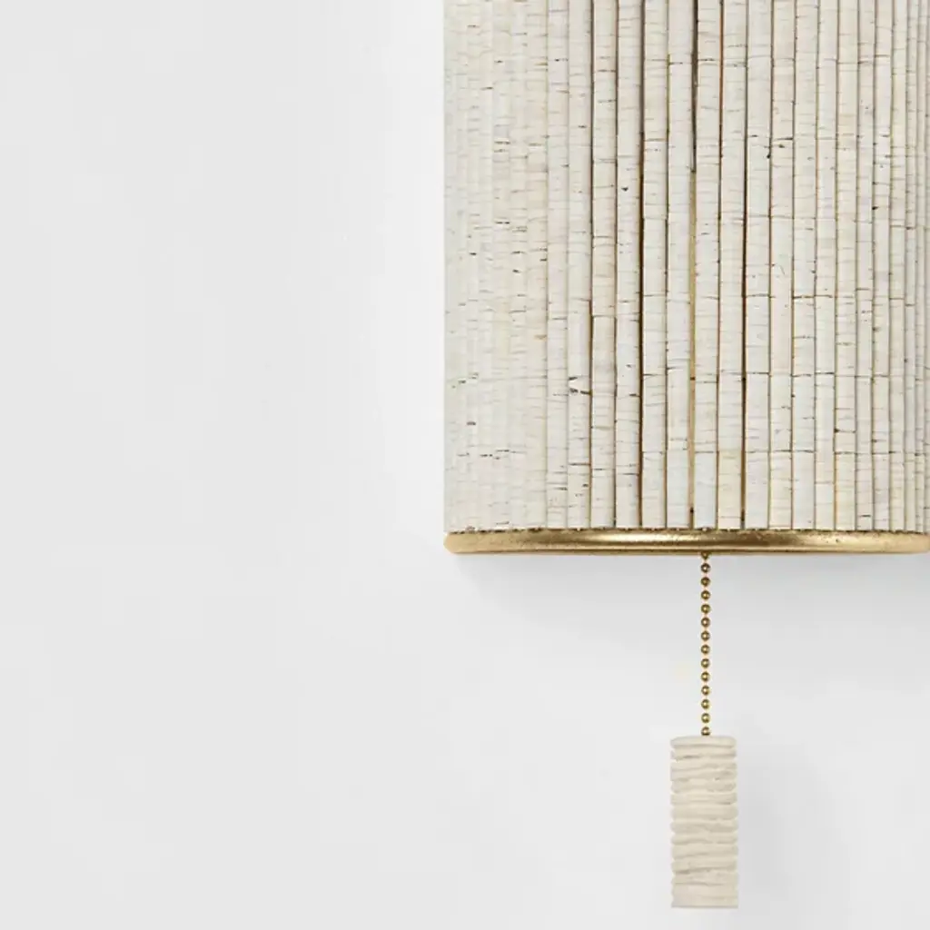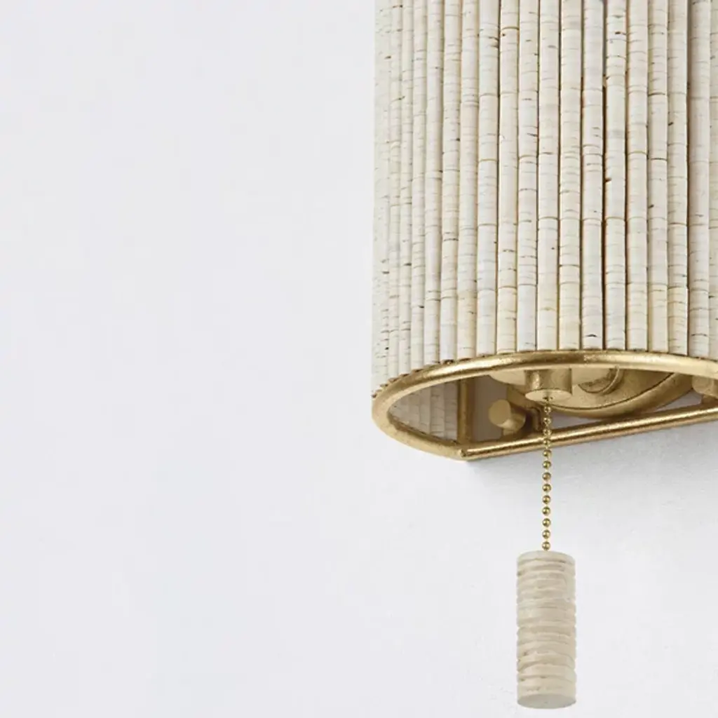 Incorporating Art Deco-inspired simplicity with a touch of elegance, the Hampden Wall Sconce by Hudson Valley Lighting boasts meticulous layers of exquisite white Coco beads adorning its shade, accentuating the material's beauty and craftsmanship. A dangling pull chain adds a playful element and enhances its charm, while a Vintage Gold Leaf finish creates an air of luxury. The lamping burnishes its circular backplate, exuding stylish sophistication and matching contemporary style with coastal elements. It is an ideal choice for damp-listed areas such as bathrooms or outdoor spaces. Due to the unique nature of the beads, each fixture will show slight variations in colors and patterns.