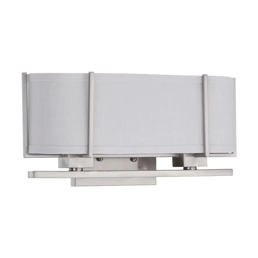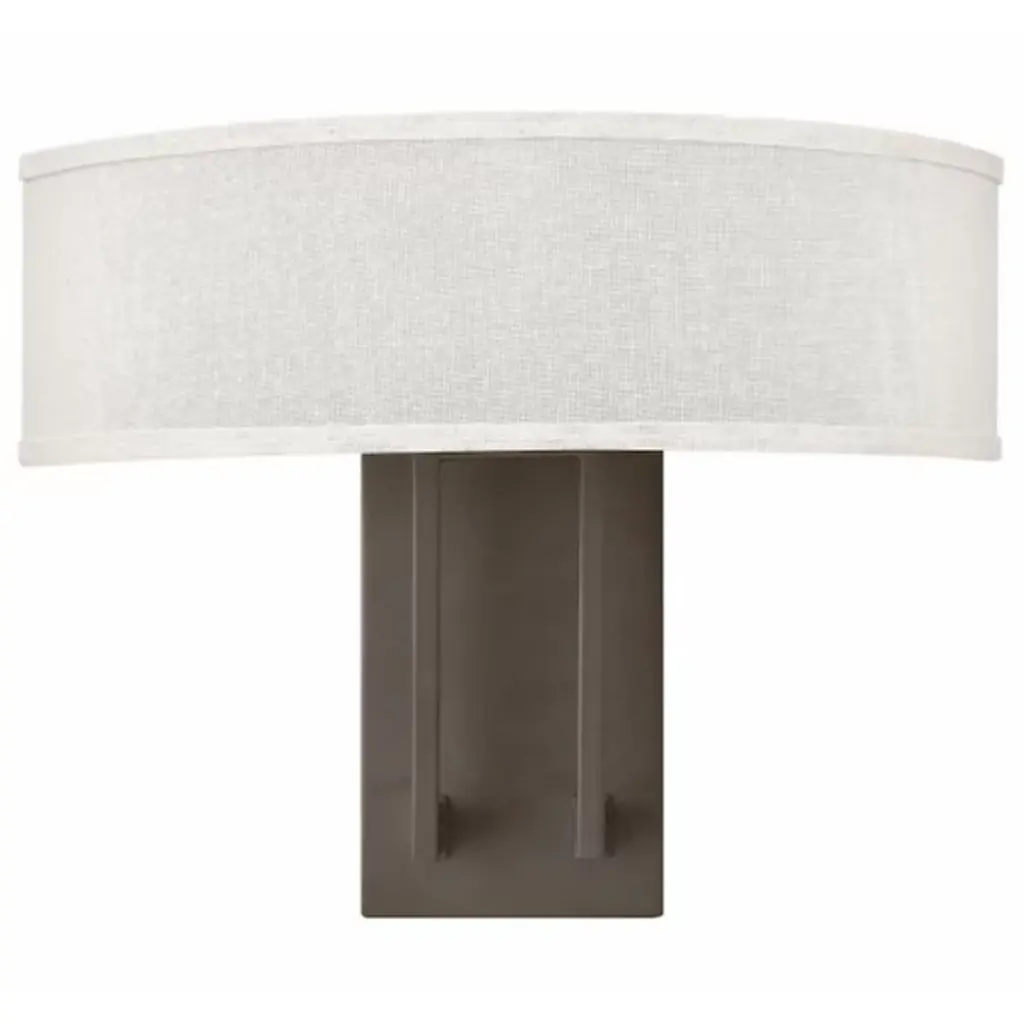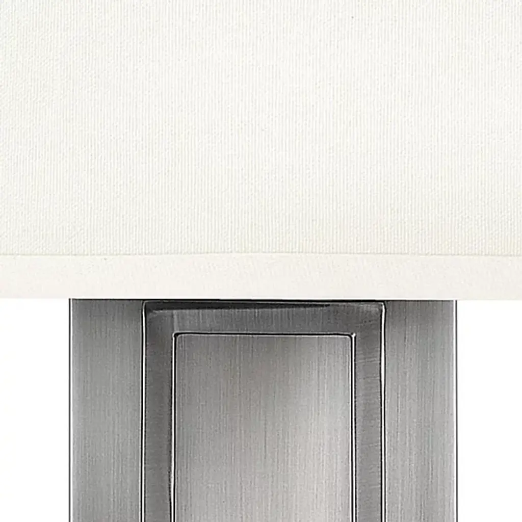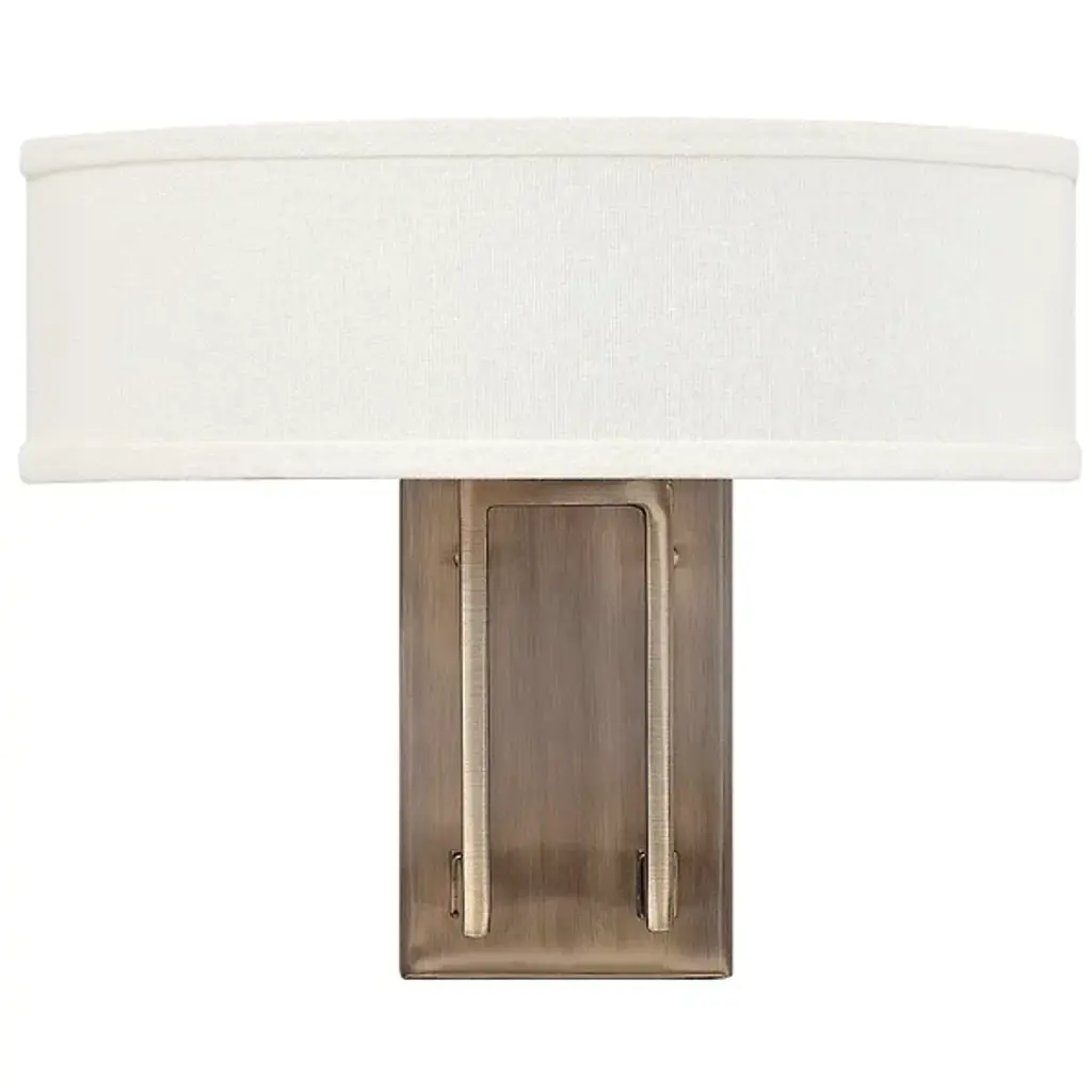 The Hampton 2-Light Wall Sconce by Hinkley Lighting features a wide, off-white linen hardback shade atop a rough-toned metal wall plate. Its light is warm and even, filling the surrounding space with a sense of calm and relaxation, while its rugged body gives a sense of strength and rigidity. An interesting stylistic contrast appropriate for open living spaces in both contemporary and traditional settings.