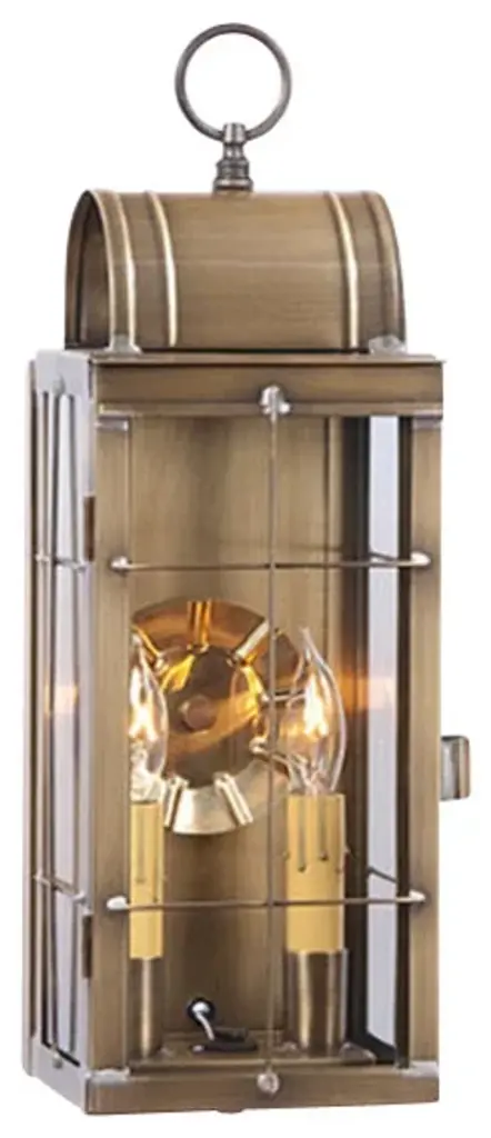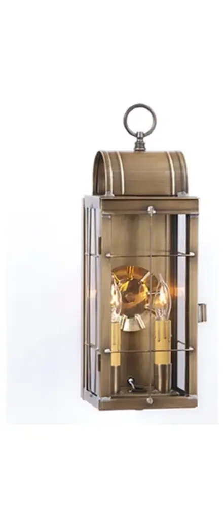 Entry wall sconce lightClassic colonial lanternDual candles with handmade barsIn rustic weathered brass & antique copperA beautiful reproduction of the classic slender colonial lanterns which adorned houses of past eras, this versatile light will most certainly add a special welcoming warmthOur most popular and stately design, sized to fit into tighter - especially when placed by your front door or on the patio! also great for decks and garages.Its rustic design delivers both light and warmth to a variety of architectural style homes.Solid metal construction, this lantern will last a lifetime.Just remember that copper does darken with age, but will only add to the colonial charm.Direct wired with two (2) candelabra sockets - 60 watts max. each. (60w)Bulbs are not includedHandcrafted in pennsylvania.Ul listedMeasures:18"h x 7"w x 6"dMade in the usa