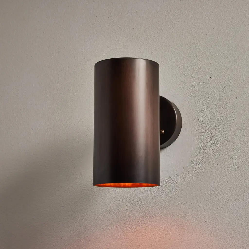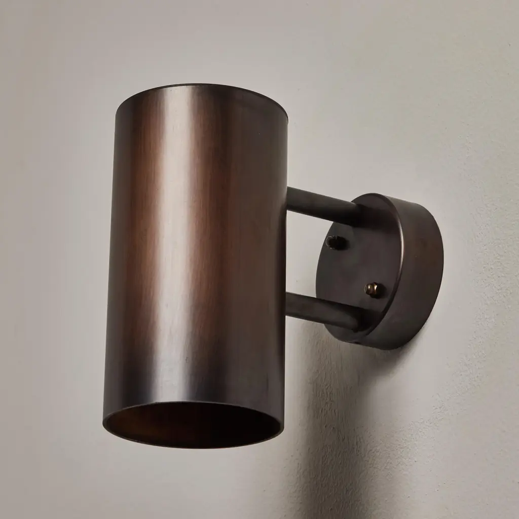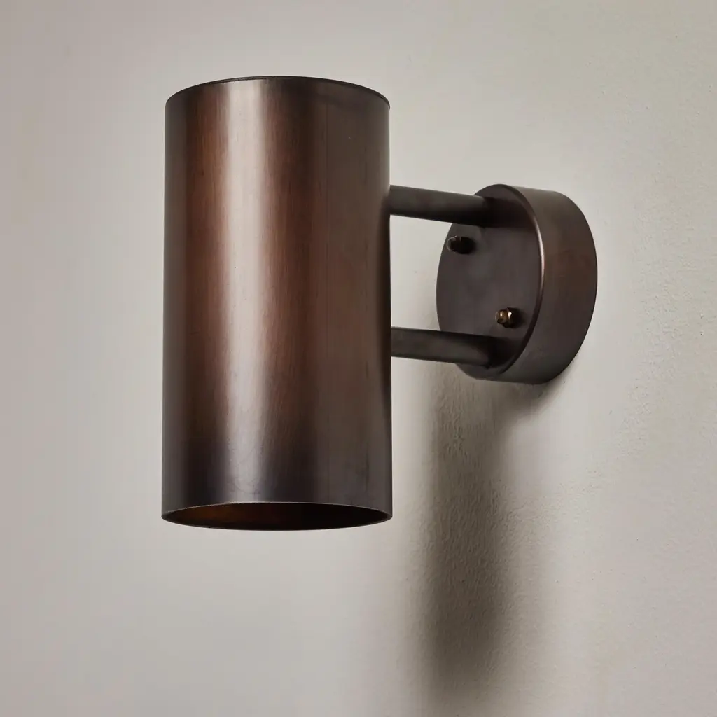 Hans-Agne Jakobsson C627/110 'Rulle' brown patinated outdoor sconces - a pair. An exclusive made for U.S. and UL listed authorized re-edition of the classic Swedish design executed in richly patinated metal that will continue to develop a lovely patina over time. An incredibly refined design that is quintessentially Scandinavian. Price is per pair. Available in unlimited quantities in choice of raw brass, raw copper, verdigris, darkly patinated verdigris, dark brown patinated, and white or black painted metal. Several raw copper & brass lamps in-stock and ready to quick ship. Patinated and painted variants are made to order in approximately 2-3 weeks, but can be expedited for an additional fee. Please note that in-stock inventory availability can change at any time. For time-sensitive orders, kindly inquire prior to purchasing. All sales are final. Authorized re-edition newly produced by Orsjo, Sweden. Professionally wired for US electrical. For indoor or outdoor use. Hardwires to a US junction box. Accommodates a single standard medium base 100W equivalent LED bulb (or 60W incandescent). UL listed. Only one representative example of the patinated lamps is featured in the photos. Raw metal interior can vary from lamp to lamp. Please note that the chemical patination process can result in unique variation from lamp to lamp including streaking, flaking, spotting, discoloration, raw metal lines at the solder joints, patchiness and other irregularities. Finish may vary from lamp to lamp, with darker and lighter color variations possible that may differ from the listing photos. Patinas can also change, fade over time and even rub off due to handling and exposure to the elements, resulting in further variation and irregularities. Patination is a dynamic process which continually evolves in beautifully unpredictable ways to create a unique look with its own special characteristics. Made to order.