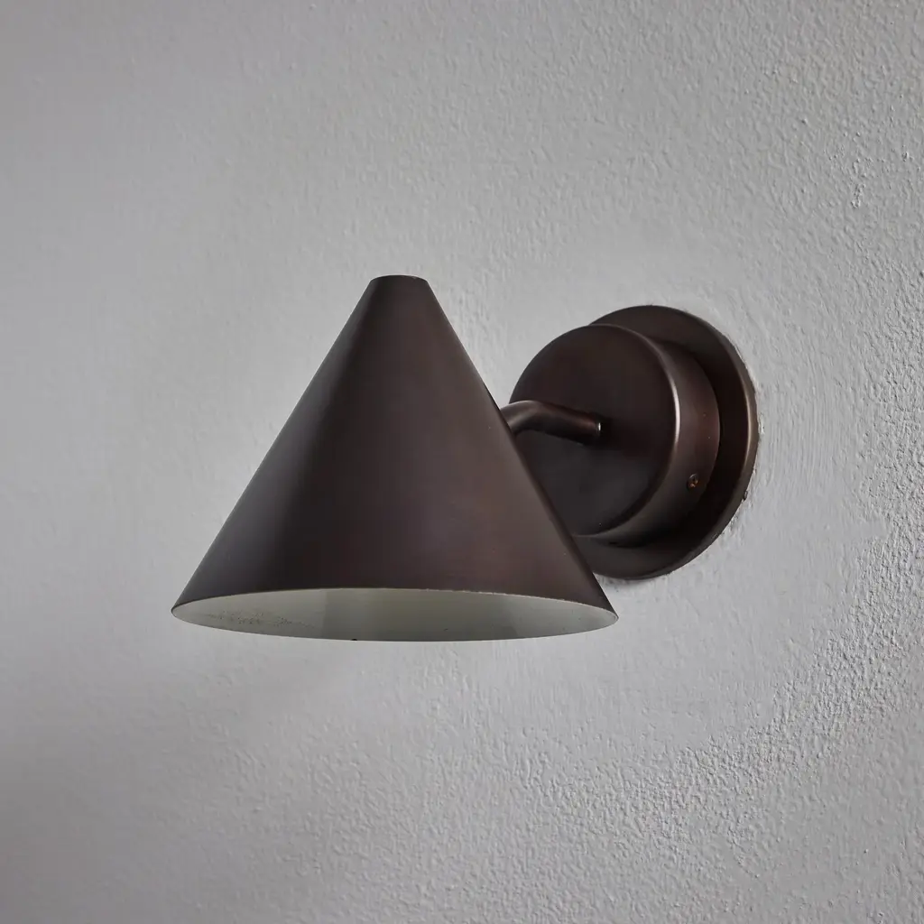 Hans-Agne Jakobsson 'Mini-Tratten' Dark Brown Patinated Outdoor Sconce An exclusive made for U.S. and UL listed authorized re-edition of the classic Swedish design executed in richly patinated metal with white painted interior. An incredibly refined design that is quintessentially Scandinavian. Designed for indoor or outdoor use. Price is per item. Available in unlimited quantities in choice of raw brass, raw copper, verdigris, darkly patinated verdigris, dark brown patinated, and white or black painted metal. Several raw copper & brass lamps in-stock and ready to quick ship. Patinated and painted variants are made to order in approximately 1-2 weeks, but can be expedited for an additional fee. Please note that in-stock inventory availability can change at any time. For time-sensitive orders, kindly inquire prior to purchasing. Authorized re-edition newly produced by Orsjo, Sweden. Professionally rewired for US electrical new bi-pin G4, GX5.3 or G6.35 bulbs with custom modified backplates for mounting over US junction box. Accommodates a single 60W equivalent LED bulb (or 40W halogen). UL listed (including wet location certification). Only one representative example of the patinated lamps is featured in the photos. Please note that the chemical patination process can result in unique variation from lamp to lamp including streaking, flaking, spotting, discoloration, patchiness and other irregularities, including inside the shade. Finish may vary from lamp to lamp, with darker and lighter color variations possible that may differ from the listing photos. Patinas can also change, fade over time and even rub off due to handling, storage, and exposure to the elements, resulting in further variation and irregularities. Patination is a dynamic process which continually evolves in beautifully unpredictable ways to create a unique look with its own special characteristics.