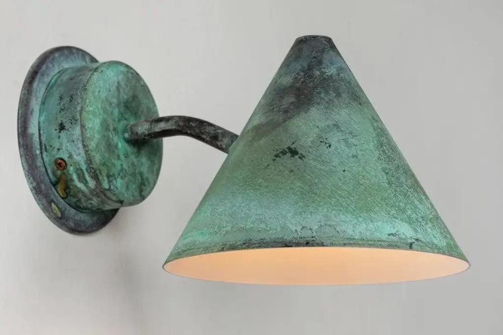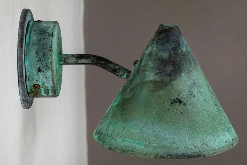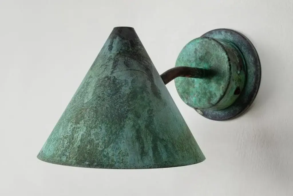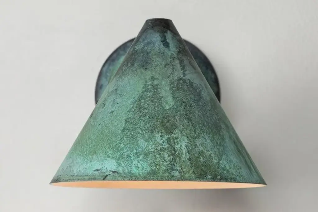 Pair of Hans-Agne Jakobsson 'Mini-Tratten' Verdigris Patinated Outdoor Sconces. An exclusive made for U.S. and UL listed authorized re-edition of the classic Swedish design executed in rich verdigris patination with white painted interior. An incredibly refined design that is quintessentially Scandinavian. Ideal for indoor or outdoor use. Hans-Agne Jakobsson was a Swedish interior and furniture designer that started his career as assistant to Carl Malmsten. In 1951 he founded his company, Hans-Agne Jakobsson AB, in Markaryd. His designs are characterized by his commitment to working with materials that make the light in his objects pleasant and glare-free. This authorized re-edition is newly produced by Örsjö in Sweden, crafted using only the highest quality materials. Price is per pair. Available in unlimited quantities in choice of raw brass, raw copper, verdigris, darkly patinated verdigris, dark brown patinated, and white or black painted metal. Several raw copper & brass lamps in-stock and ready to quick ship. Patinated and painted variants are made to order in approximately 2-3 weeks, but can be expedited for an additional fee. Please note that in-stock inventory availability can change at any time. For time-sensitive orders, kindly inquire prior to purchasing. All sales are final. Professionally rewired for US electrical new bi-pin G4, GX5.3 or G6.35 bulbs with custom modified backplates for mounting over US junction box. UL listed. Only one representative example of the patinated lamps is featured in the photos. Please note that the chemical patination process can result in unique variation from lamp to lamp including streaking, flaking, spotting, discoloration, patchiness and other irregularities including inside the shade. Finish may vary from lamp to lamp, with darker and lighter color variations possible which may differ from the listing photos. Patinas can also change, fade over time and even rub off due to handling and exposure to the elements, resulting in further variation and irregularities. Patination is a dynamic process which continually evolves in beautifully unpredictable ways to create a unique look with its own special characteristics.