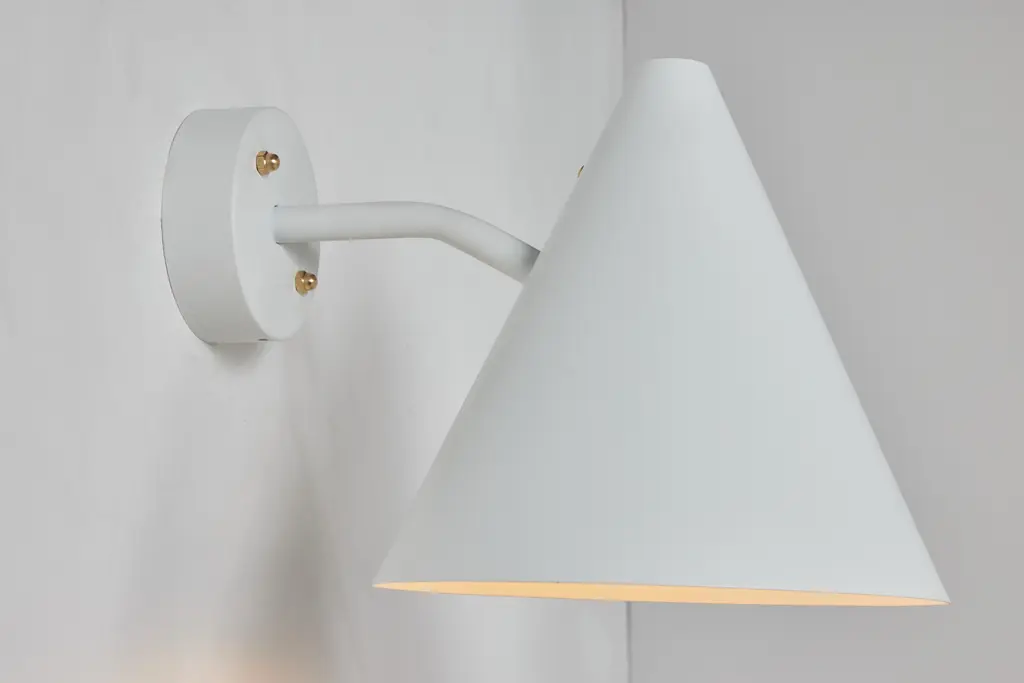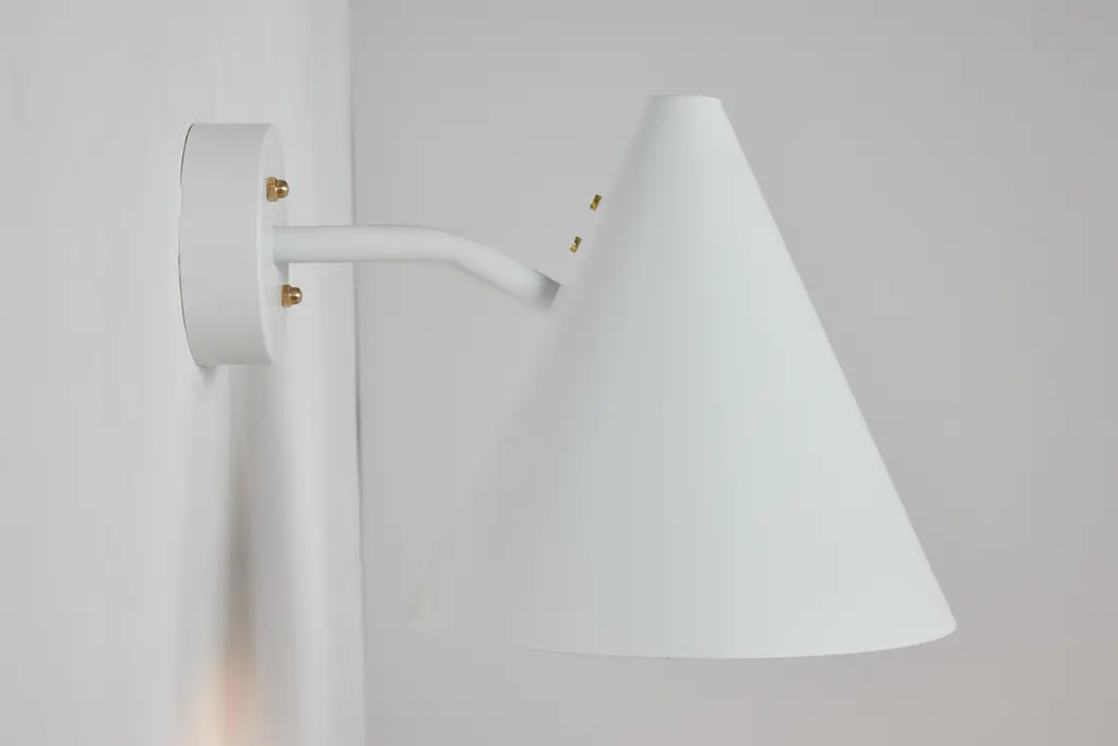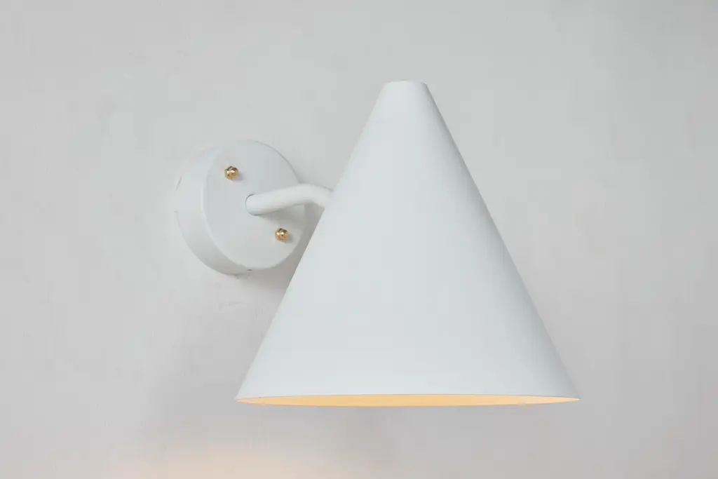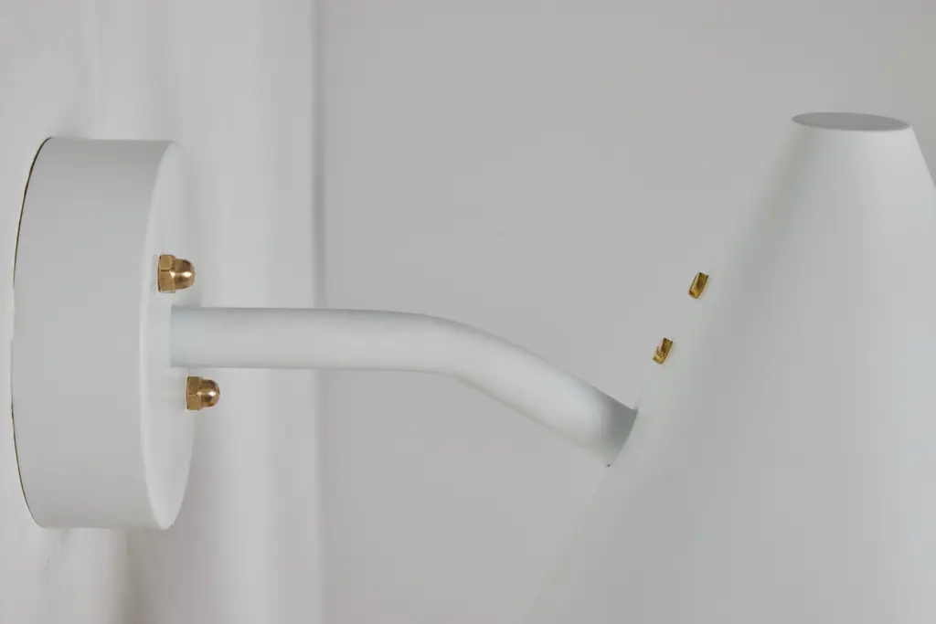 Hans-Agne Jakobsson 'Tratten' outdoor sconce in white. An exclusive made for U.S. and UL listed authorized re-edition of the classic Swedish design executed in white painted metal shade with white painted interior and brass hardware. Suitable for both outdoor or indoor use. Price is per item. Available in unlimited quantities in choice of raw brass, raw copper, verdigris, darkly patinated verdigris, dark brown patinated, and white, black, brown, bronze, silver, or steel painted metal. Several painted variants and raw copper & brass lamps in-stock and ready to quick ship. Patinated and painted variants are made to order in approximately 1-2 weeks, but can be expedited for an additional fee. Please note that in-stock inventory availability can change at any time. For time-sensitive orders, kindly inquire prior to purchasing. Authorized re-edition newly produced by Orsjo, Sweden. Professionally rewired for US electrical with custom modified back plates for mounting over US junction box. Accommodates 1x US standard medium base E26 LED bulb, maximum 100W equivalent (or 60W incandescent). Note that only one representative example is featured in the images. Made to order.