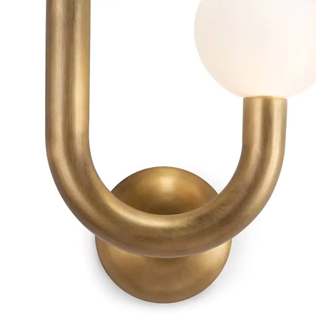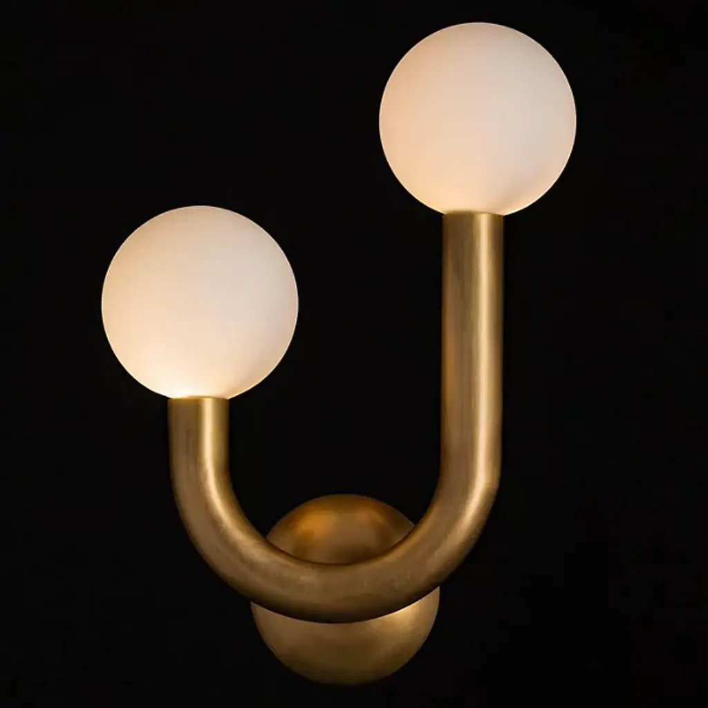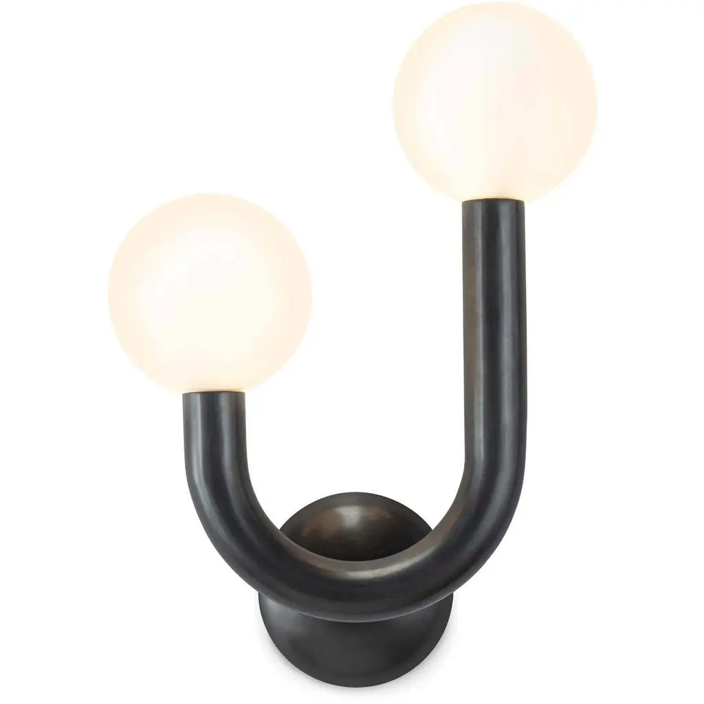 Simple and sleek, the Happy Left Side Wall Sconce from Regina Andrew stands out among your décor with an appealing silhouette. Made of smooth metal, this piece mounts directly to the wall with a round base and features a single thick arm gracefully curved into an imbalanced U-shape. A pair of matte white glass globes rest atop, each holding a single bulb that emits a warm and even layer of light into the space.