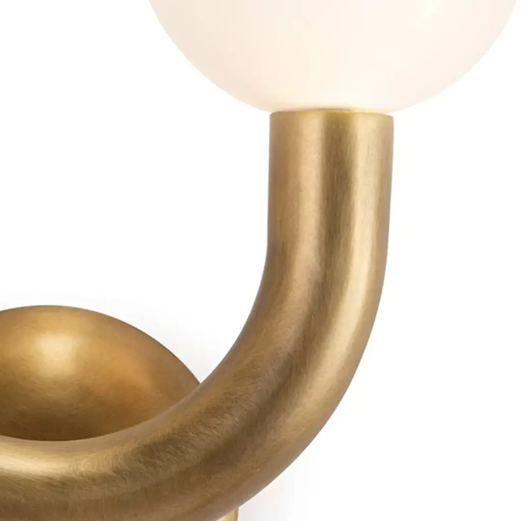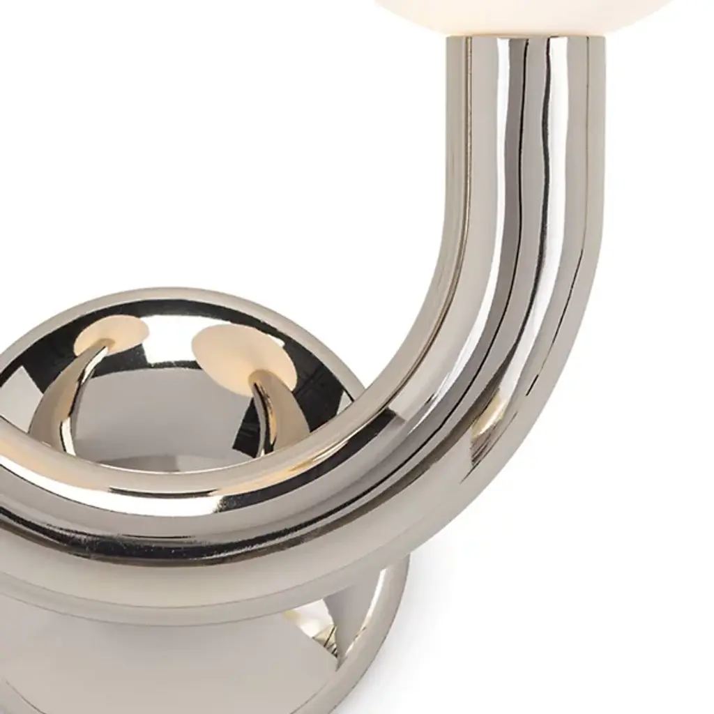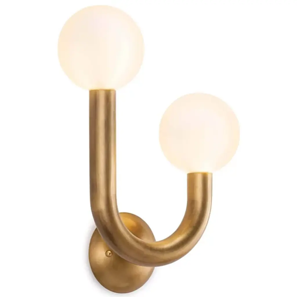 Simple and sleek, the Happy Left Side Wall Sconce from Regina Andrew stands out among your décor with an appealing silhouette. Made of smooth metal, this piece mounts directly to the wall with a round base and features a single thick arm gracefully curved into an imbalanced U-shape. A pair of matte white glass globes rest atop, each holding a single bulb that emits a warm and even layer of light into the space.