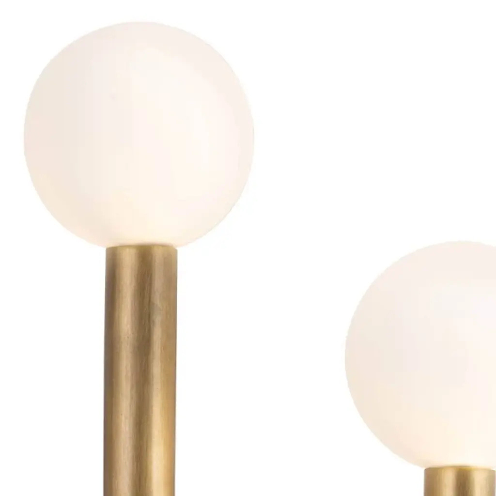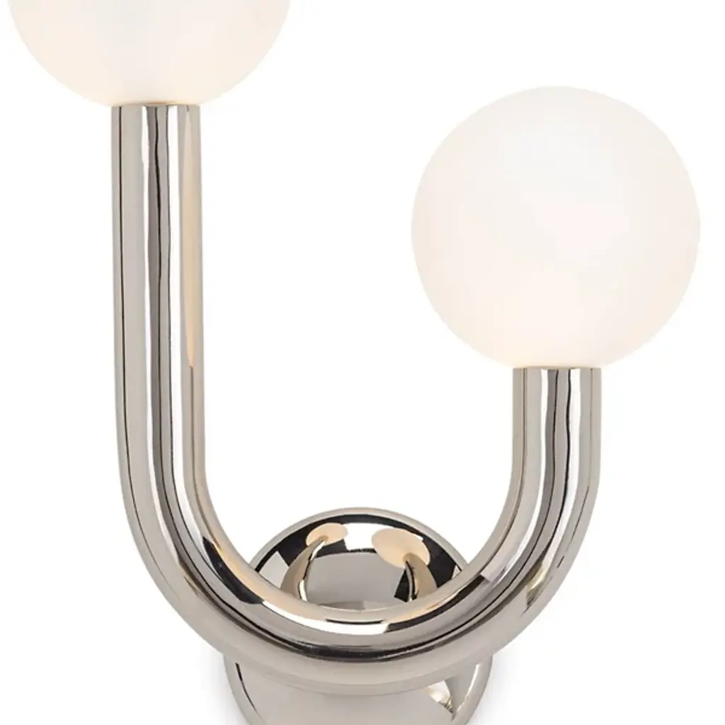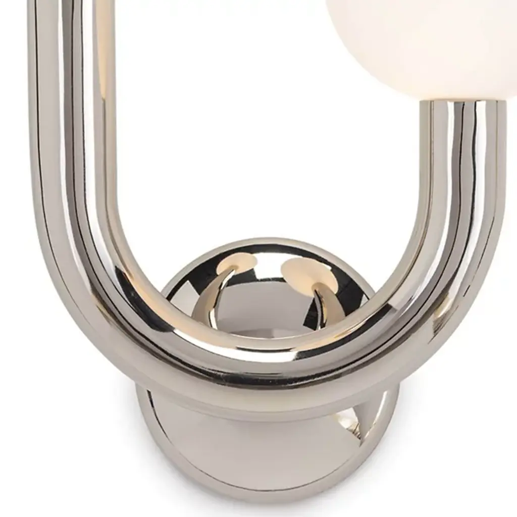 Simple and sleek, the Happy Left Side Wall Sconce from Regina Andrew stands out among your décor with an appealing silhouette. Made of smooth metal, this piece mounts directly to the wall with a round base and features a single thick arm gracefully curved into an imbalanced U-shape. A pair of matte white glass globes rest atop, each holding a single bulb that emits a warm and even layer of light into the space.