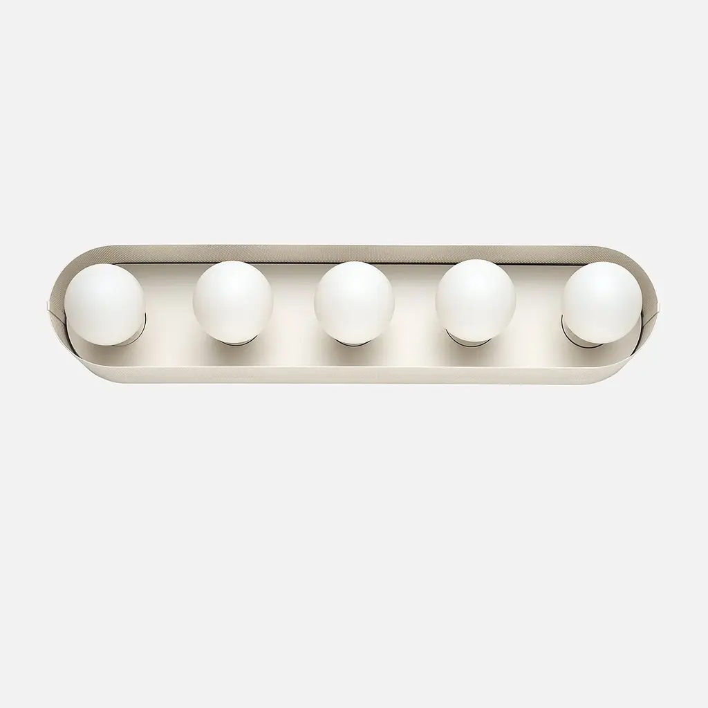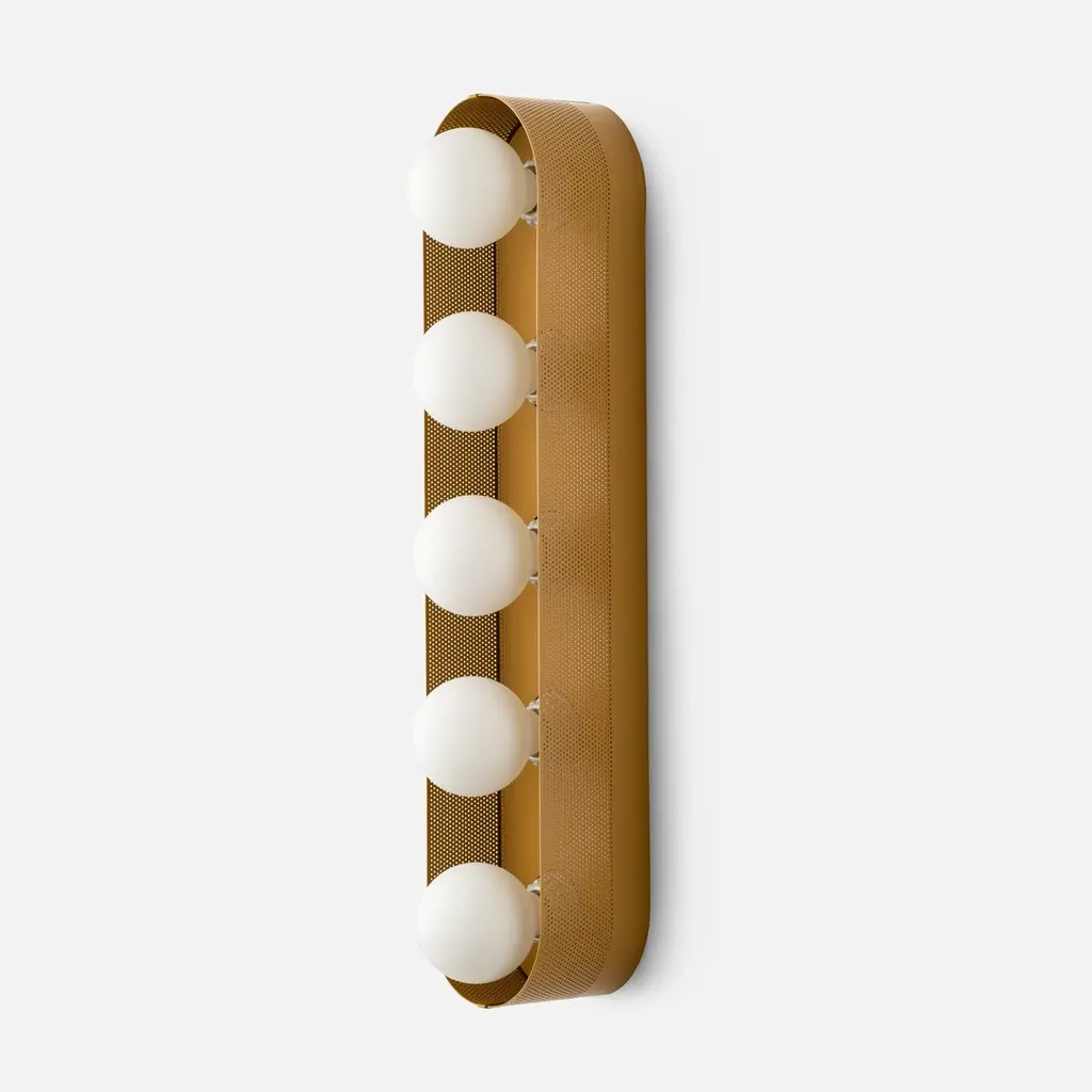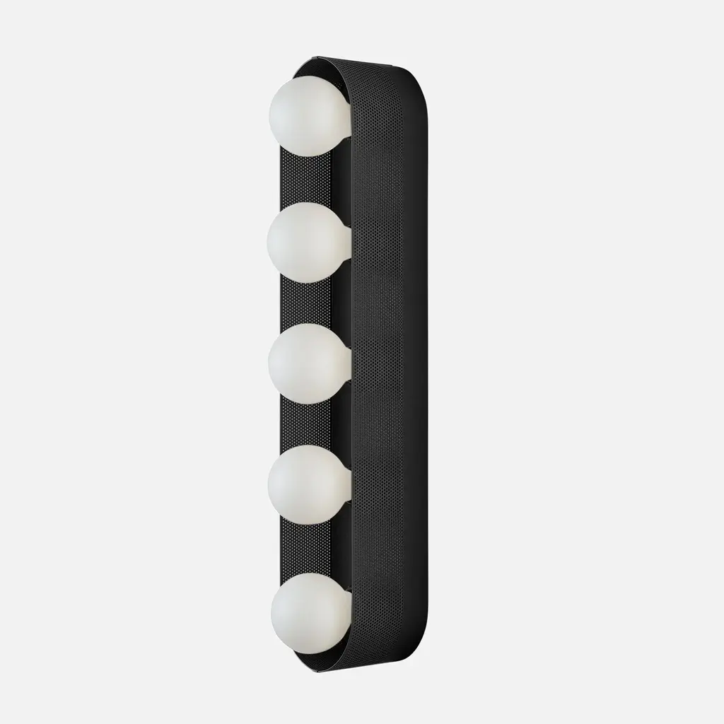 Named after iconic Hollywood actress Jean Harlow, the Harlow 5 Sconce serves as a modern update to the type of multi-bulb vanity fixture that might have illuminated her dressing room. Understated satin finish options complement perforated steel and porcelain sockets. Its unique mounting and wiring system allows for flexible placement over the junction box. Assembled in our Portland, Ore. factory using ethically-sourced domestic and global components. A Schoolhouse Original. Learn how to choose perfect wall sconce placement on our blog.
