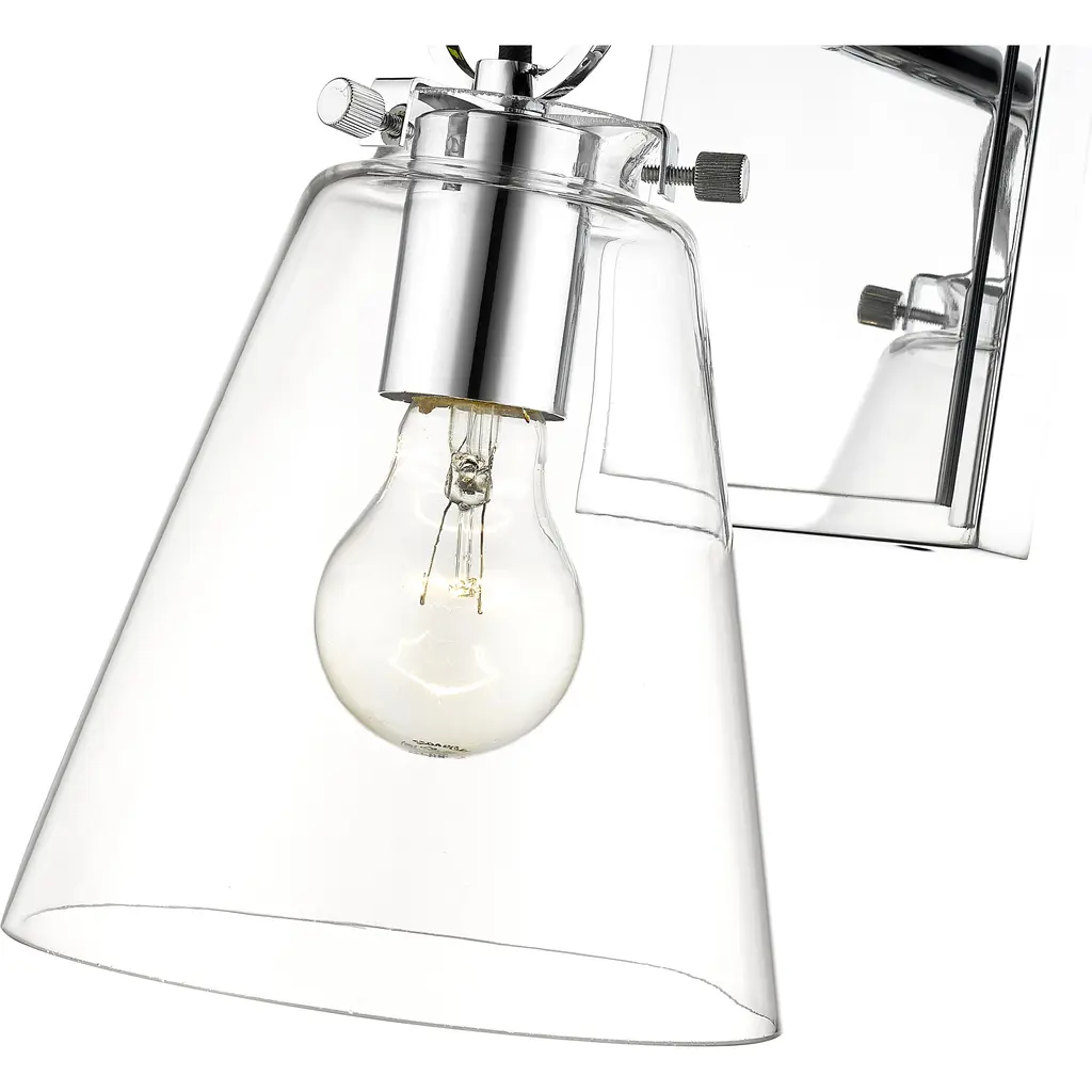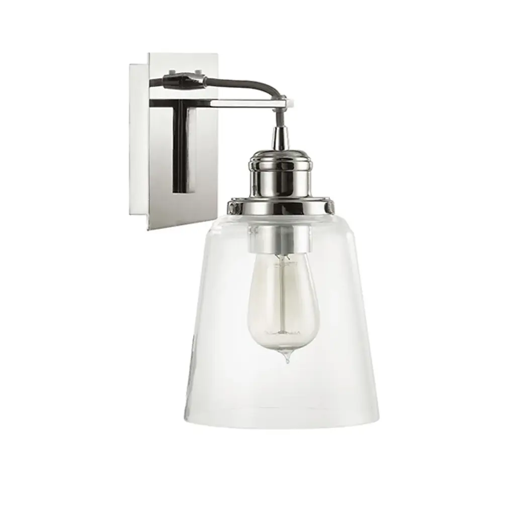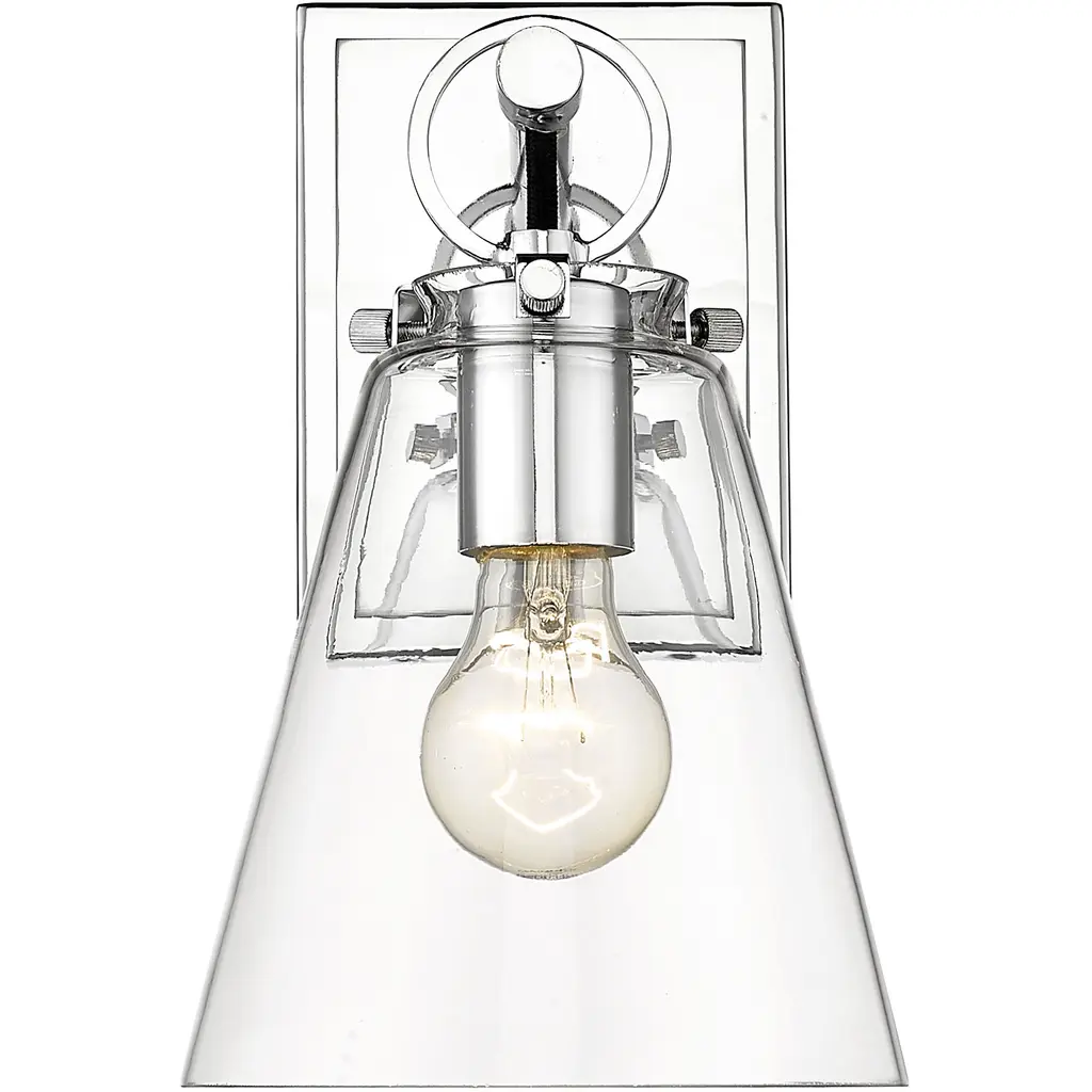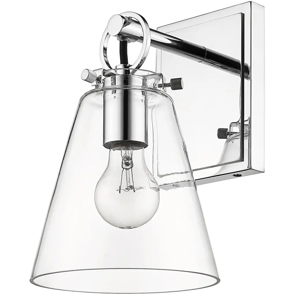 Contemporary bathrooms light up with the chic, delicate design of this one-light wall sconce. With a conical shade crafted of clear glass, it adds a charming motif with a shiny chrome finish hand-tooled steel mount adding festive geometric accents. This light from the Harper collection dazzles in a custom bath space.
