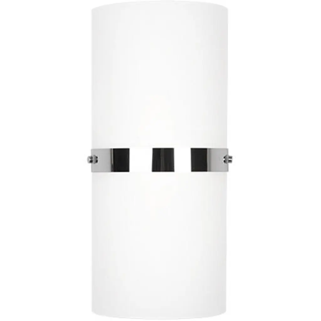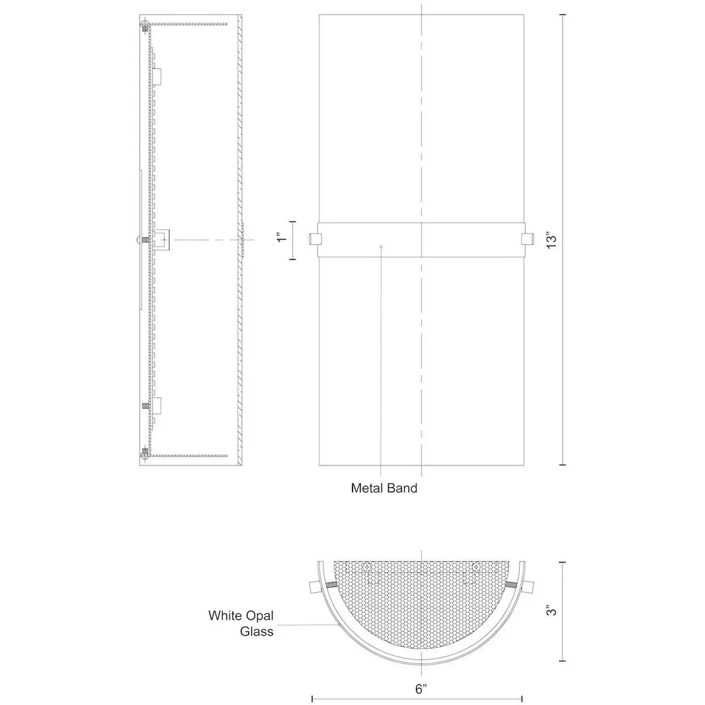 Single LED wall sconce with half cylinder shaped white opal glass and chrome, brushed gold, or black band detail. Equipped with our powerful 120V AC LED technology,