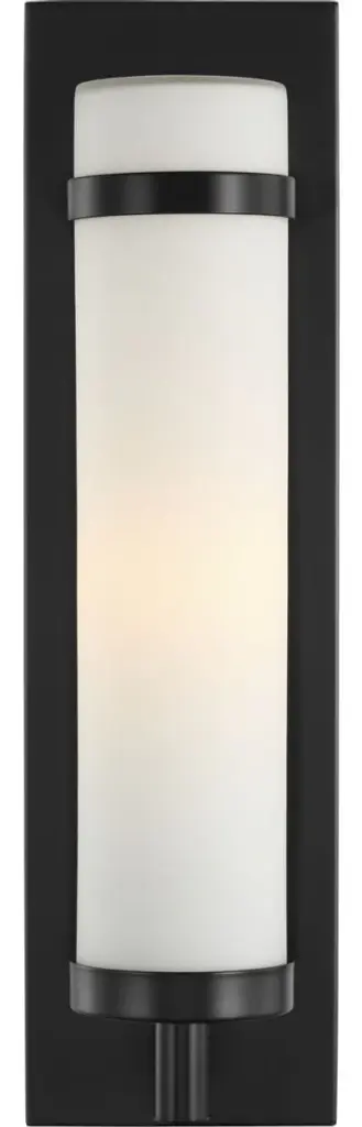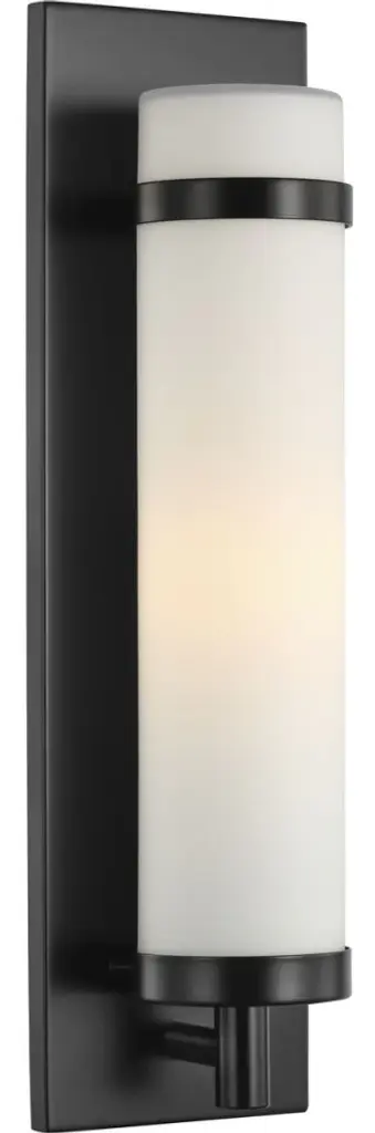 Ease yourself into a state of complete bliss and relaxation under the luxurious glow of this wall sconce. A stunning, cylinder-shaped etched opal glass diffuser held in place by a thin metal bar recalls visions of elegant candlesticks. The diffuser sits on top of a pedestal-like light base attached to a beautiful black backplate.Bulb Type: IncandescentBulb Wattage: 60 WBulb Included: NNumber of Bulbs: 1