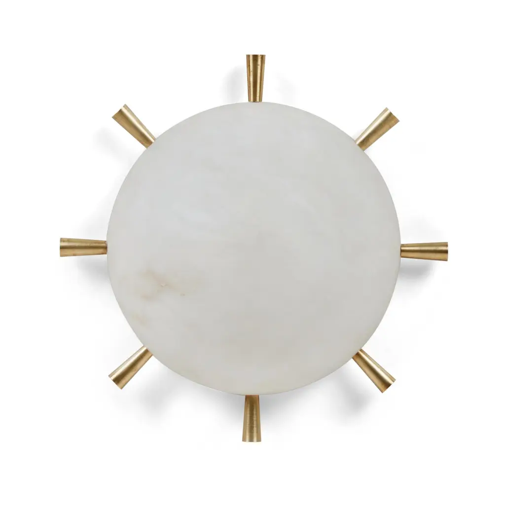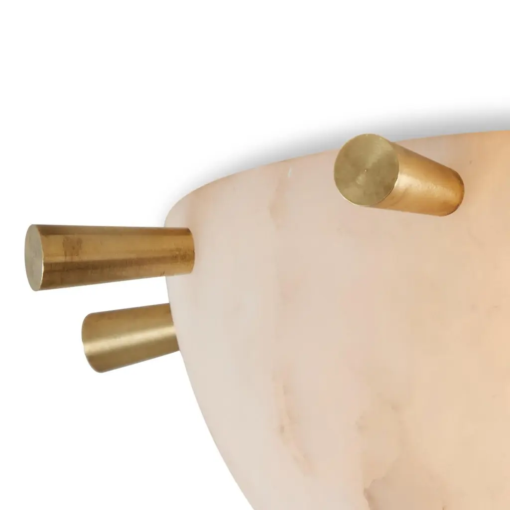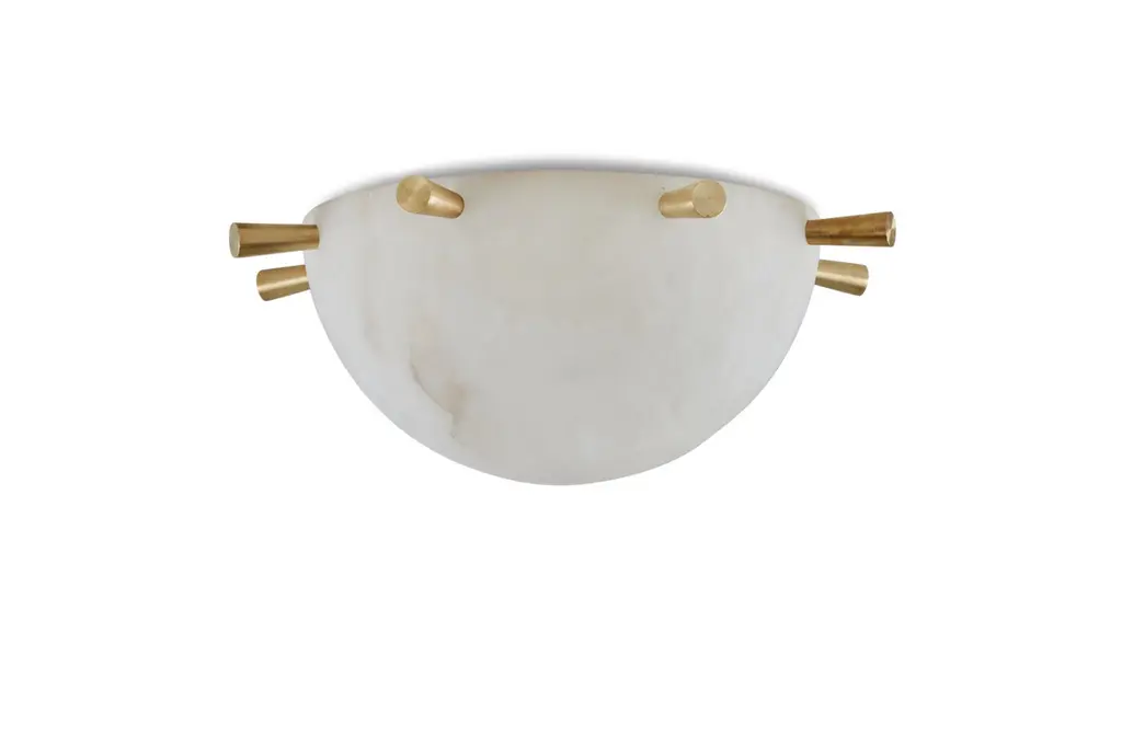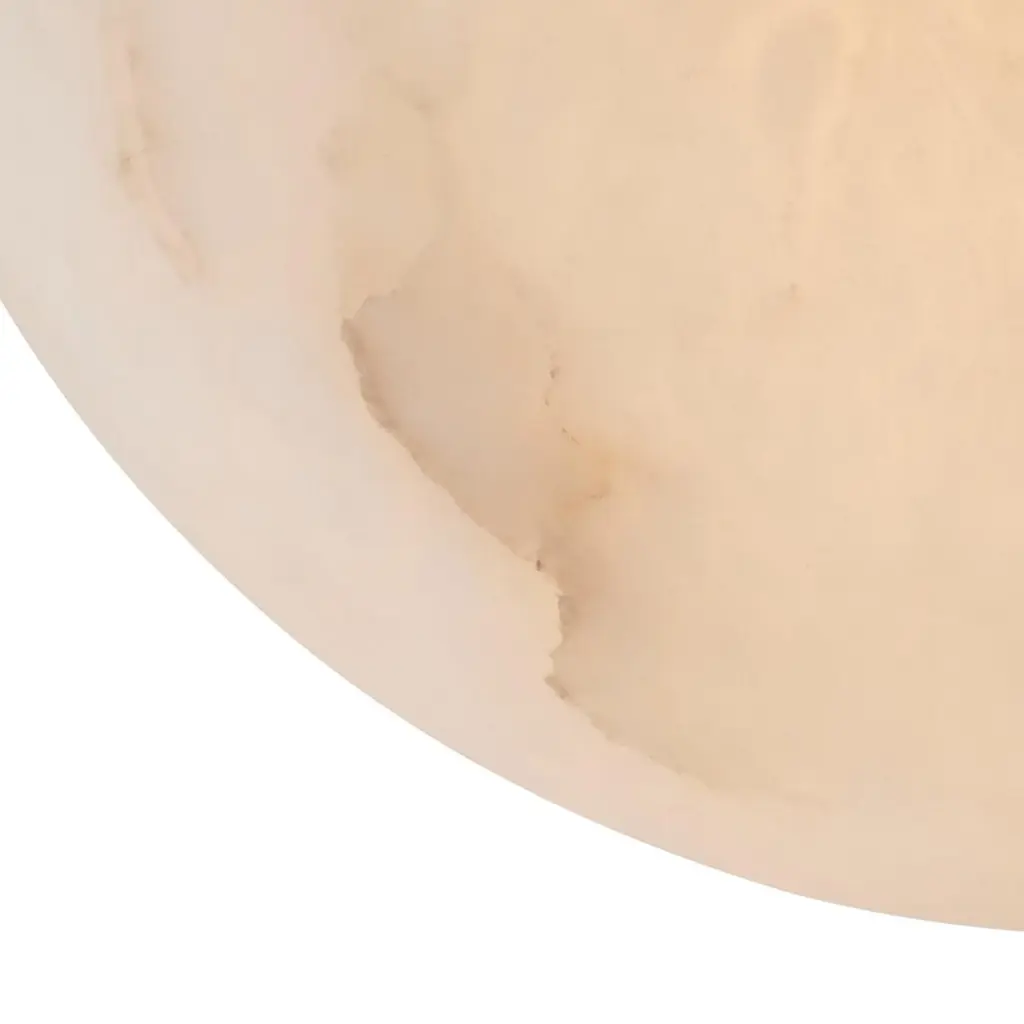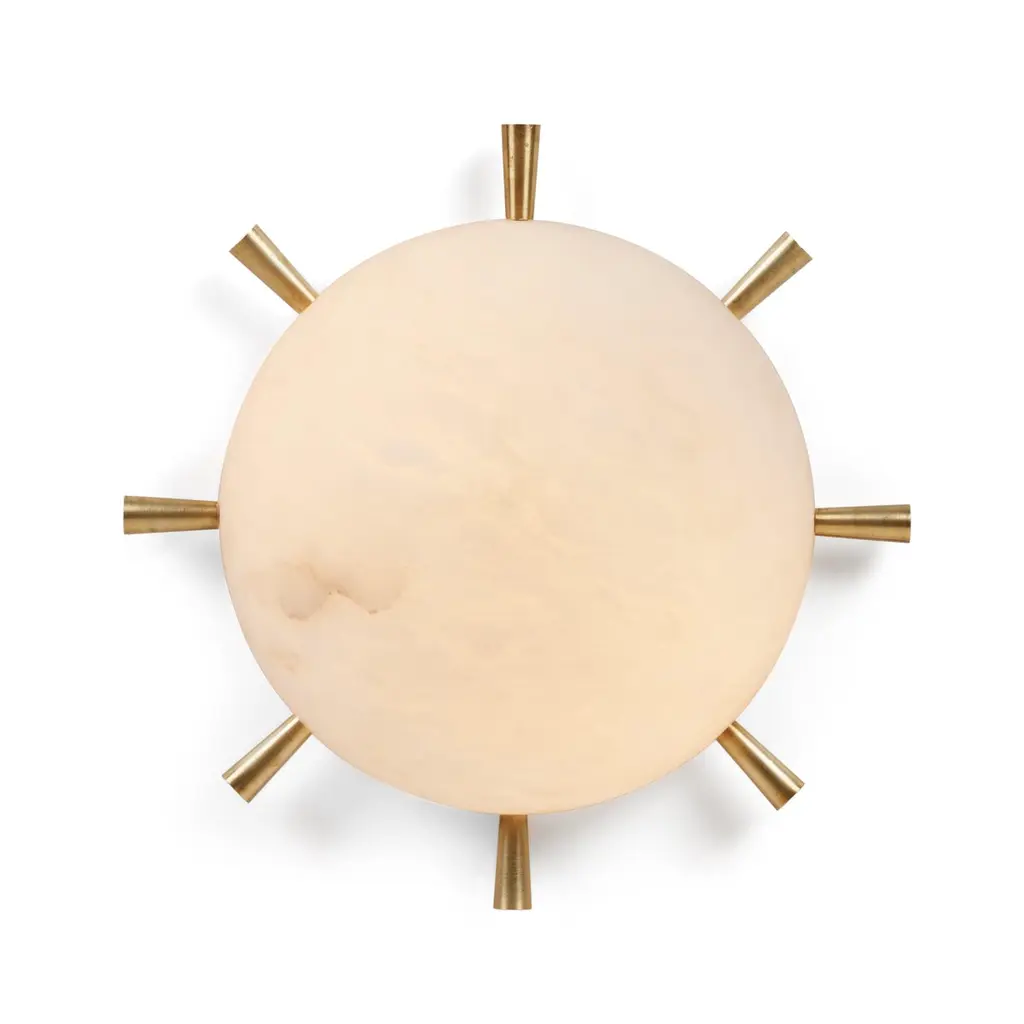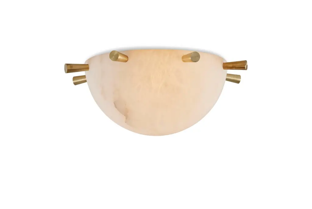 'Hat' Alabaster and Brass Wall or Ceiling Lamp by Denis De La MesiereHandcrafted in Los Angeles in the workshop of noted French designer and antiques dealer Denis de le Mesiere, who meticulously pays homage to the work of Pierre Chareau with scrupulous attention to detail and materials. Executed in the highest quality European alabaster mounted on a minimalist steel bracket with brass accents, this ultra refined design adds a sculptural element and focal point of incomparable beauty. Can be used as a flush mount or sconce.Accommodates 2 x standard candelabra base (e12) LED bulbs and is compatible for hardwiring with US electrical junction boxes. Not UL listed, but recommended UL listing possible from authorized 3rd party vendor upon request for an additional fee. Contact us to facilitate.Price is per item. Available in unlimited quantities. Hardware also available in a choice of 10 finishes for an additional cost, inquire for details. This listing is for the 'Hat' wall or ceiling lamp with brass hardware. Alabaster sphere measures 11" in diameter; total diameter with hardware 14.5".Please note that alabaster can vary from item to item due to the organic nature of the material.Handmade to order in Los Angeles. All sales are final.
