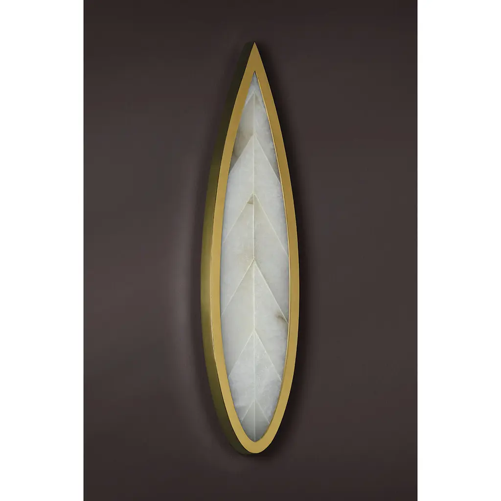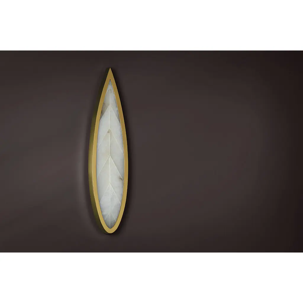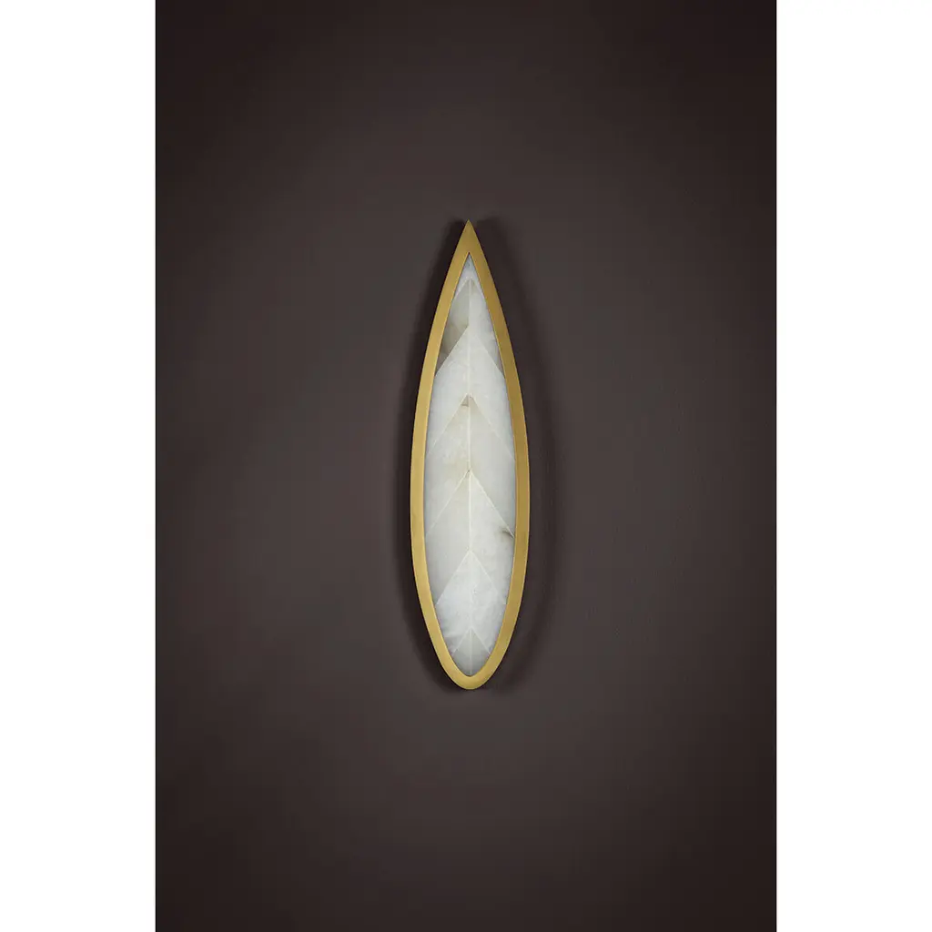 An alabaster shade is wrapped in an elongated teardrop frame of Vintage Brass making this understated sconce feel elegant and glamourous. The slim profile makes it an ideal choice for lighting hallways and powder rooms.