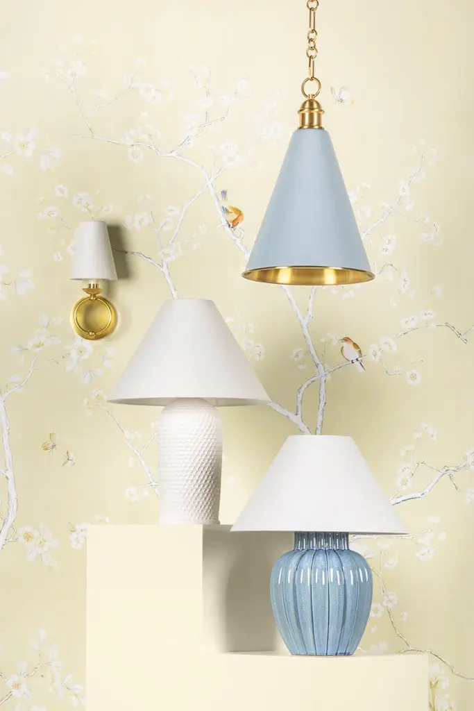 Clean and classic, Haverford has traditional appeal, with crisp white linen shades, streamlined candlesticks, and equestrian-inspired ring details. The chandelier's finish mix of Texture Black and Aged Brass adds elegance over the dining table and the Aged Brass sconce brings a warmth to walls throughout the home. Part of our Ariel Okin x Mitzi Tastemakers collection.