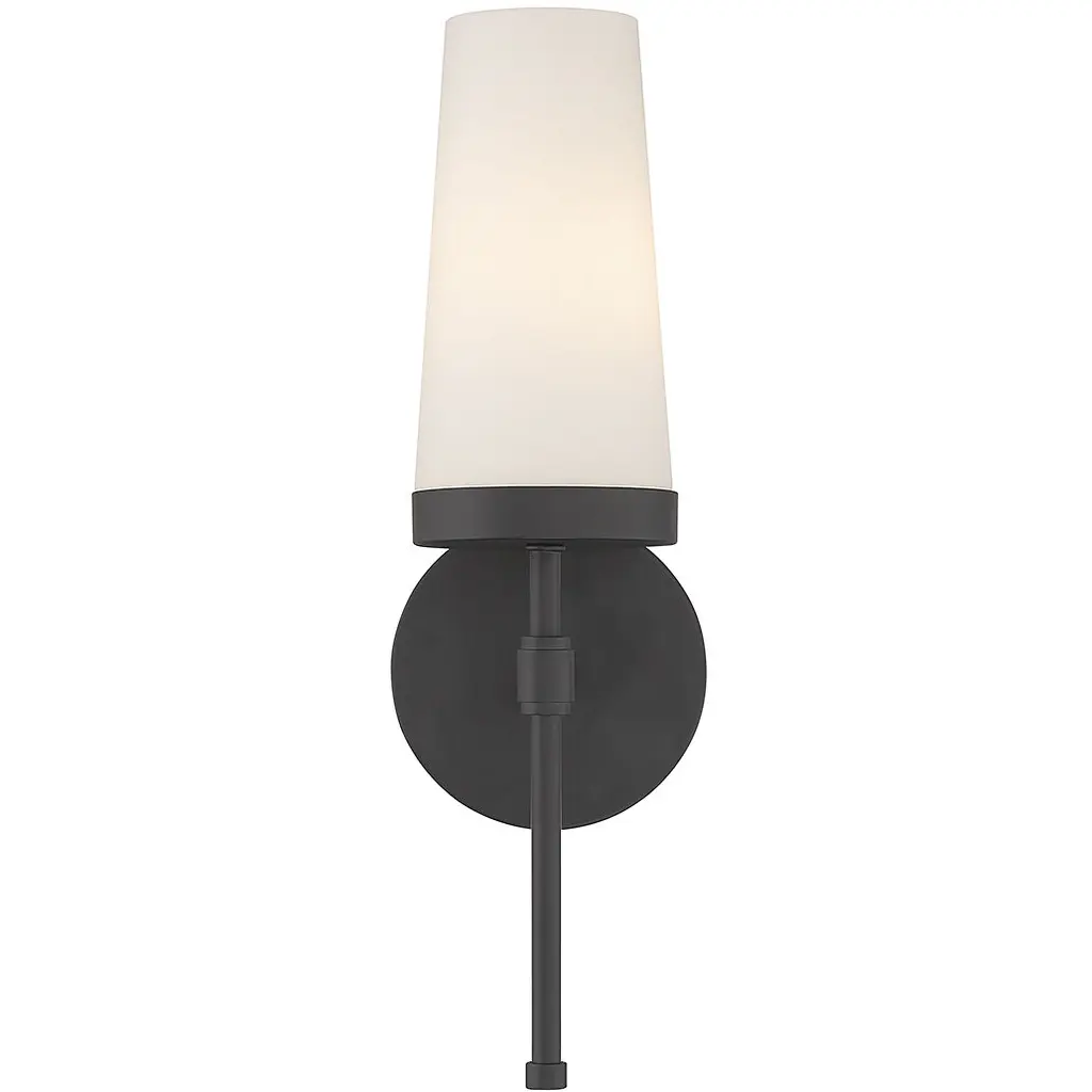 Whether you want to illuminate a bath vanity mirror, light the way down a hallway or perk up the kitchen, the classic Savoy House Haynes 1-light sconce is a great choice. Its tall, tapered white opal glass shade creates a bright yet comfortable glow. The matte black finish goes with anything. Haynes is 16" in height, 5" in width and extends 7" from the wall. It uses 1 candelabra size bulb with a max of 60 watts (bulb not included).