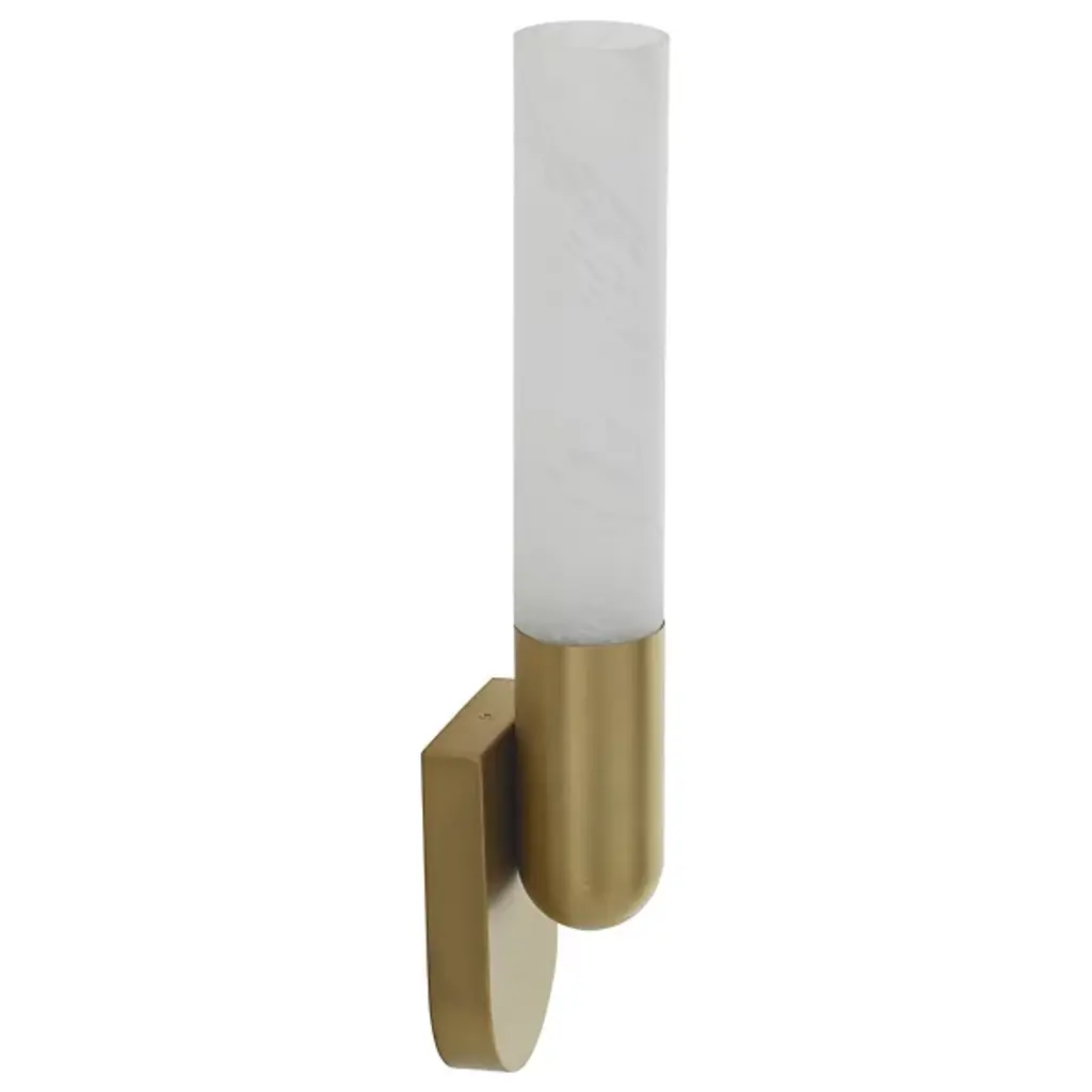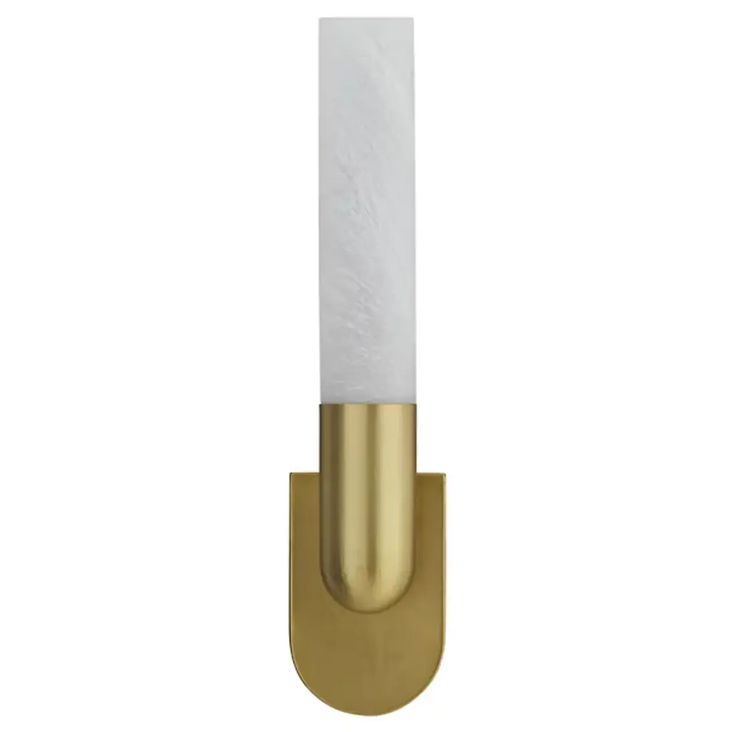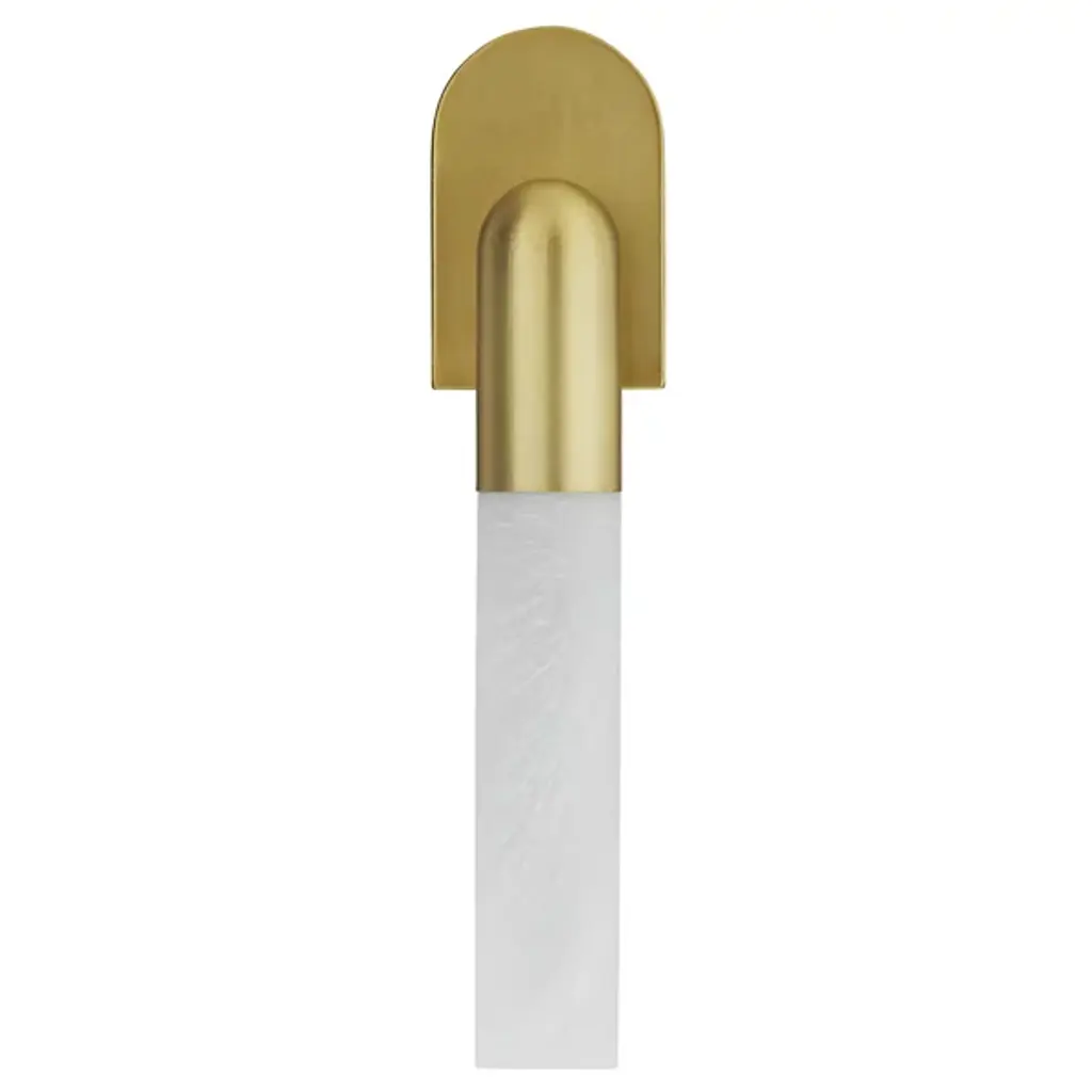 The Haynes LED Wall Sconce from Arteriors makes a confident statement with its spear-shaped backplate and streamlined design. The steel construction supports an alabaster shade that can be mounted to direct light upward or downward, offering flexibility in installation. This integrated LED fixture brings a substantial presence to hallways and bathrooms while maintaining clean lines. Its versatile scale works equally well as a single accent or paired in multiples along a corridor. Suitable for covered outdoor spaces, this sconce adds character to both contemporary and mid-century modern interiors.
