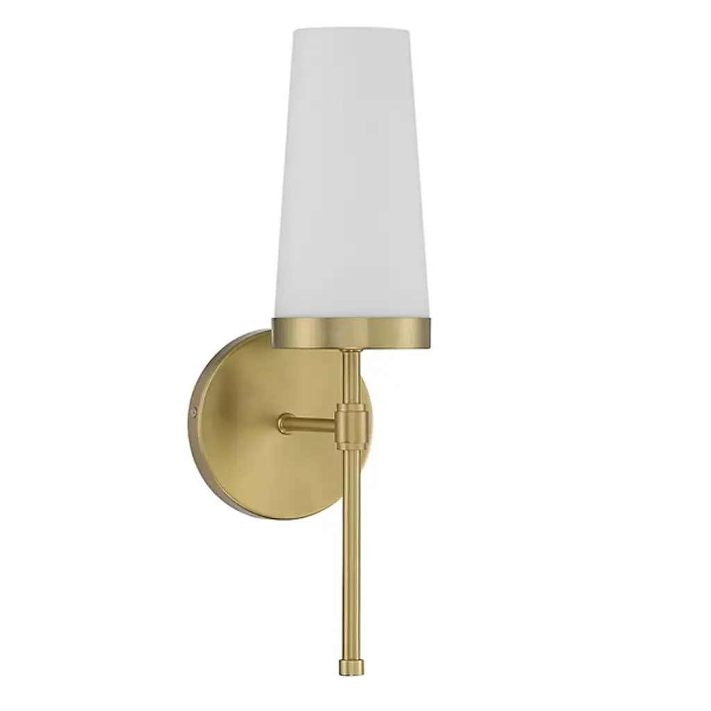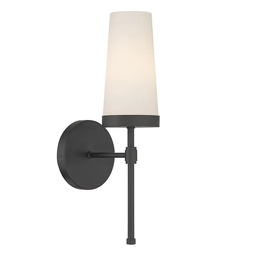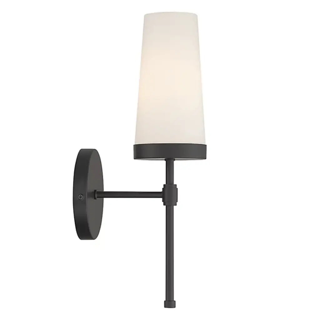 The Haynes Wall Sconce by Savoy House adds a touch of transitional refinement beside your bed or favorite reading nook. This light fixture features a vertical arm that’s secured by a round metal backplate. At the end, a tapered rectangle shade of white opal glass tempers the light of an LED. The soft, ambient glow is suited for illuminating bedside tables or flanking a sofa. This wall sconce brings a sophisticated aesthetic to your décor.