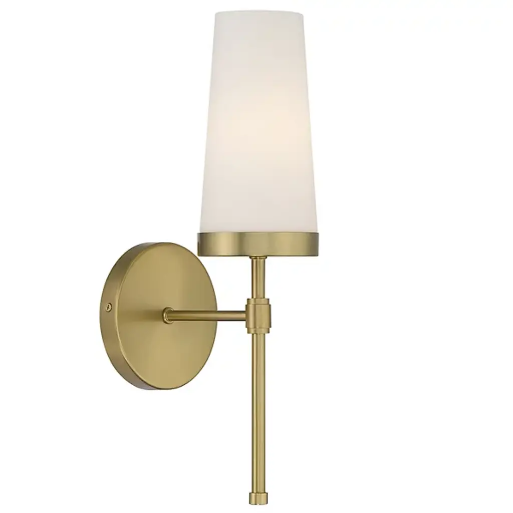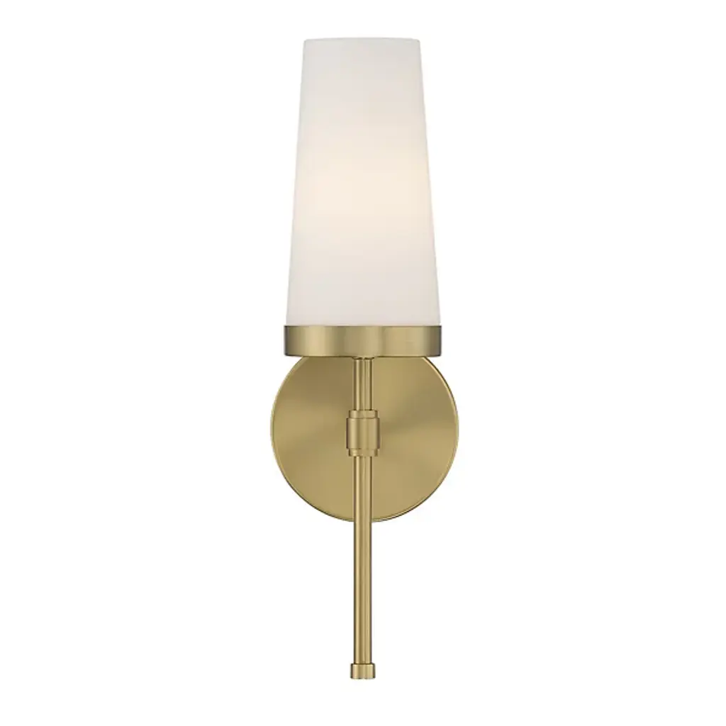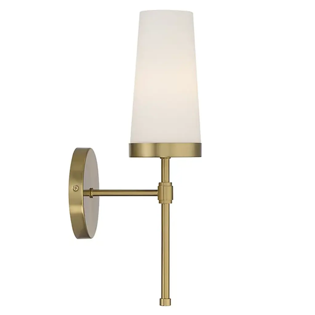 The Haynes Wall Sconce by Savoy House adds a touch of transitional refinement beside your bed or favorite reading nook. This light fixture features a vertical arm that’s secured by a round metal backplate. At the end, a tapered rectangle shade of white opal glass tempers the light of an LED. The soft, ambient glow is suited for illuminating bedside tables or flanking a sofa. This wall sconce brings a sophisticated aesthetic to your décor.
