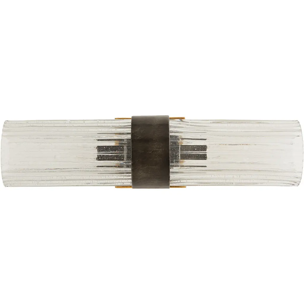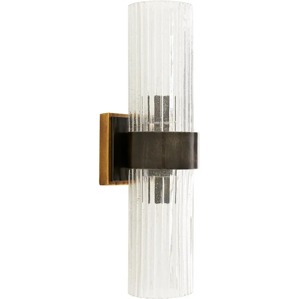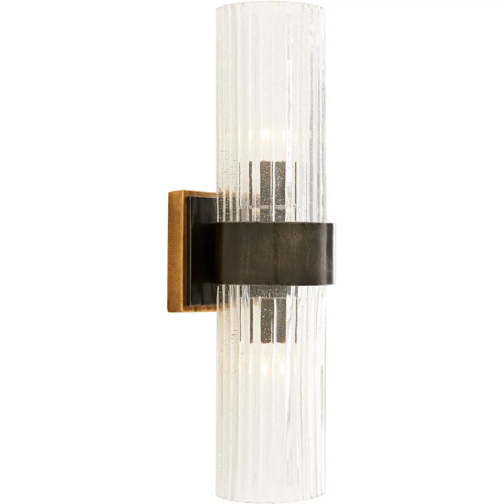 Classic and contemporary, the Hazel makes a subtle yet sophisticated statement in a space. Fluted clear seedy glass is cut at an angle for an unexpected update to its simple form, while an antique brass backplate stairsteps its way up to a solid natural iron band that centers this piece. Perfect for a powder room. Hang vertically for a more traditional look or horizontally over a powder room mirror. Finish will vary. Damp rated, though limited outdoor conditions may affect finish.