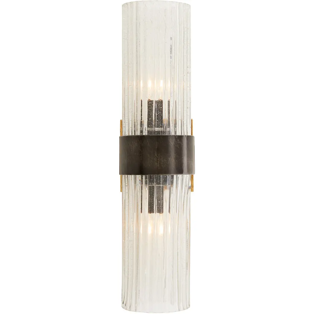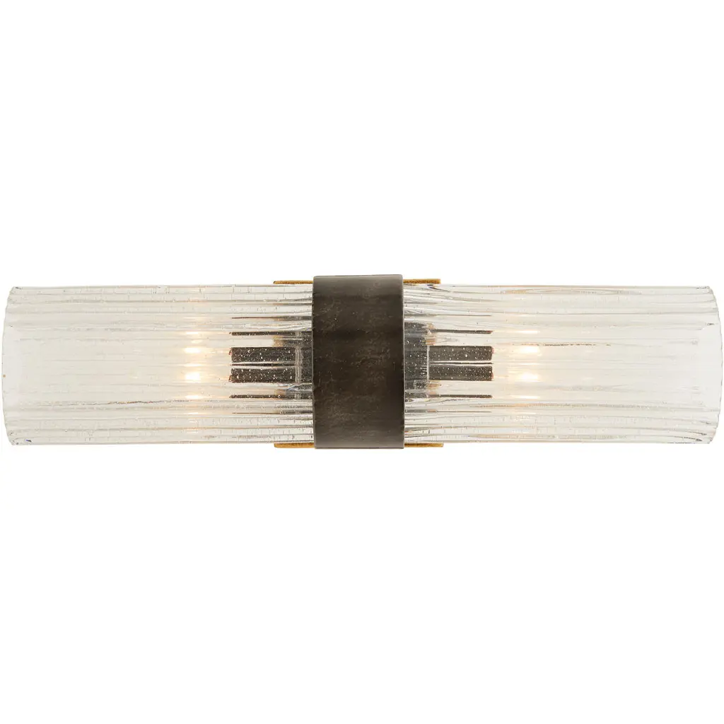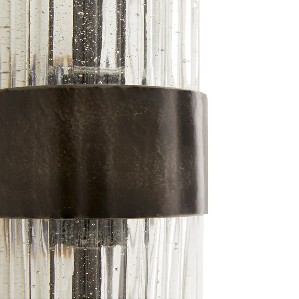 Classic and contemporary, the Hazel makes a subtle yet sophisticated statement in a space. Fluted clear seedy glass is cut at an angle for an unexpected update to its simple form, while an antique brass backplate stairsteps its way up to a solid natural iron band that centers this piece. Perfect for a powder room. Hang vertically for a more traditional look or horizontally over a powder room mirror. Finish will vary. Damp rated, though limited outdoor conditions may affect finish.