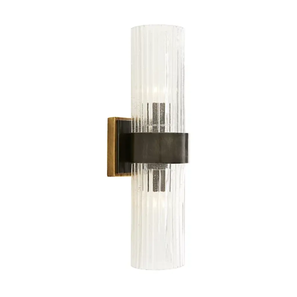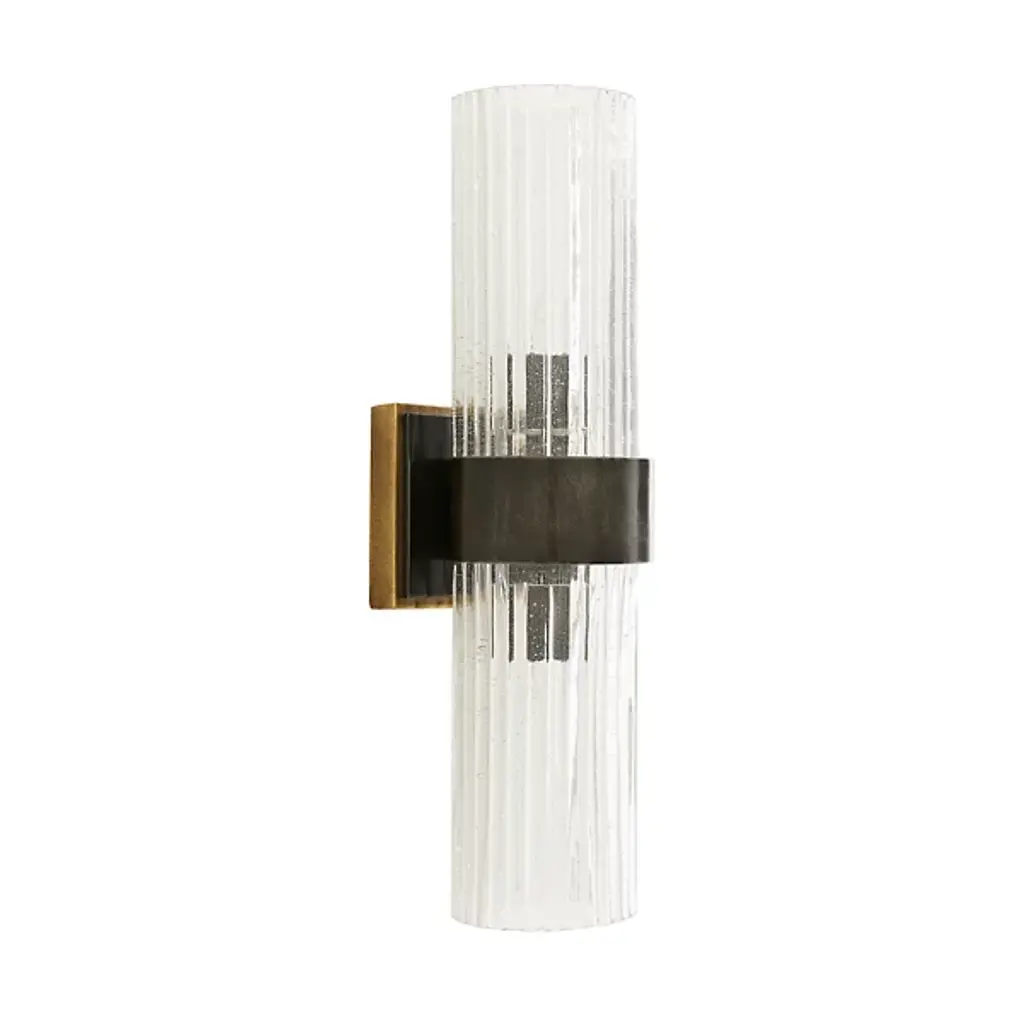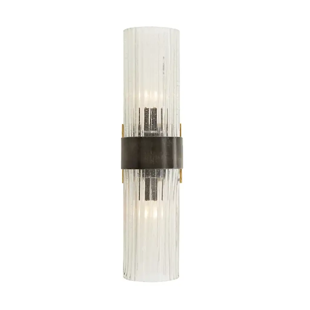Accent your wall and hallway spaces with the tasteful combination of contemporary and classic design showcased by the Hazel Wall Sconce from Arteriors. A sleek square wall plate adheres the fixture to its mounting surface, extending double-sided lamping in a linear arrangement that can be arranged vertically or horizontally depending on your decorative needs. A sleek collar of robust iron encircles the damp-rated lamping, securing a cylindrical shade of clear seeded glass with a ribbed texture around it that reduces bright glare from the sides, exchanging it for a warmer wash of ambient light.