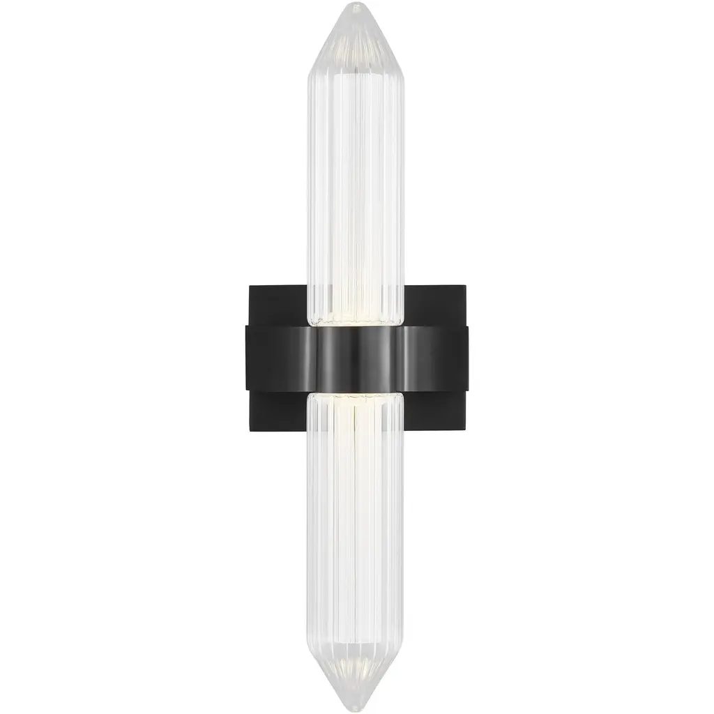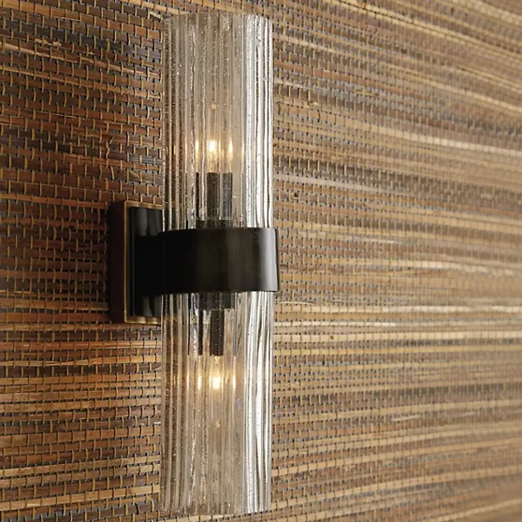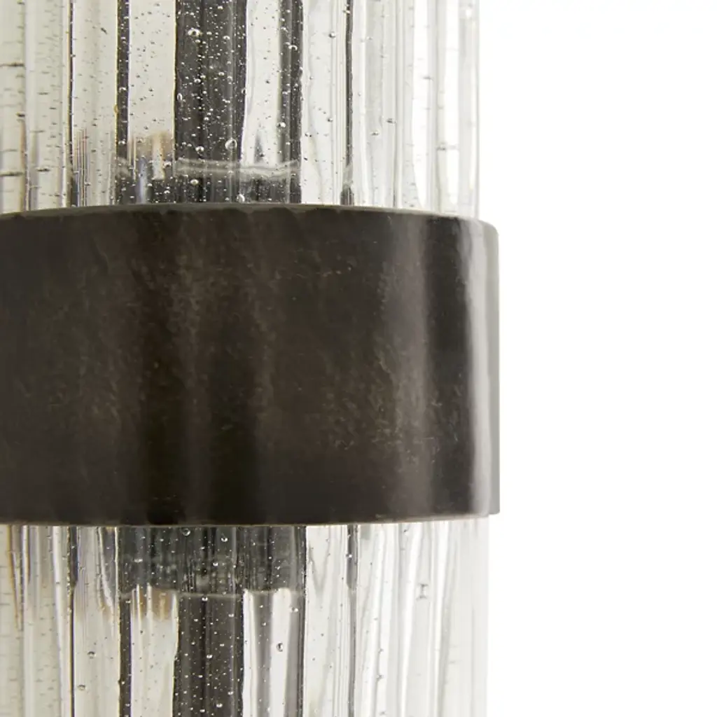 Accent your wall and hallway spaces with the tasteful combination of contemporary and classic design showcased by the Hazel Wall Sconce from Arteriors. A sleek square wall plate adheres the fixture to its mounting surface, extending double-sided lamping in a linear arrangement that can be arranged vertically or horizontally depending on your decorative needs. A sleek collar of robust iron encircles the damp-rated lamping, securing a cylindrical shade of clear seeded glass with a ribbed texture around it that reduces bright glare from the sides, exchanging it for a warmer wash of ambient light.